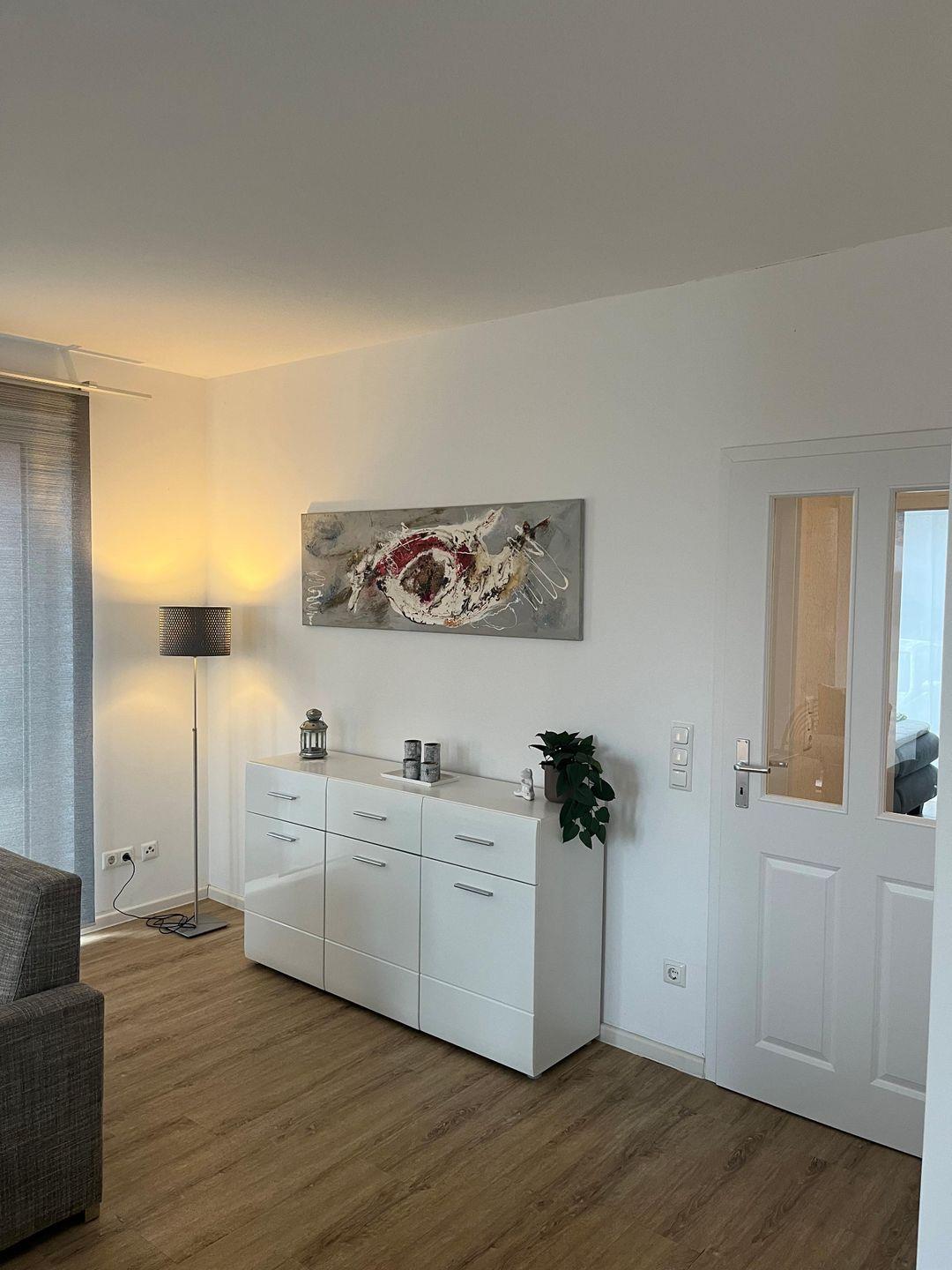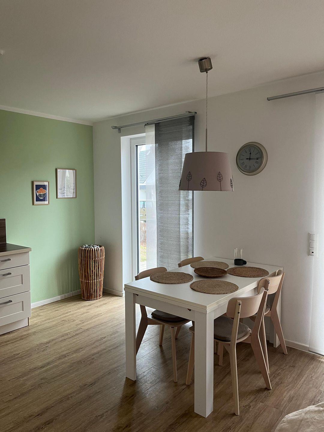 Lichtdurchflutete und elegant eingerichtete 3-Zimmer-Ferienwohnung im Erdgeschoss des Hauses bietet ein komfortables Wohnambiente für Gäste, die Wert auf Ruhe und Stil legen. Die Wohnung verfügt über zwei gemütliche Schlafzimmer und einen großzügigen Wohnbereich, der durch eine offene, modern ausgestattete Küche mit Essbereich ergänzt wird. Der Wohnbereich ist mit einer komfortablen Sitzecke und einem TV ausgestattet und bildet den idealen Mittelpunkt für gesellige Stunden oder entspannte Abende.