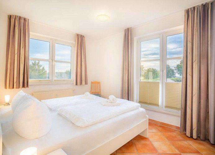 Die Ferienwohnung verfügt über zwei separate Schlafzimmer. Im größeren Schlafzimmer erwarten Sie ein Doppelbett, ein großer Kleiderschrank und ein herrlicher Blick auf das Salzhaff.