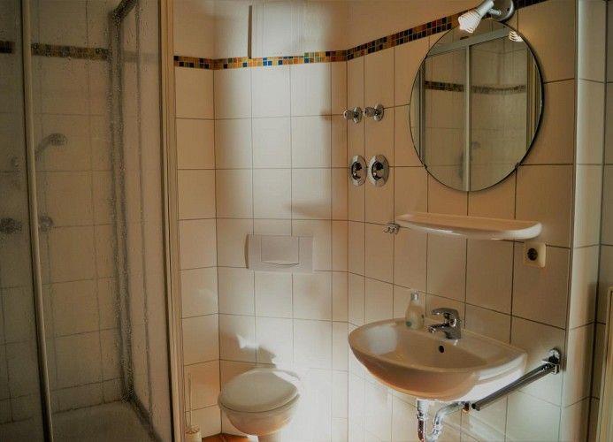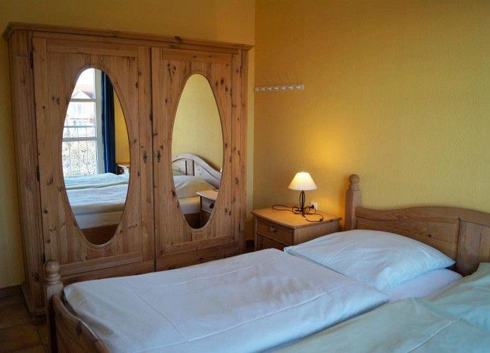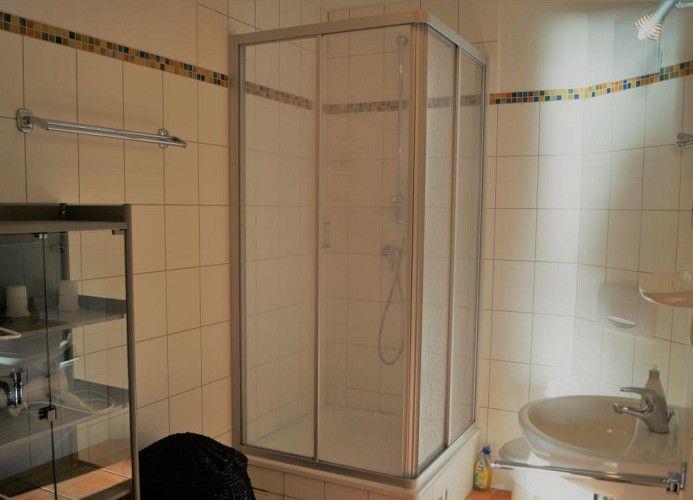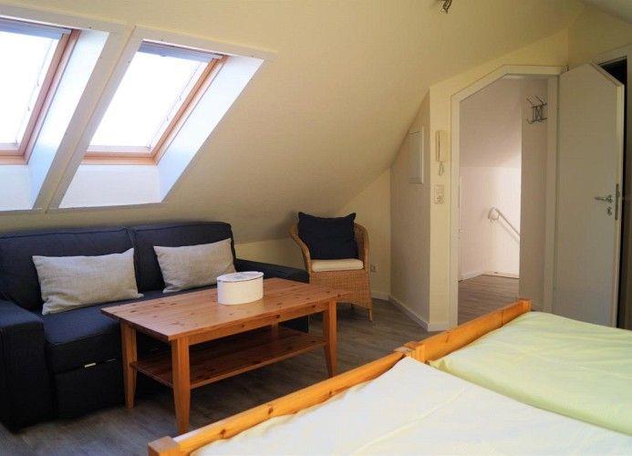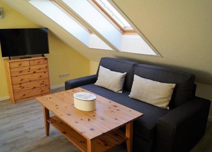 Im unteren Bereich des Apartments befinden sich der geräumige Wohnbereich mit Sitz- und Essecke sowie die integrierte Einbauküche. Es gibt hier zwei separate Schlafzimmer sowie ein Bad mit Dusche und WC. Vom Flur aus führt eine Treppe in den oberen Wohnbereich. Hierbei handelt es quasi um ein eigenes kleines Apartment mit Wohn- / Schlafzimmer sowie einem eigenen Duschbad. In der Wohnung sind auch zwei TV-Geräte vorhanden. So können auch unterschiedliche Programme geschaut werden.