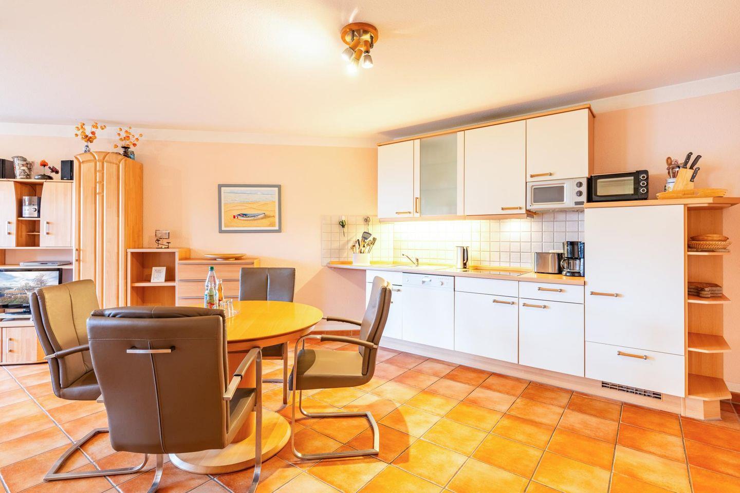 Das Wohnzimmer lädt mit seiner gemütlichen Sitzeckezum Fernsehen, Lesen oder auch nur zum Träumen ein : auch von hier aus können Sie einen seitlichen Blick auf das Salzhaff "erhaschen". Die Küche ist im Wohnraum integriert und voll ausgestattet.