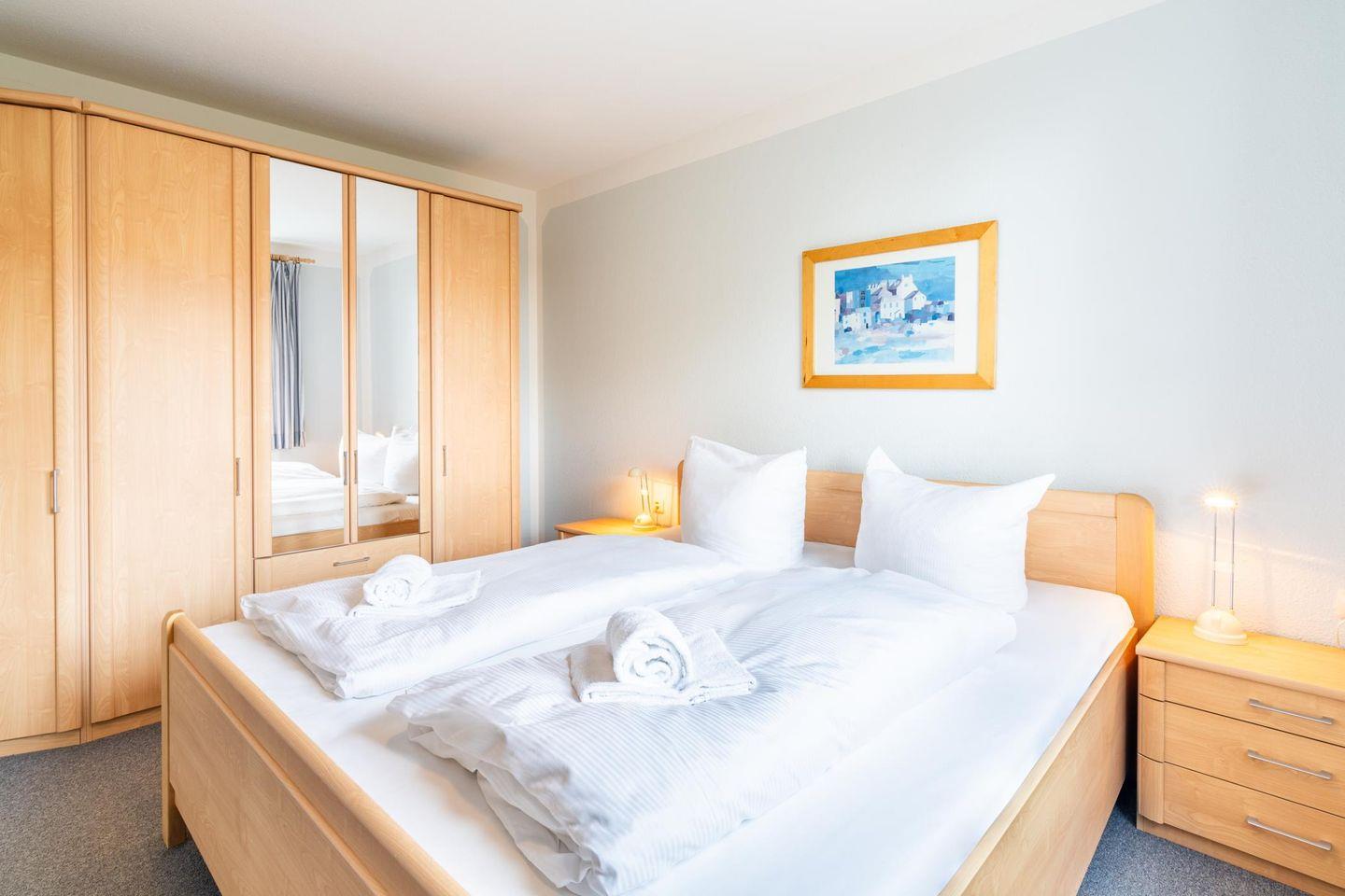 Die Schlafräume verfügen über ein bequemes Doppelbett (1,80 er Breite) bzw. über ein Einzelbett, das zu einem Doppelbett umfunktioniert werden kann. Im Wohnbereich befindet sich eine Couch mit Schlaffunktion (1,40 er Breite) für den fünften Gast.
