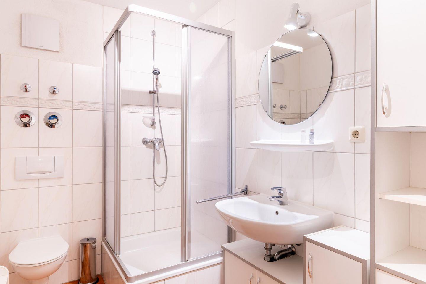 Das Badezimmer mit schöner Dusche, Waschbecken und WC rundet diese schöne Ferienwohnung ab.