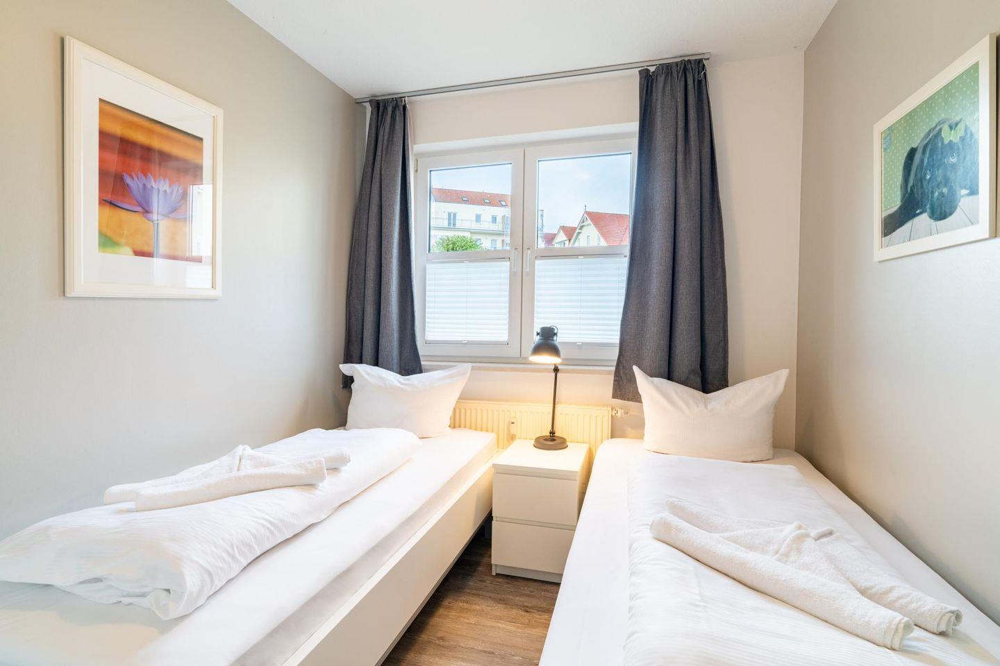 Es gibt ein separates Schlafzimmer mit Doppelbett und eins mit zwei Einzelbetten.