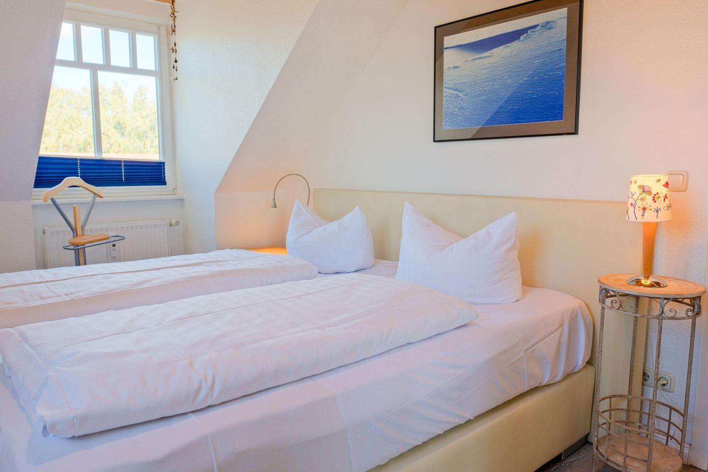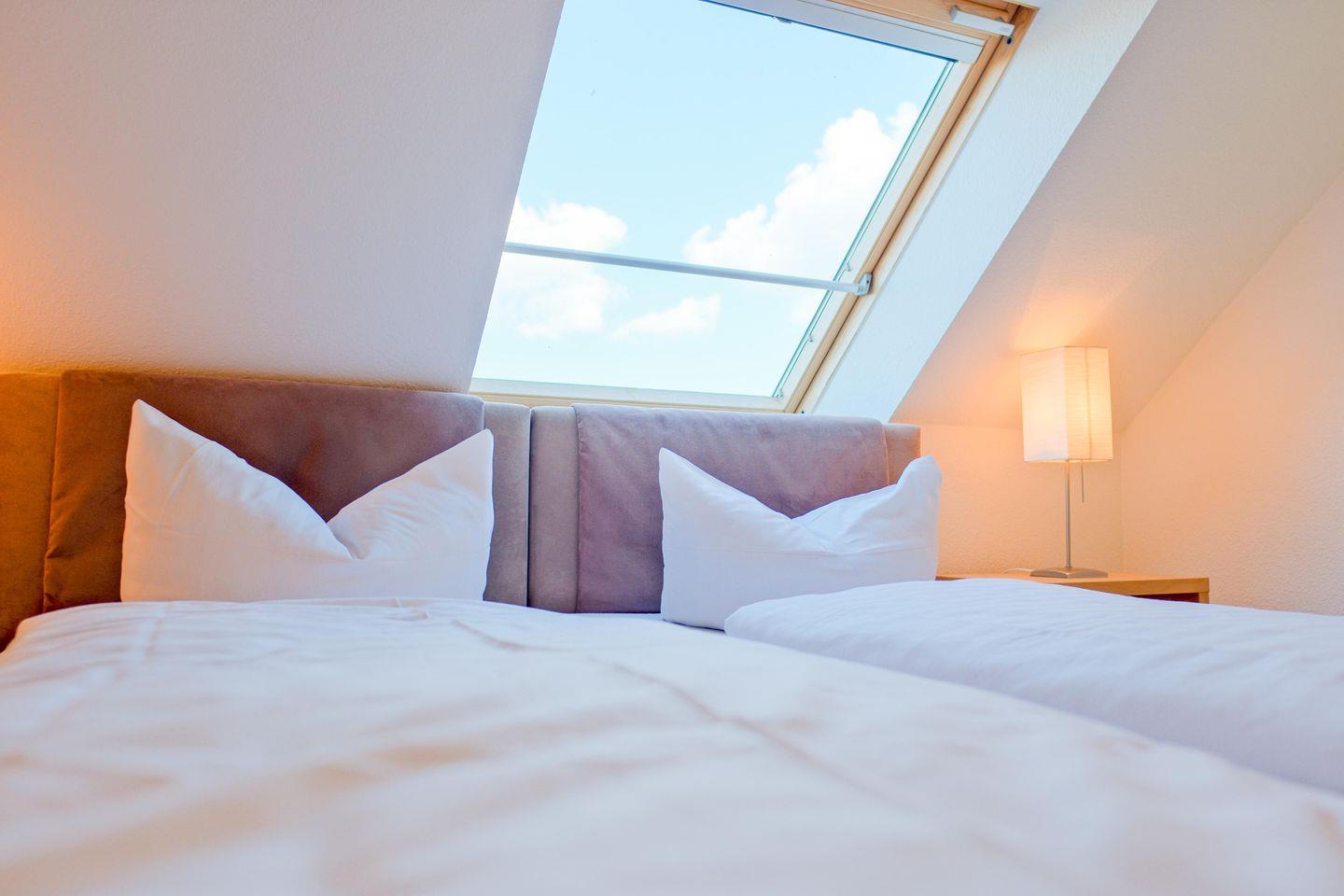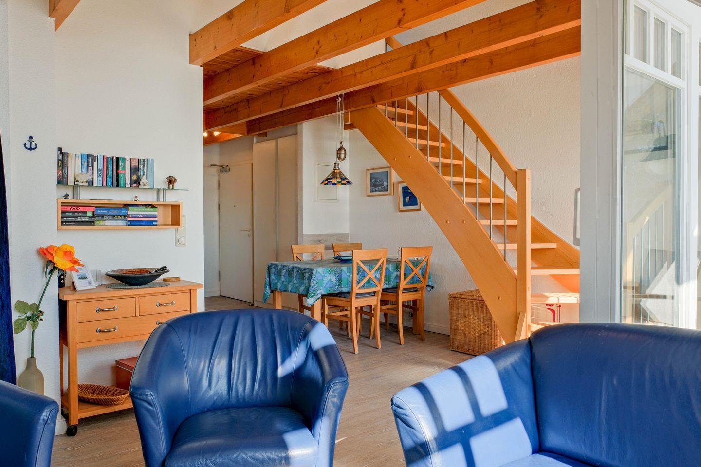 Die liebevoll eingerichtete Maisonettewohnung erstreckt sich über zwei Ebenen und bietet Platz für bis zu vier Personen. Im unteren Bereich befindet sich ein gemütlicher Wohnraum mit hoher Ledercouch, TV und einer charmanten Essecke – perfekt für gemeinsame Stunden. Eines der beiden Schlafzimmer liegt ebenfalls auf dieser Ebene, während das zweite über eine offene Treppe im Dachgeschoss zu erreichen ist – mit traumhaftem Ausblick auf das Salzhaff, der jeden Tag zu einem Erlebnis macht.