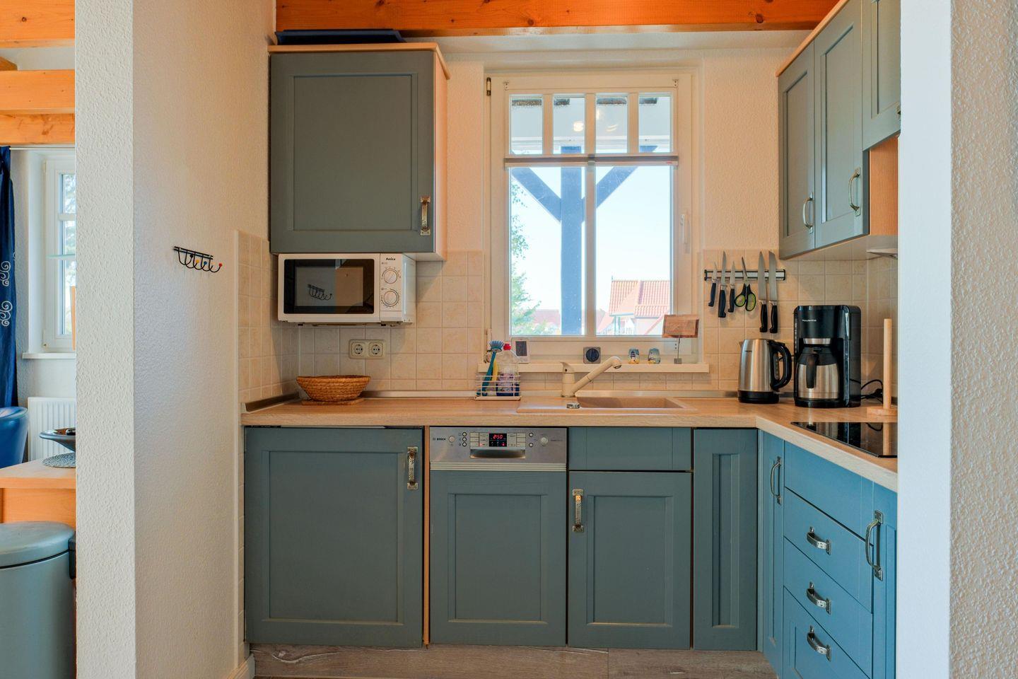 Die moderne Küchenzeile ist vollständig ausgestattet – von Cerankochfeld über Geschirrspüler bis zur Kaffeemaschine. Hier wird Kochen zum Genussmoment, nicht zur Pflicht. Ob morgendlicher Kaffee mit Sonnenaufgang oder ein gemütliches Abendessen mit Haffblick – jeder Bissen schmeckt nach Urlaub.