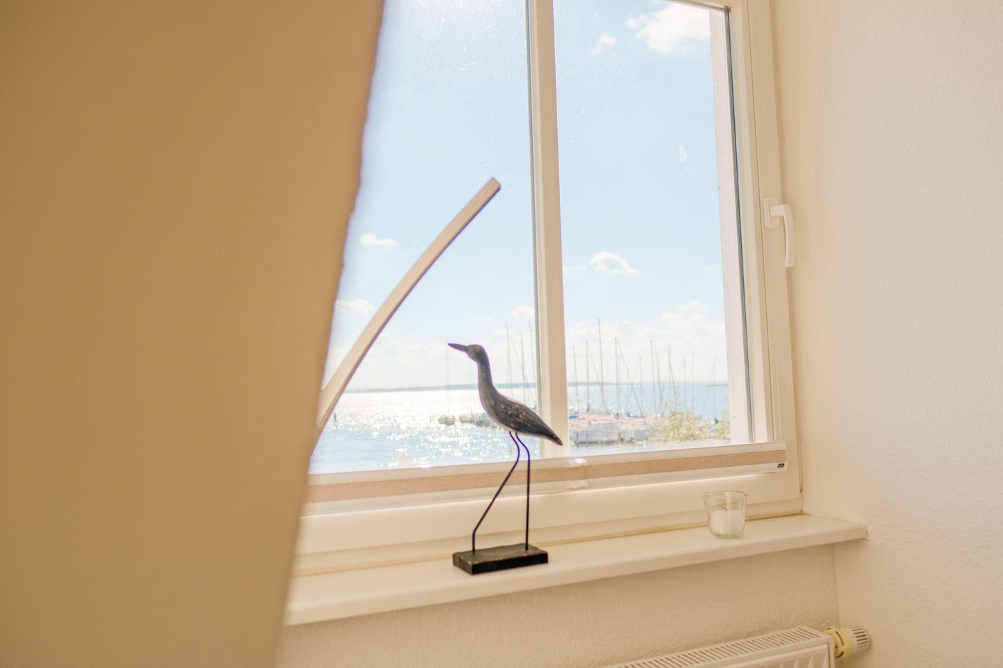 Zwei Balkone bieten zauberhafte Ausblicke auf das Salzhaff und den kleinen Hafen. Beobachten Sie die Boote beim Anlegen, lassen Sie den Blick über das Wasser schweifen oder genießen Sie bei einem Glas Wein den Sonnenuntergang – ein Schauspiel, das nie gleich ist und doch immer berührt.