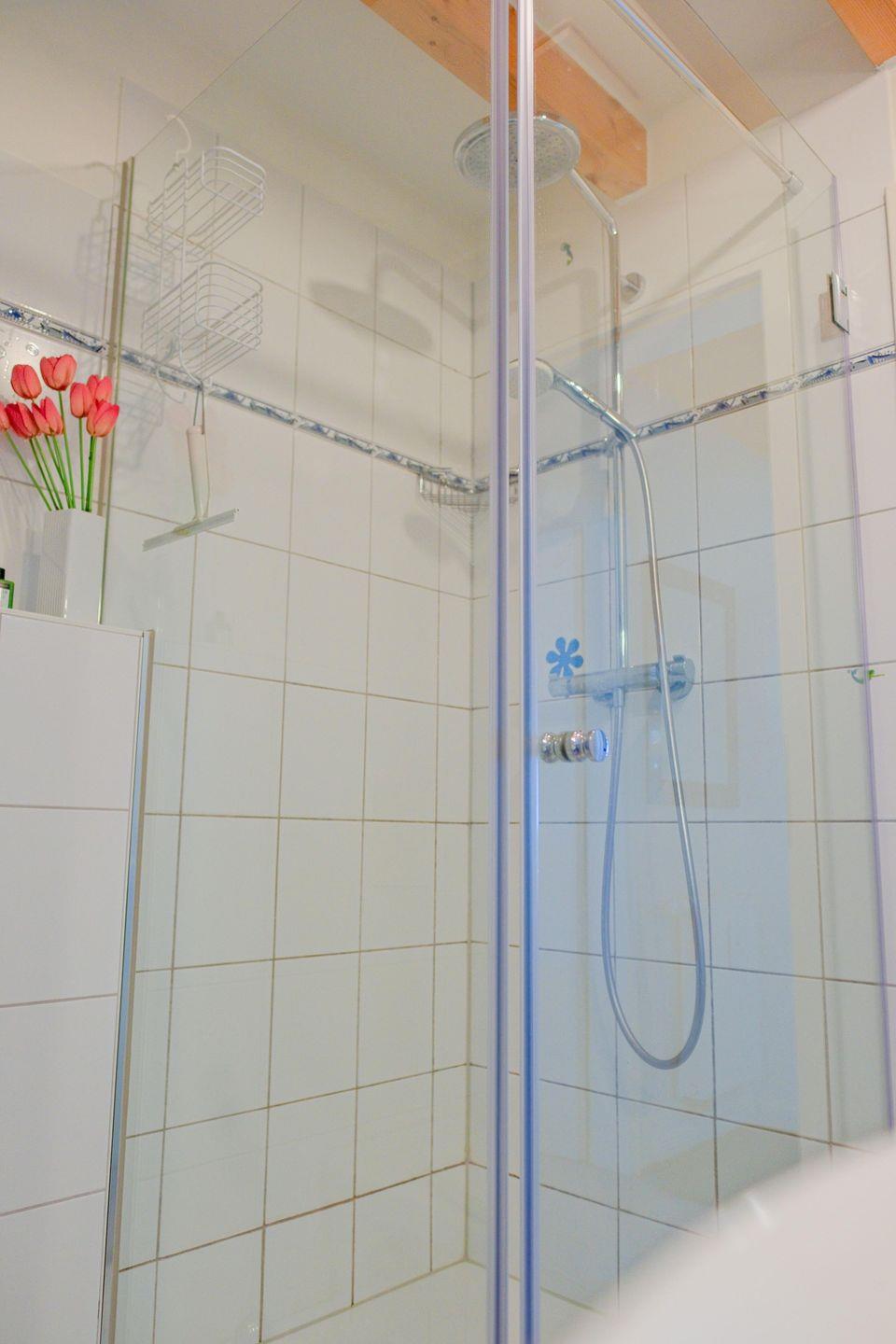 Das moderne Duschbad überzeugt mit klarer Gestaltung, hellen Fliesen und allem Komfort, den man sich wünscht. Waschmaschine, WLAN und ein eigener Stellplatz runden das Angebot ab.