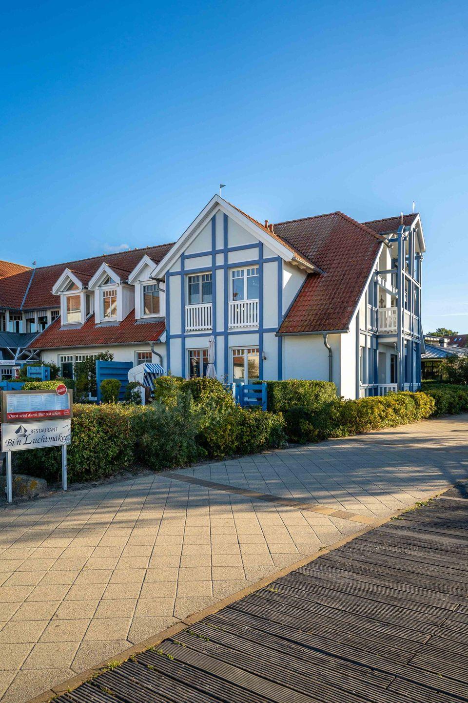 Direkt am idyllischen Salzhaff gelegen, genießen Sie aus nahezu allen Fenstern den Blick aufs Wasser. Morgens weckt Sie das leise Plätschern der Wellen, und wenn der Wind durch die Masten der Boote in der Marina weht, hören Sie das sanfte Klappern der Wanten – ein unverwechselbares Küstengefühl.
