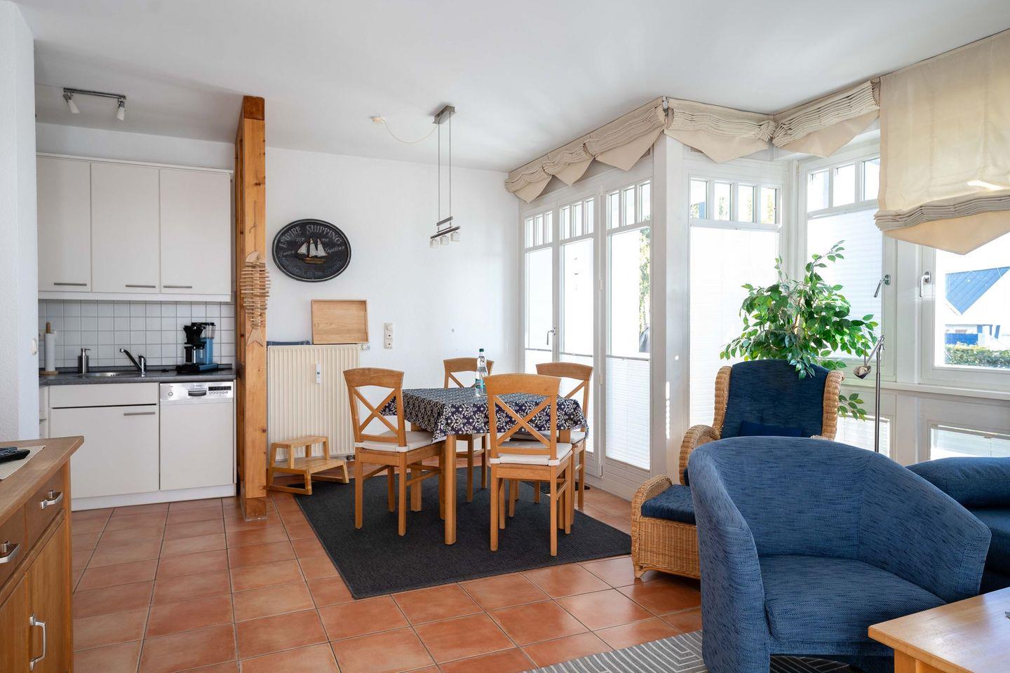 Hier warten Restaurants, Eisdielen und kleine Märkte. Nur wenige Schritte entfernt befinden sich die Segel-, Surf- und SUP-Schulen am Salzhaff. Zum feinen Ostseestrand sind es gerade einmal 150 Meter – perfekt für einen Spaziergang in Flip-Flops oder den Sprung ins Wasser am Morgen, während der Kaffee in der Küche duftet.