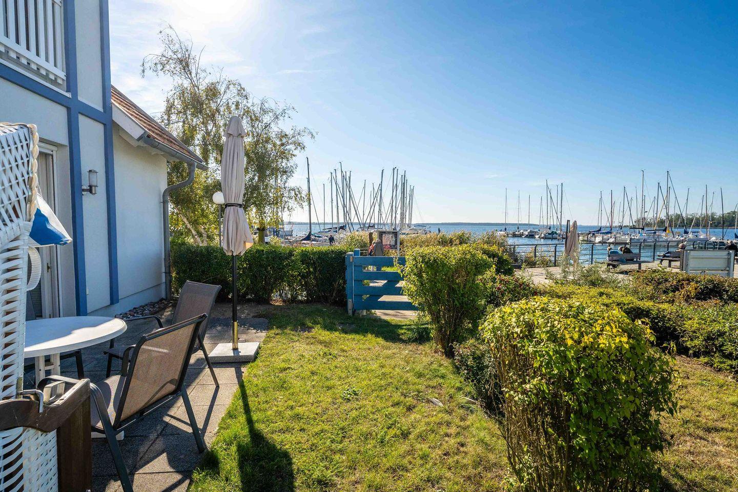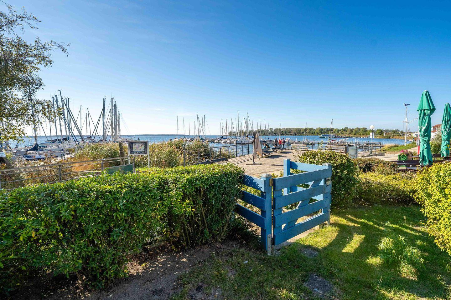 Vom Wohnzimmer aus gelangen Sie direkt auf die Terrasse mit Garten und Strandkorb – ein herrlicher Ort mit Sonne bis in die Abendstunden. Der Garten bietet genug Platz für Ihr SUP oder Kanu, und durch die kleine Gartenpforte treten Sie direkt hinaus auf die Uferpromenade am Haffplatz.