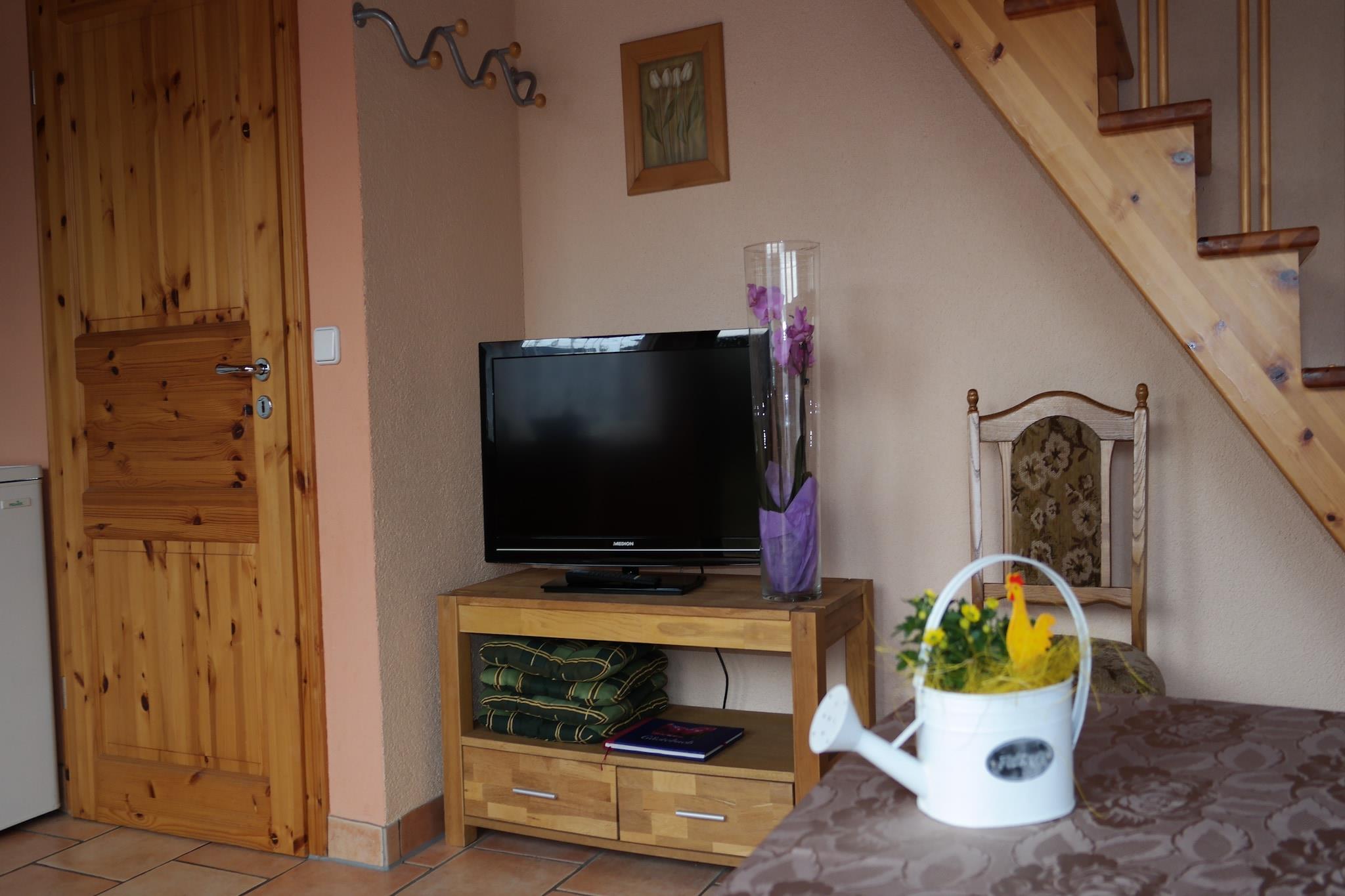 Parterre: (Küche(Toaster, Kochherd(4 Kochplatten), Kaffeemaschine, Backofen, Spülmaschine, Kühlschrank(+ Gefrierfach)), Wohn-/Schlafzimmer(Schlafcouch 1 Pers., TV(Flatscreen), DVD-Spieler, Radio, CD-Spieler)) In der 1. Etage: (Schlafzimmer(Einzelbett, Einzelunterschiebebett, Doppelbett king size), Badezimmer(Dusche, Waschbecken, Toilette, Heizung(Fußbodenheizung))) Sauna(Gemeinschaftliche Nutzung mit anderen Gästen, auf dem Gelände, gegen Gebühr), Trockner(Gemeinschaftliche Nutzung mit anderen Gästen), Whirlwanne(Gemeinschaftliche Nutzung mit anderen Gästen, gegen Gebühr), Waschmaschine(Gemeinschaftliche Nutzung mit anderen Gästen), Heizung, Parkplatz, Spielgeräte(Gemeinschaftliche Nutzung mit anderen Gästen), Fahrräder verfügbar(gegen Gebühr), Kinderbett, Hochstuhl