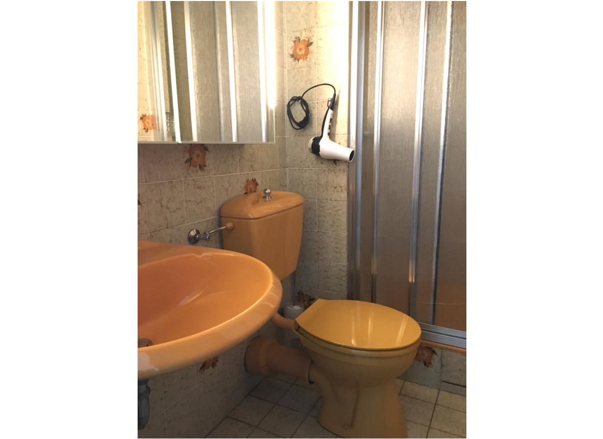 - Dusche, Wandspiegelschrank, Waschbecken, Haartrockner, elektrischer Handtuchwärmer und WC