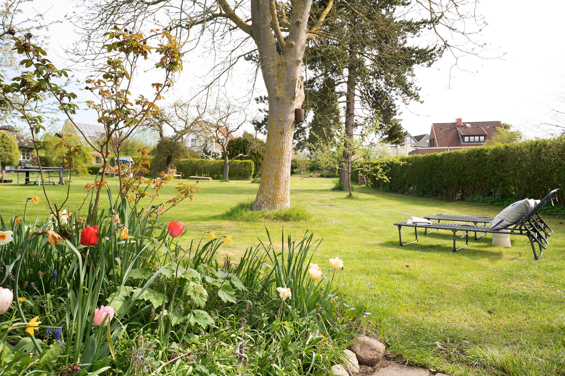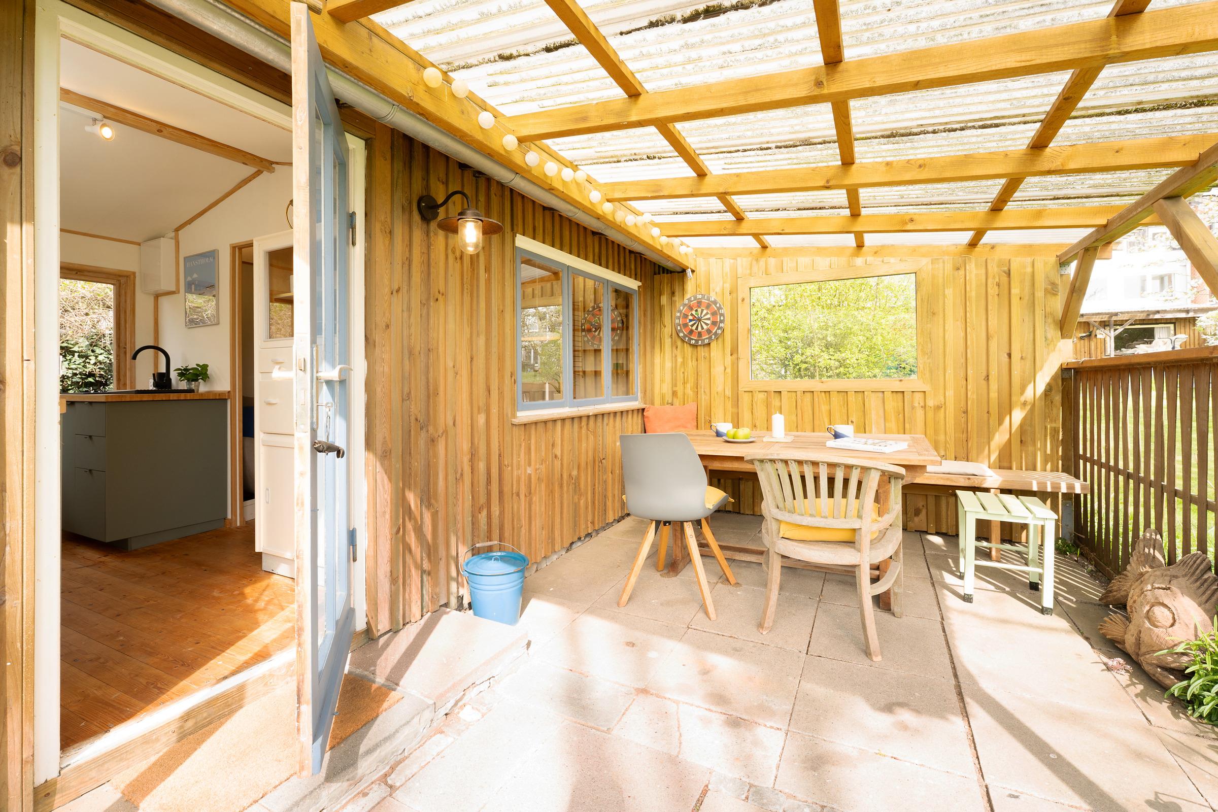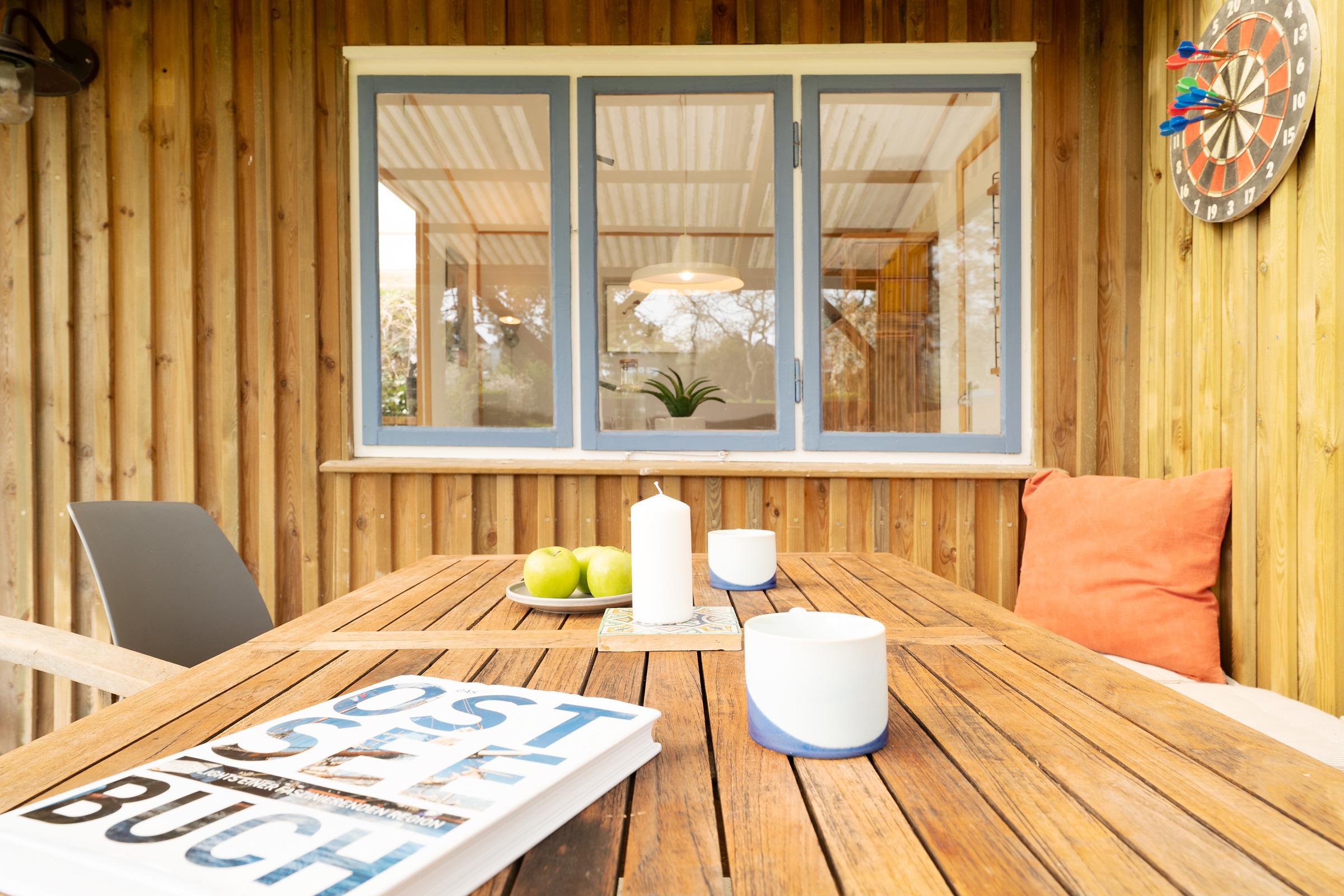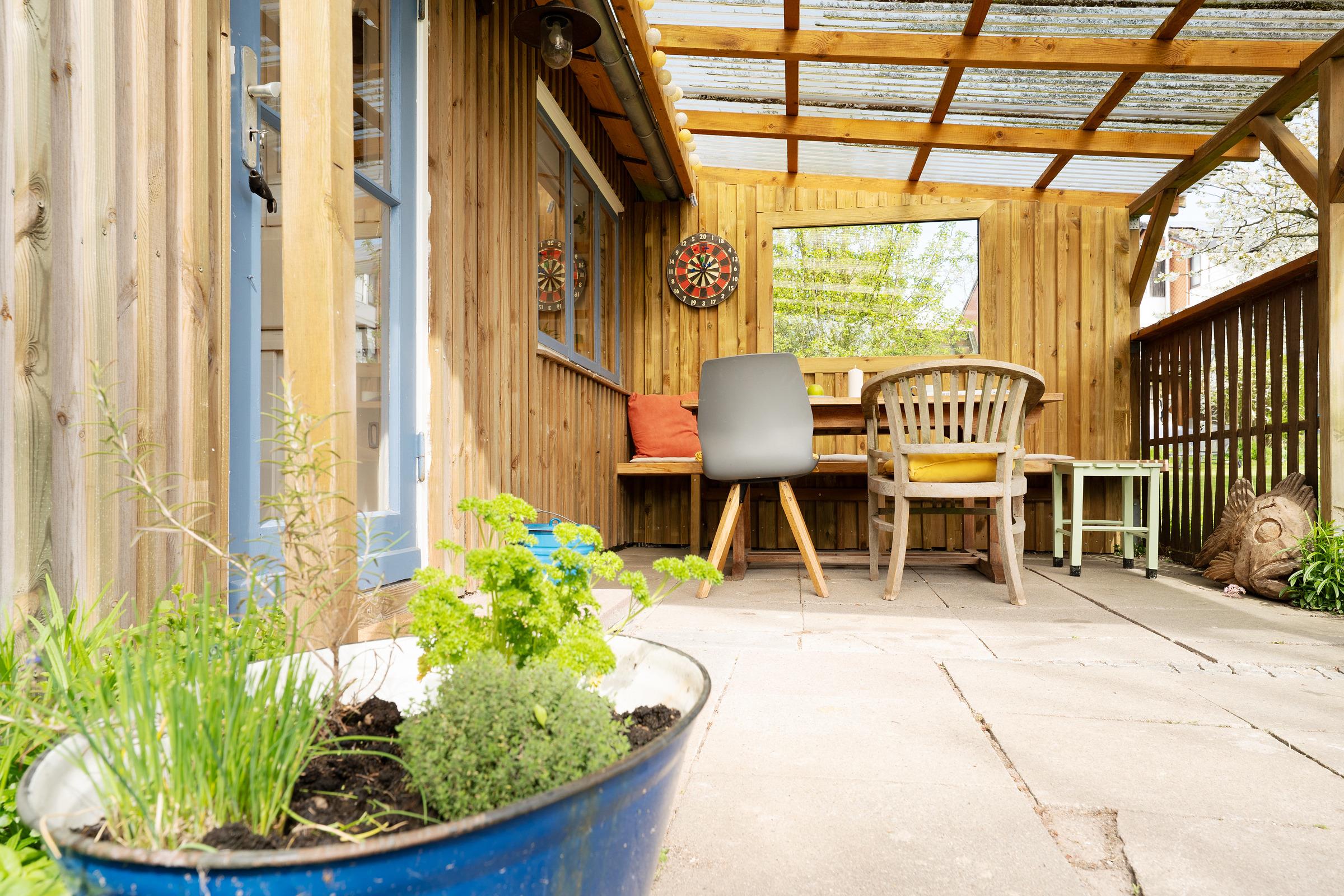 Die große Terrasse ist mit Gartenmöbeln ausgestattet – perfekt für ein Frühstück an der frischen Luft. Auch eine Tischtennisplatte steht Ihnen im Gemeinschaftsgarten zur Verfügung.