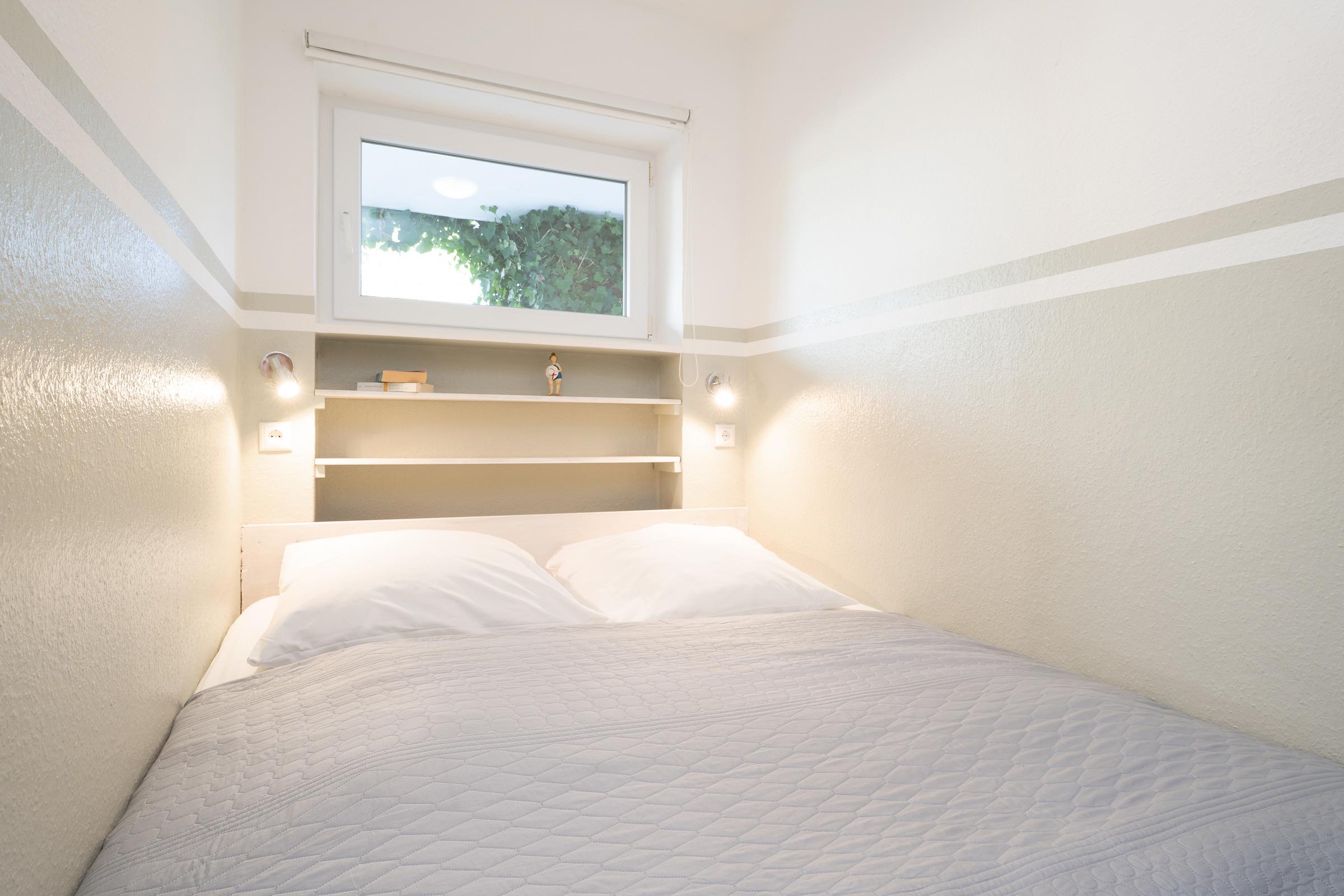 Schlafzimmer 1: 1 Doppelbett 2x 90 x 200 cm), Kleiderschrank, Fernseher, Verdunkelung: Vorhang, kein Platz für ein Babybett vorhanden