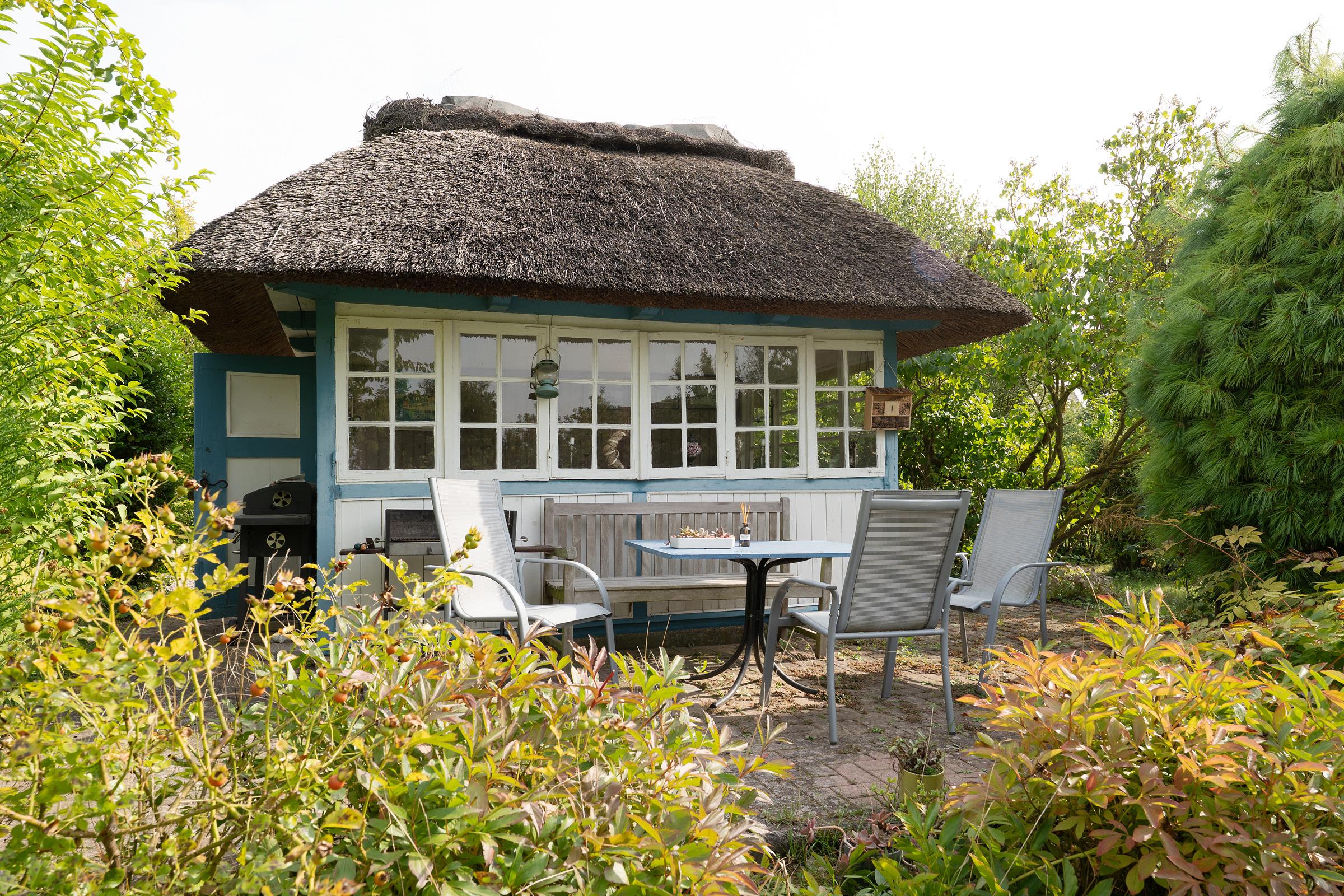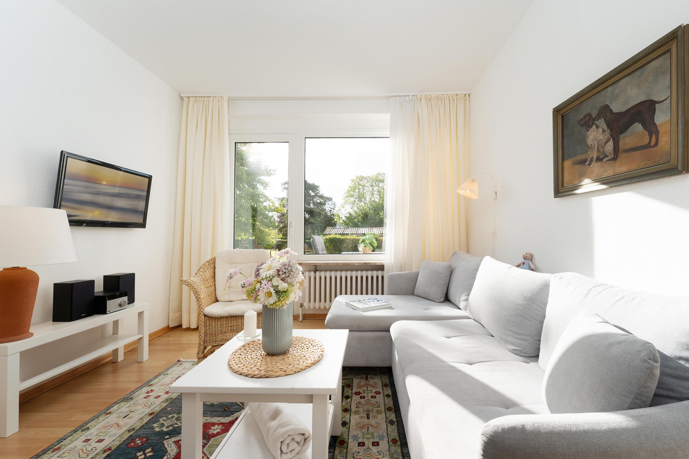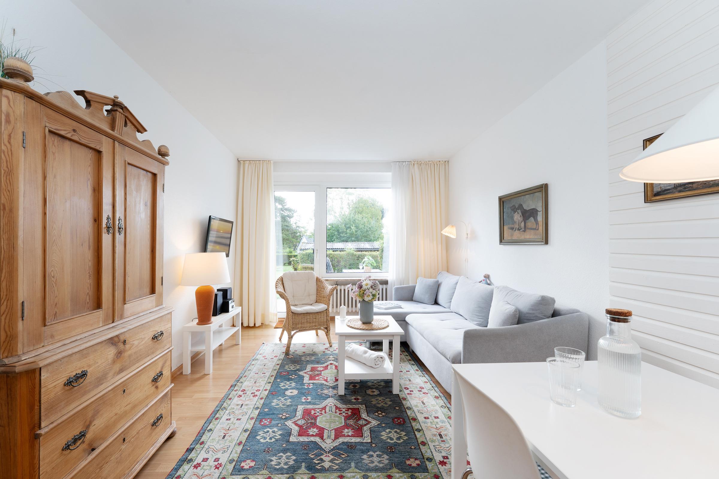 Der lichtdurchflutete Wohnbereich empfängt Sie mit einer gemütlichen Sitzecke, TV und Radio – ideal für entspannte Stunden nach einem Strandtag. Von hier aus gelangen Sie direkt auf die ca. 12 m² große Terrasse, die nach Süd-West ausgerichtet ist. Genießen Sie die Sonne bis in den Abend hinein und nutzen Sie den vorhandenen Holzkohlegrill für gesellige Stunden im Freien.