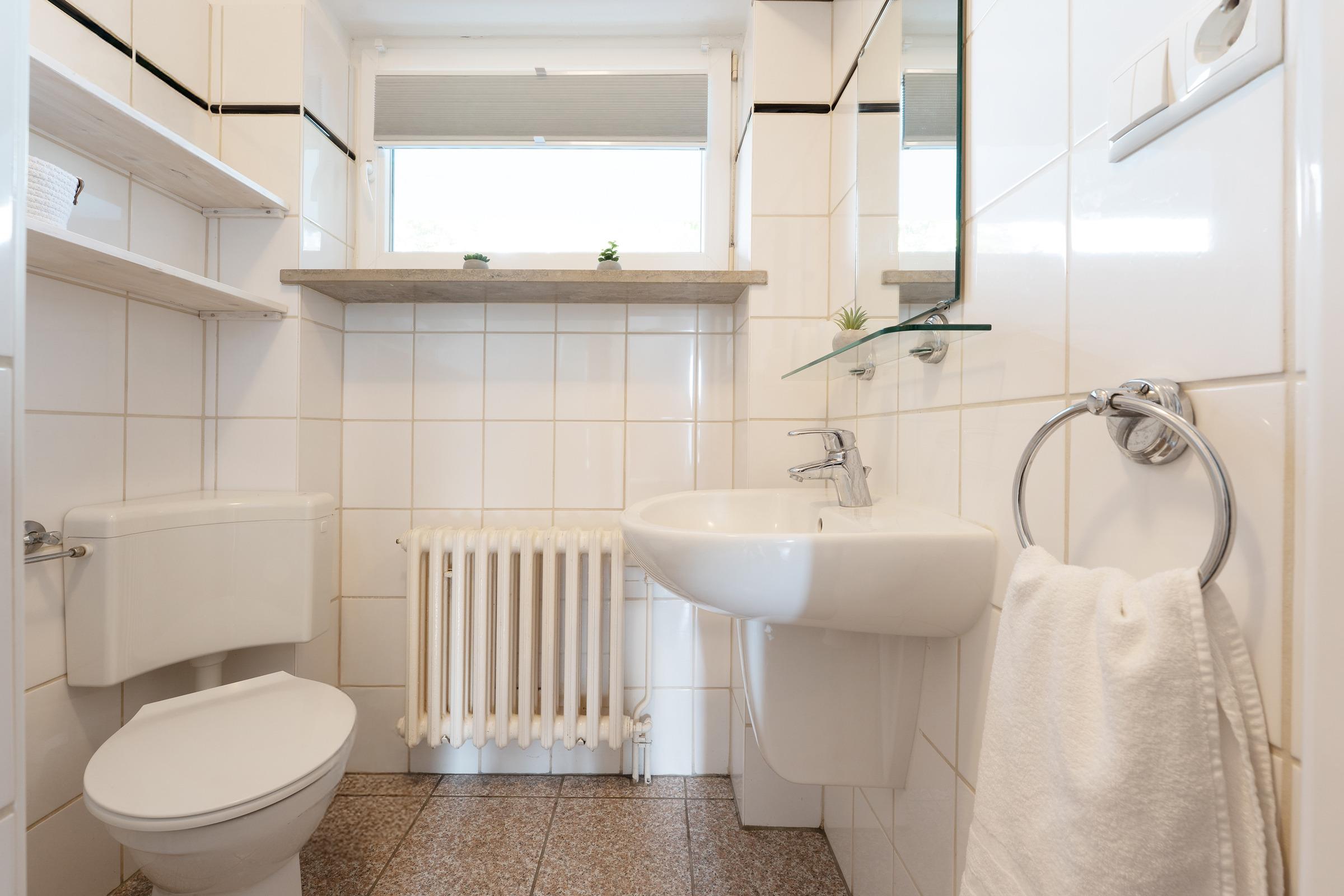 Das Tageslicht-Badezimmer verfügt über eine Dusche (Einstiegshöhe 24 cm), WC, Kosmetikspiegel, Haartrockner und einen beheizbaren Handtuchhalter.