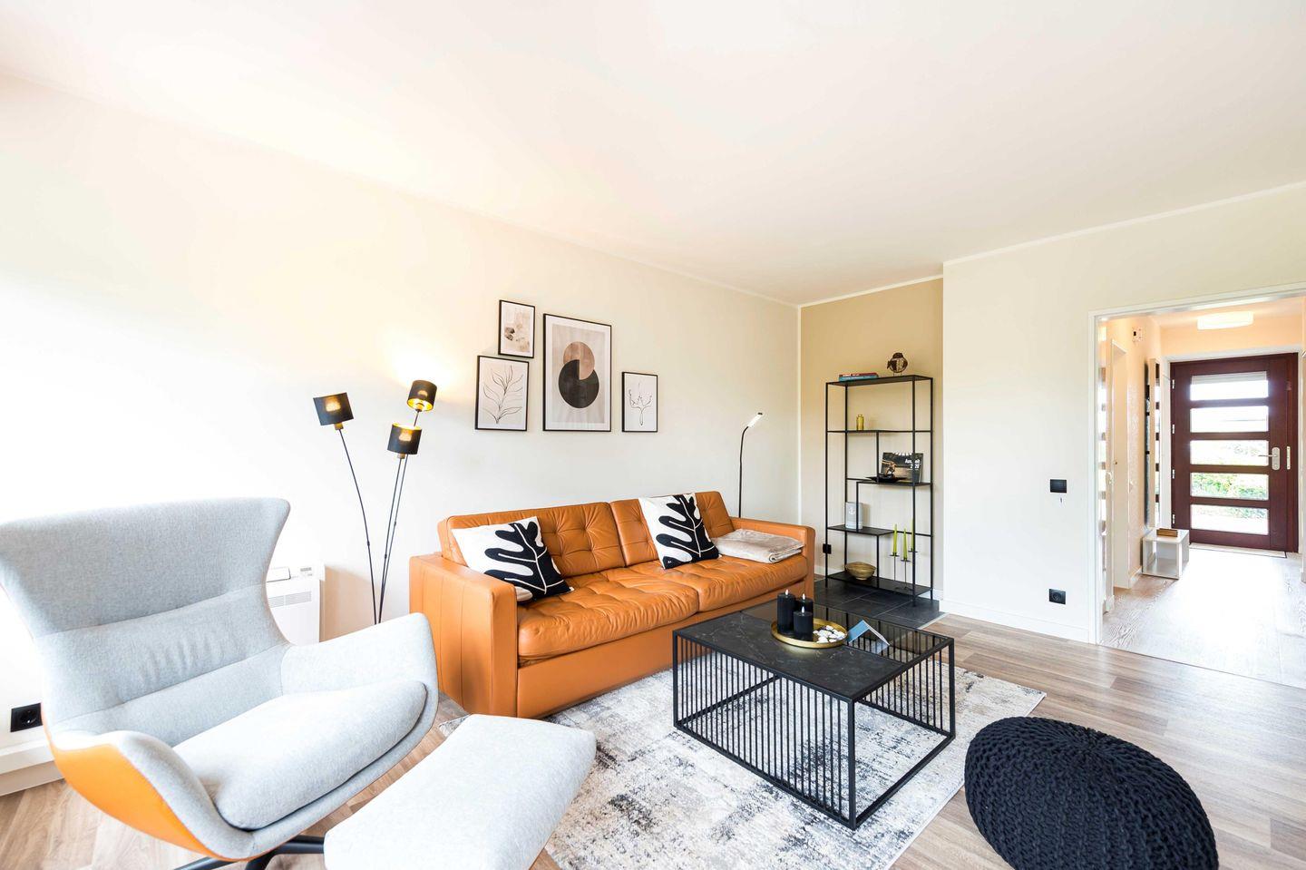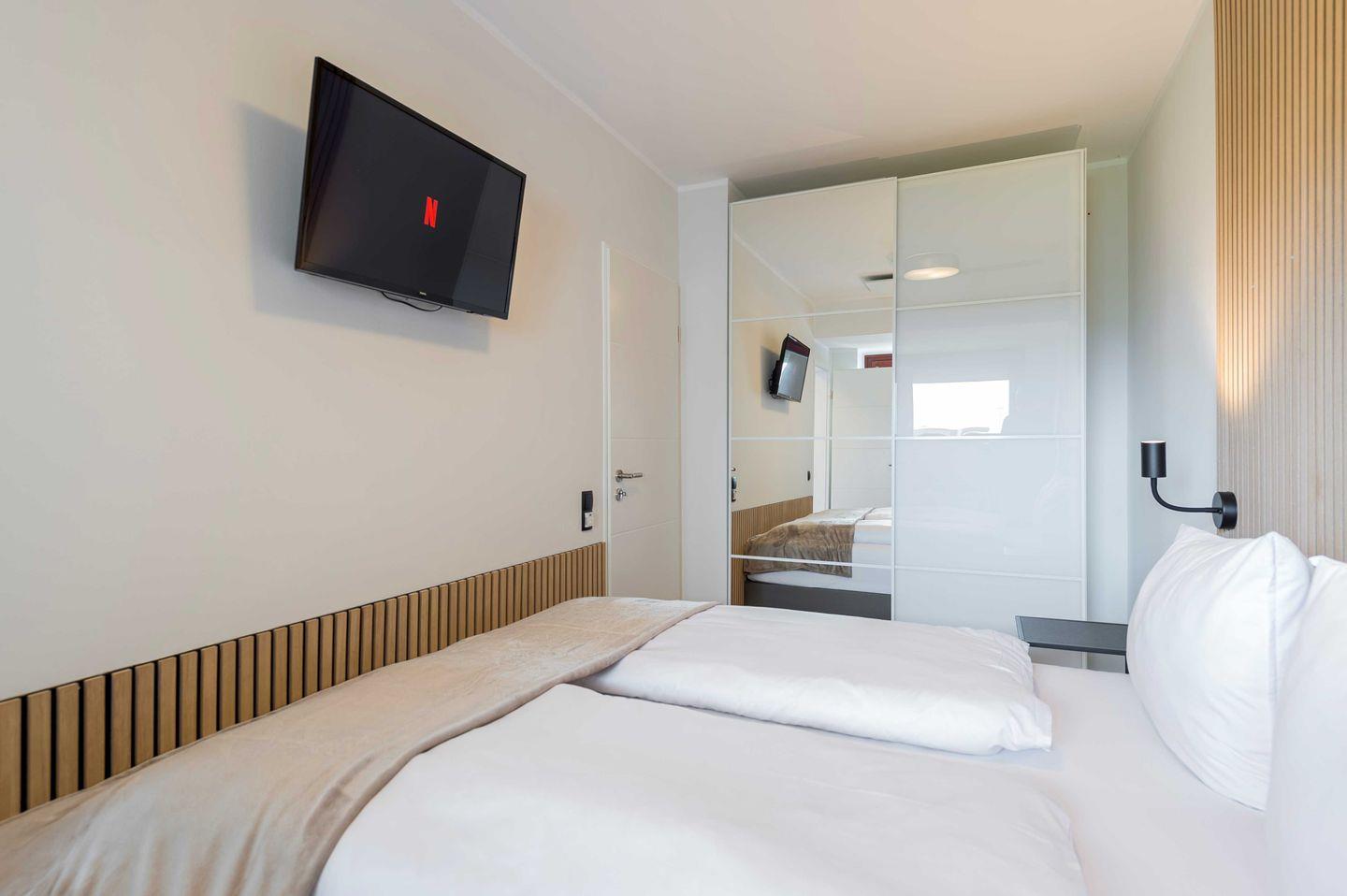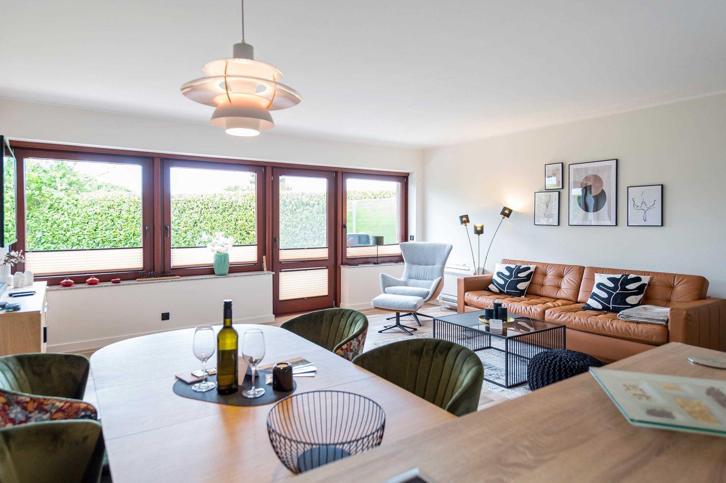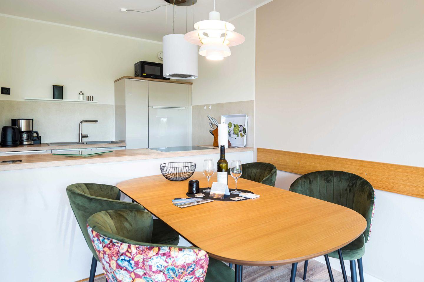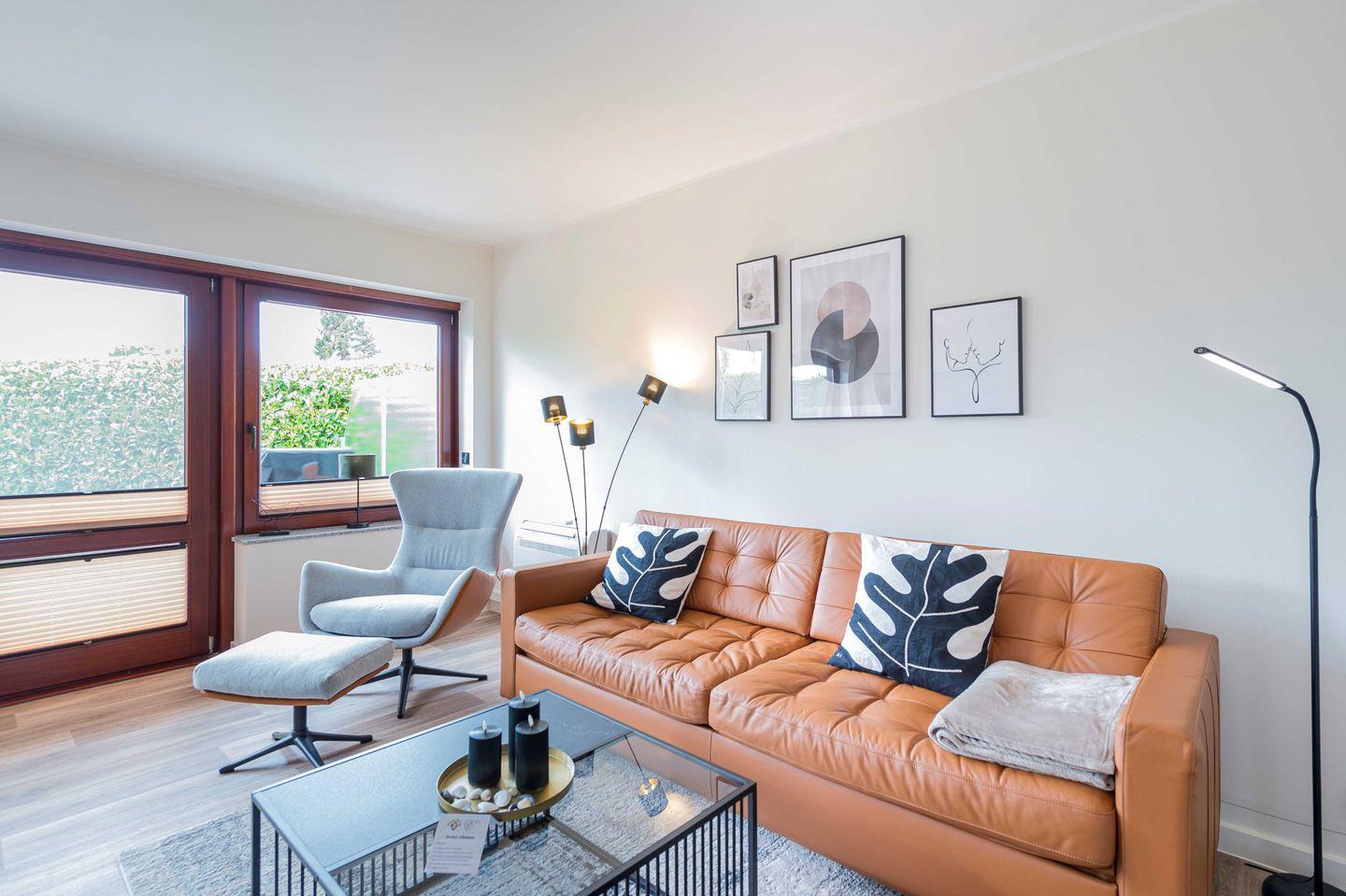 Im lichtdurchflutetem Wohnzimmer und der offenen Küche lädt ein großes Sofa zum Entspannen ein. Die Wohnung verfügt über allerhand Annehmlichkeiten. Der 55 Zoll-TV ist mit Amazon-Stick ausgestattet, es gibt ein Soundsystem mit JBL Soundbar und ein 100 MB-WLAN. An heißen Tagen kann im Wohnzimmer eine Klimaanlage für nötige Abkühlung sorgen und im Winter für ein nachhaltiges Heizen.