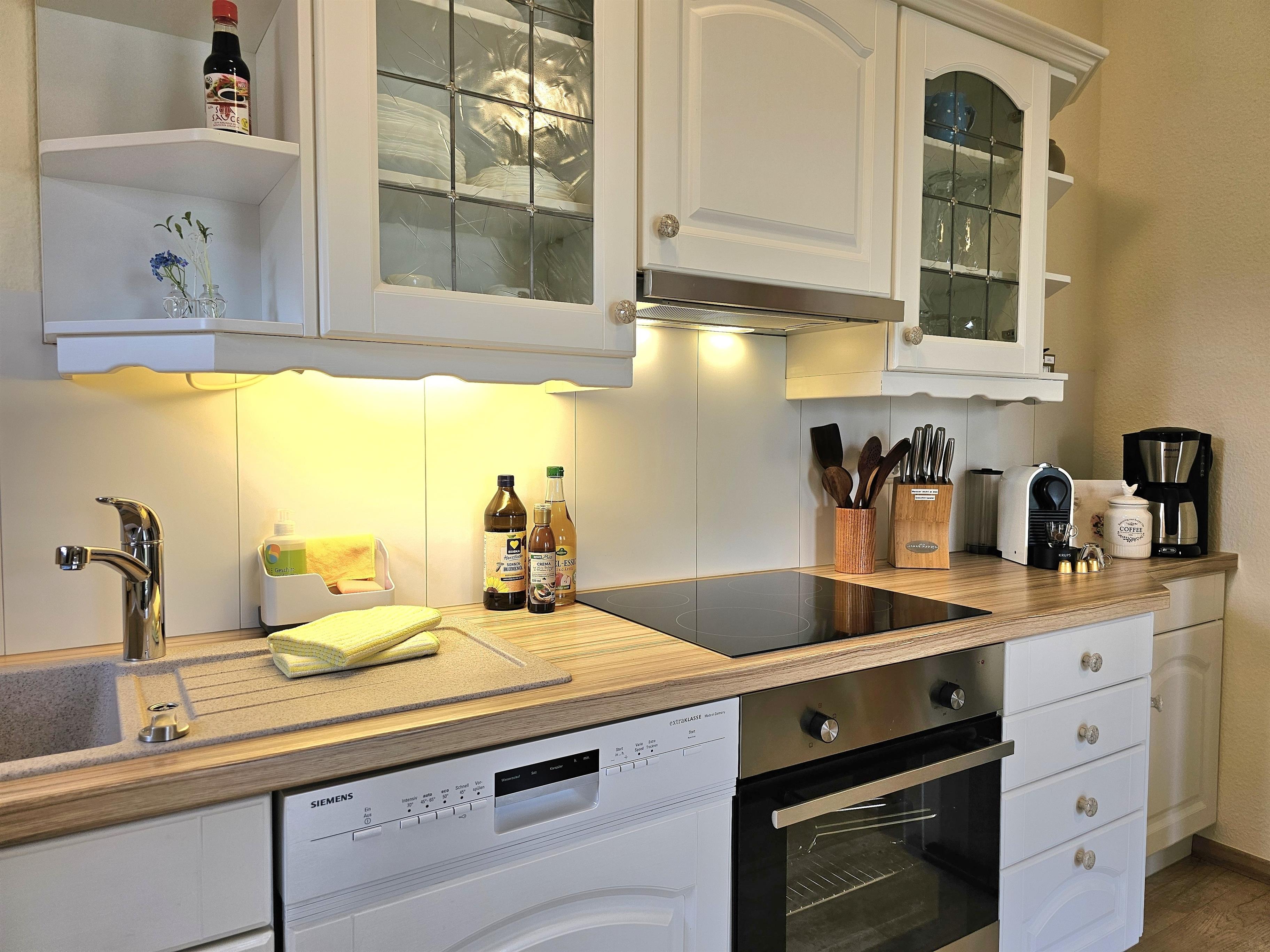 Die voll ausgestattete Einbauküche lässt keine Wünsche offen und bietet alles, was Sie für einen entspannten Aufenthalt und gemeinsames Kochen benötigen. Die beiden Schlafzimmer verfügen über komfortable Doppelbetten (180x200 cm) mit angenehmer Einstiegshöhe und hochwertigen Hotelmatratzen für eine erholsame Nacht. Das natürlich gestaltete Badezimmer besticht durch Sauberkeit und eine großzügige Dusche.