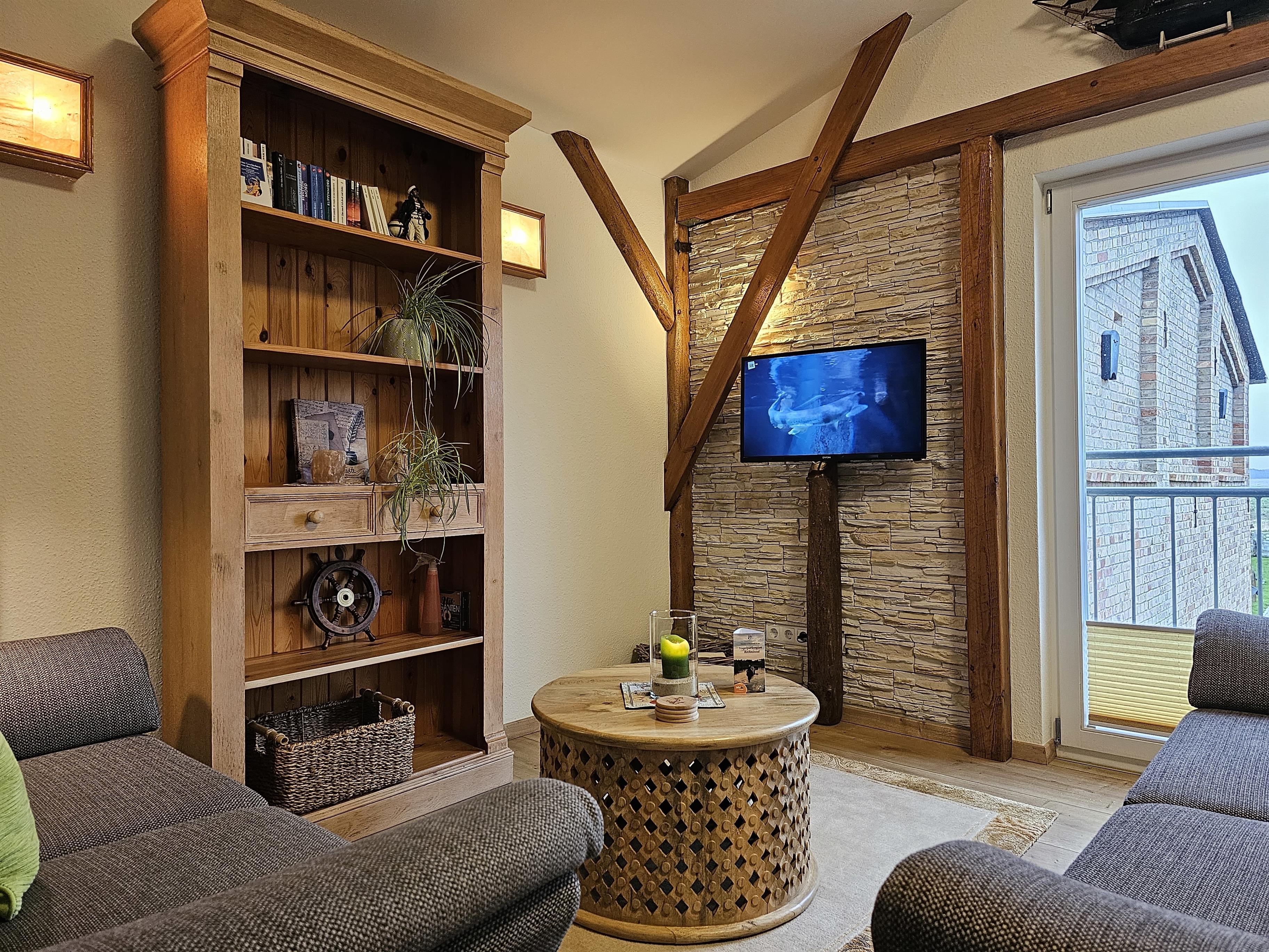 Die charmante Ferienwohnung liegt im Dachgeschoss und ist bequem über eine Außentreppe erreichbar. Diele, Wohnzimmer sowie die Küche mit Essbereich bilden ein offenes, behagliches Wohnkonzept. Frühmorgens erleben Sie wunderschöne Sonnenaufgänge über dem Saaler Bodden, und am Abend tauchen sanfte Salzlampen die Räume in eine warme, stimmungsvolle Beleuchtung.