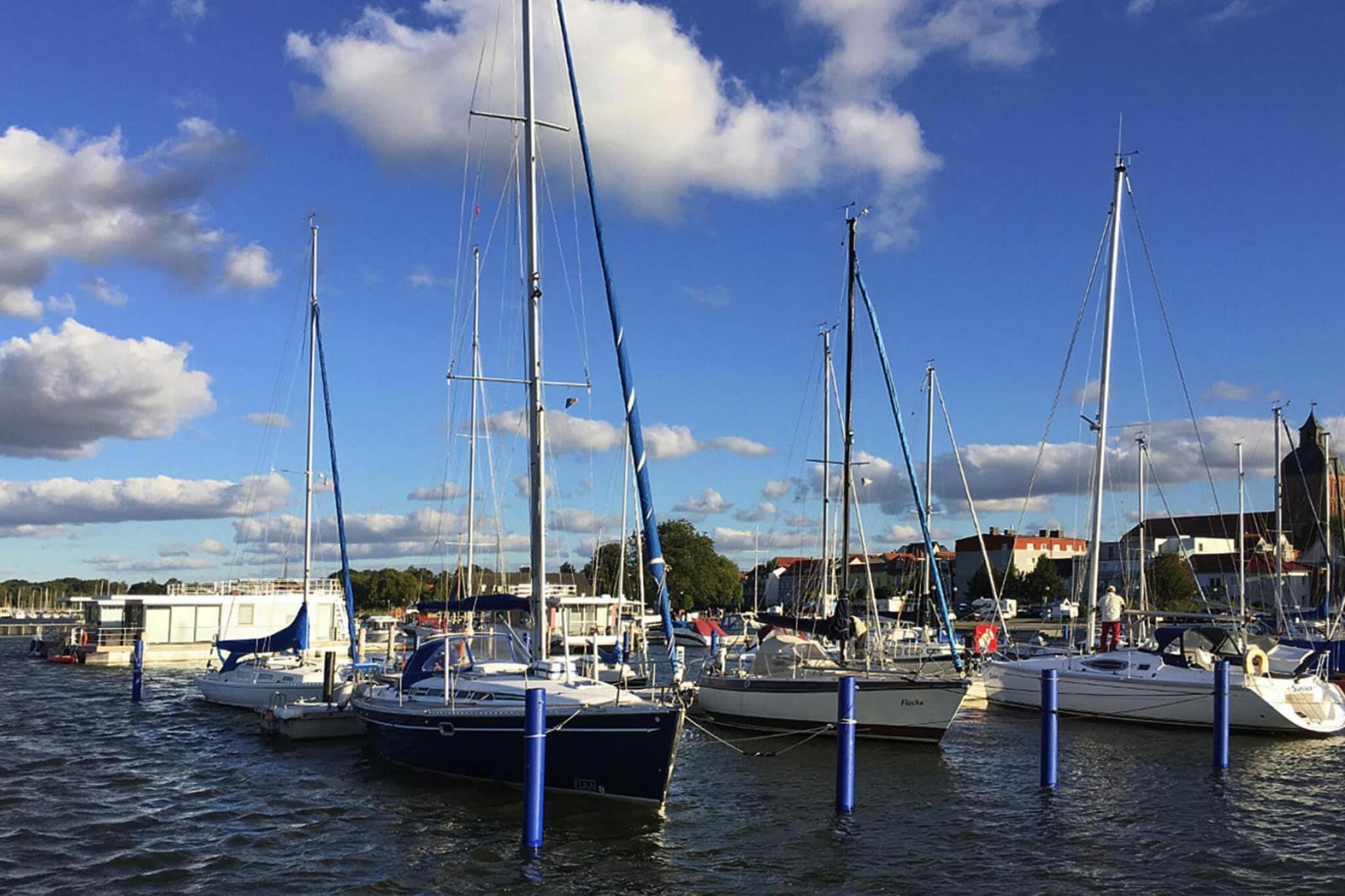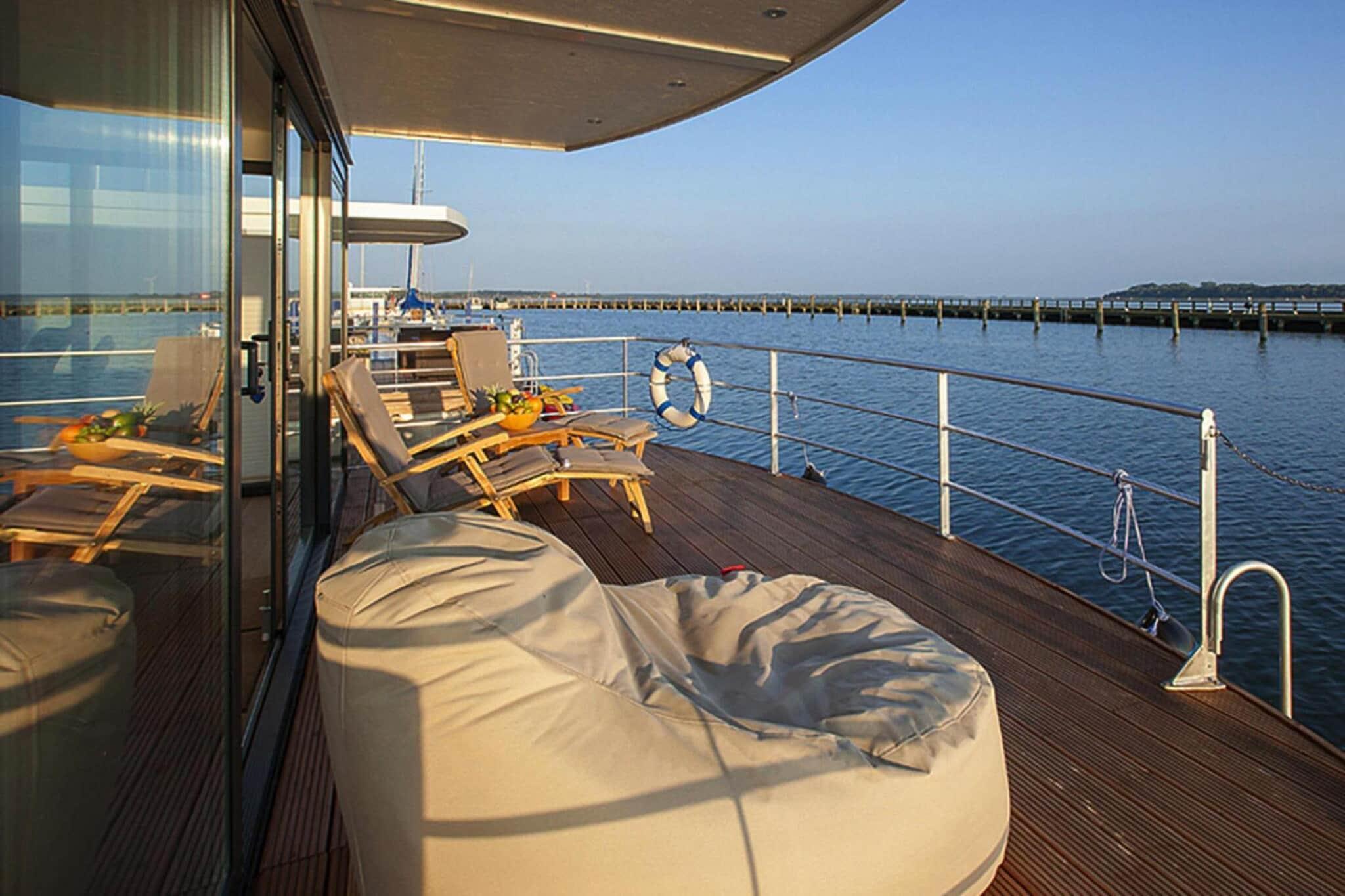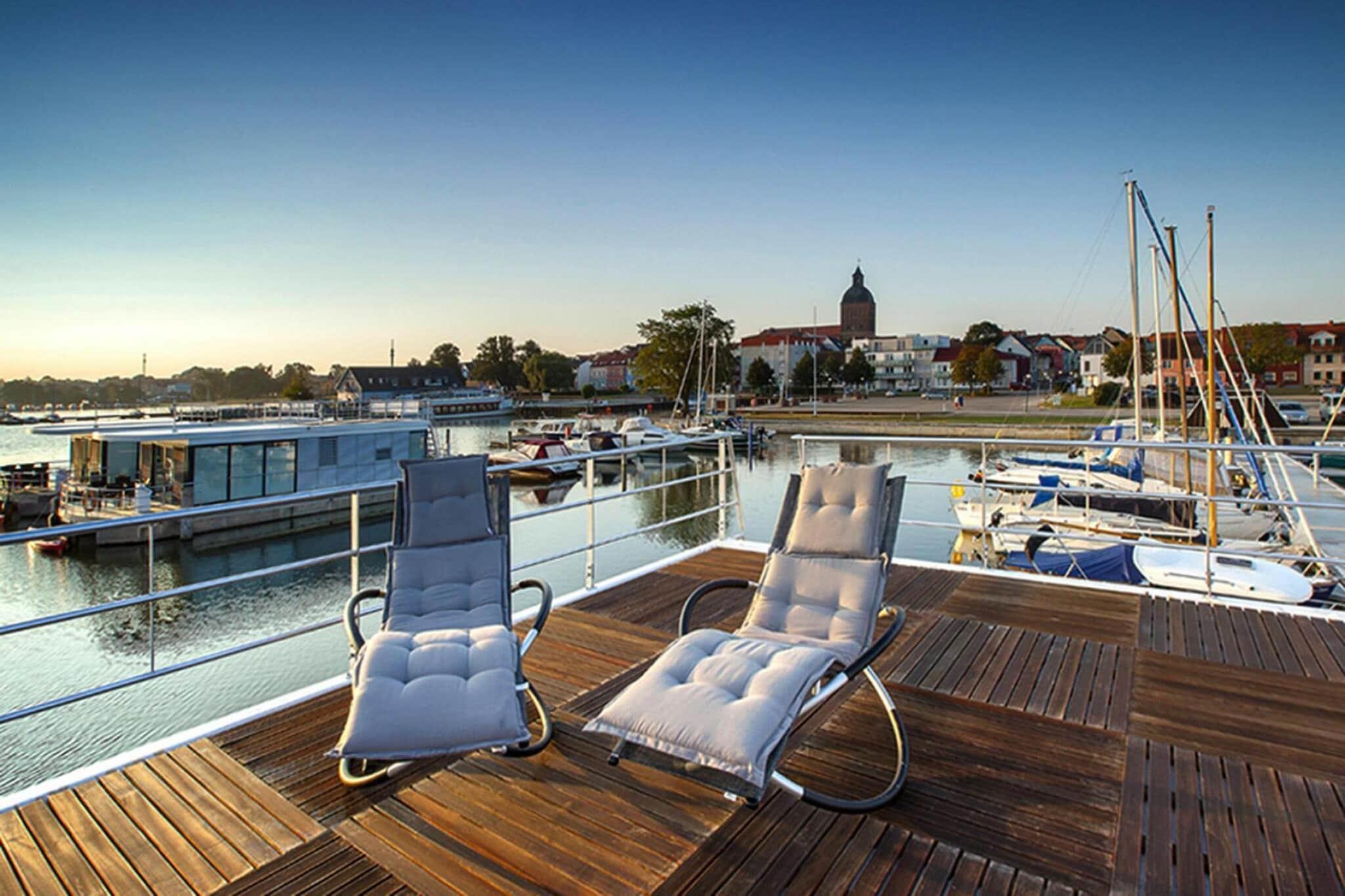 Erleben Sie maritimen Komfort im modernen Hausboot direkt im Hafen von Ribnitz-Damgarten mit zwei Terrassen und Blick aufs Wasser.