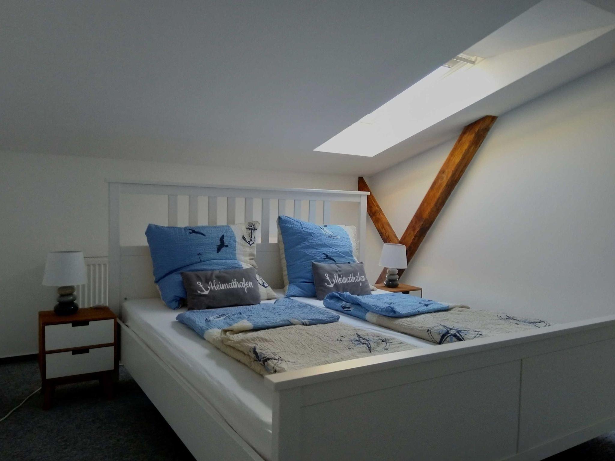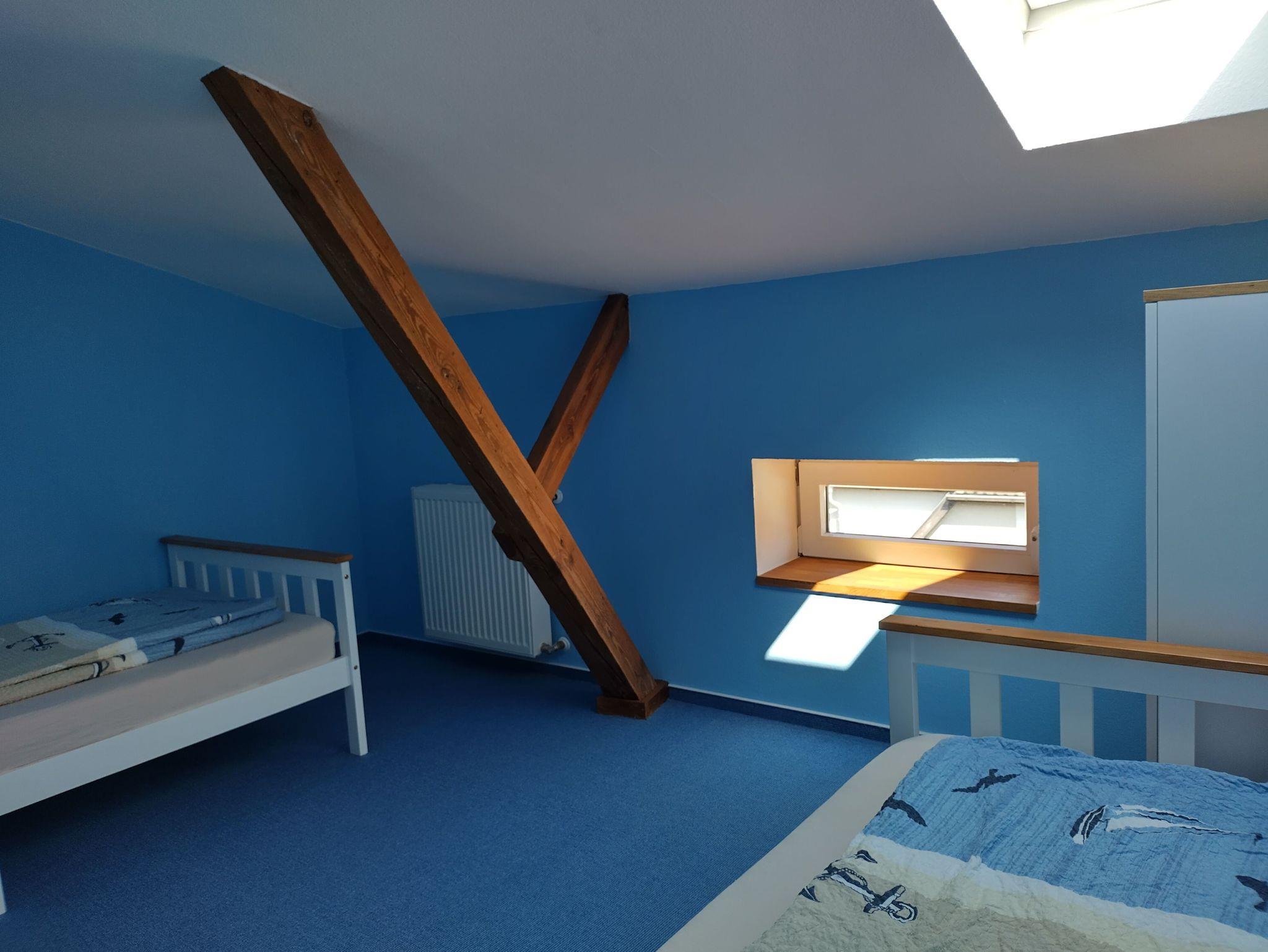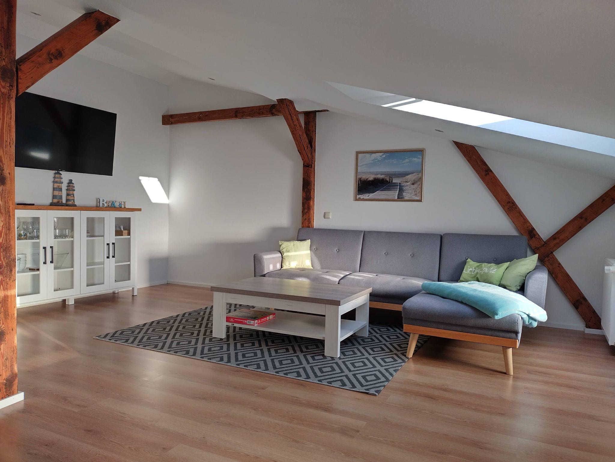 Moderne Ferienwohnung im Dachgeschoss eines historischen Stadthauses in Ribnitz-Damgarten, zentral und familienfreundlich an der Ostseeküste.