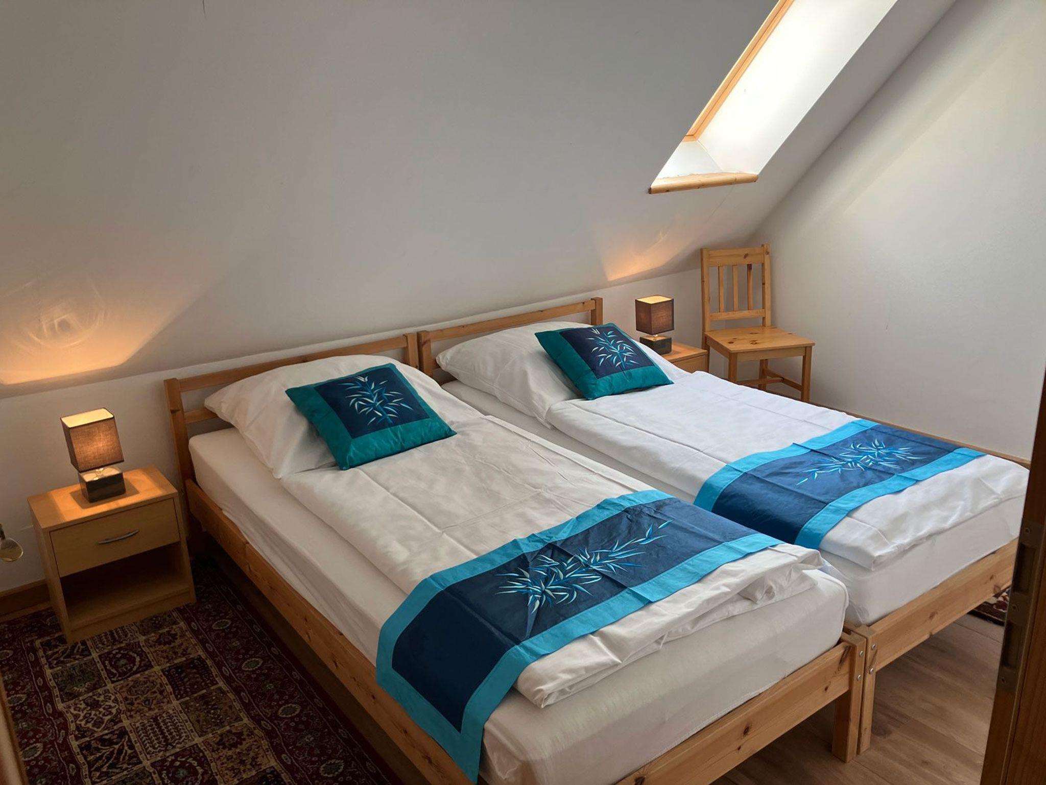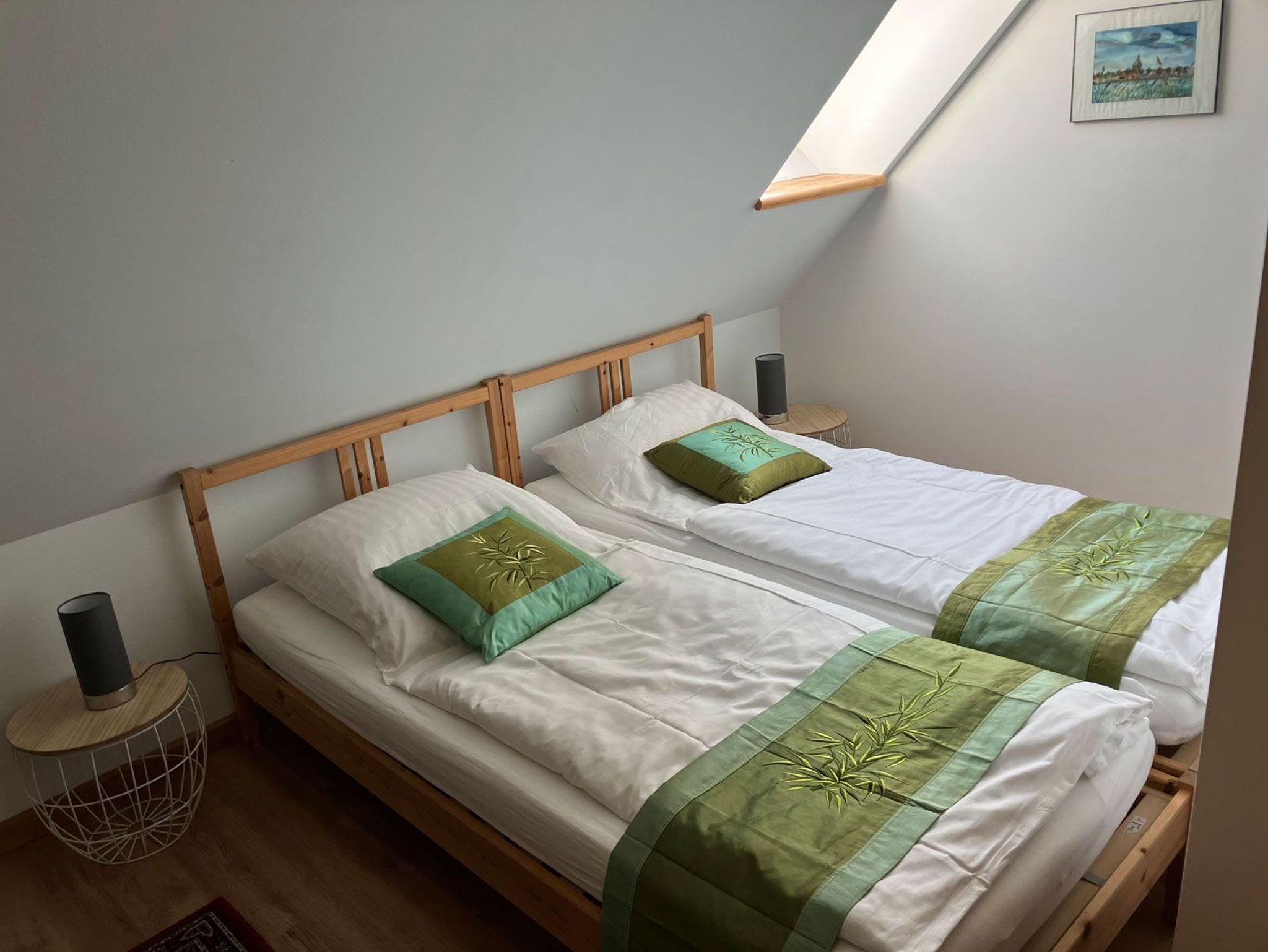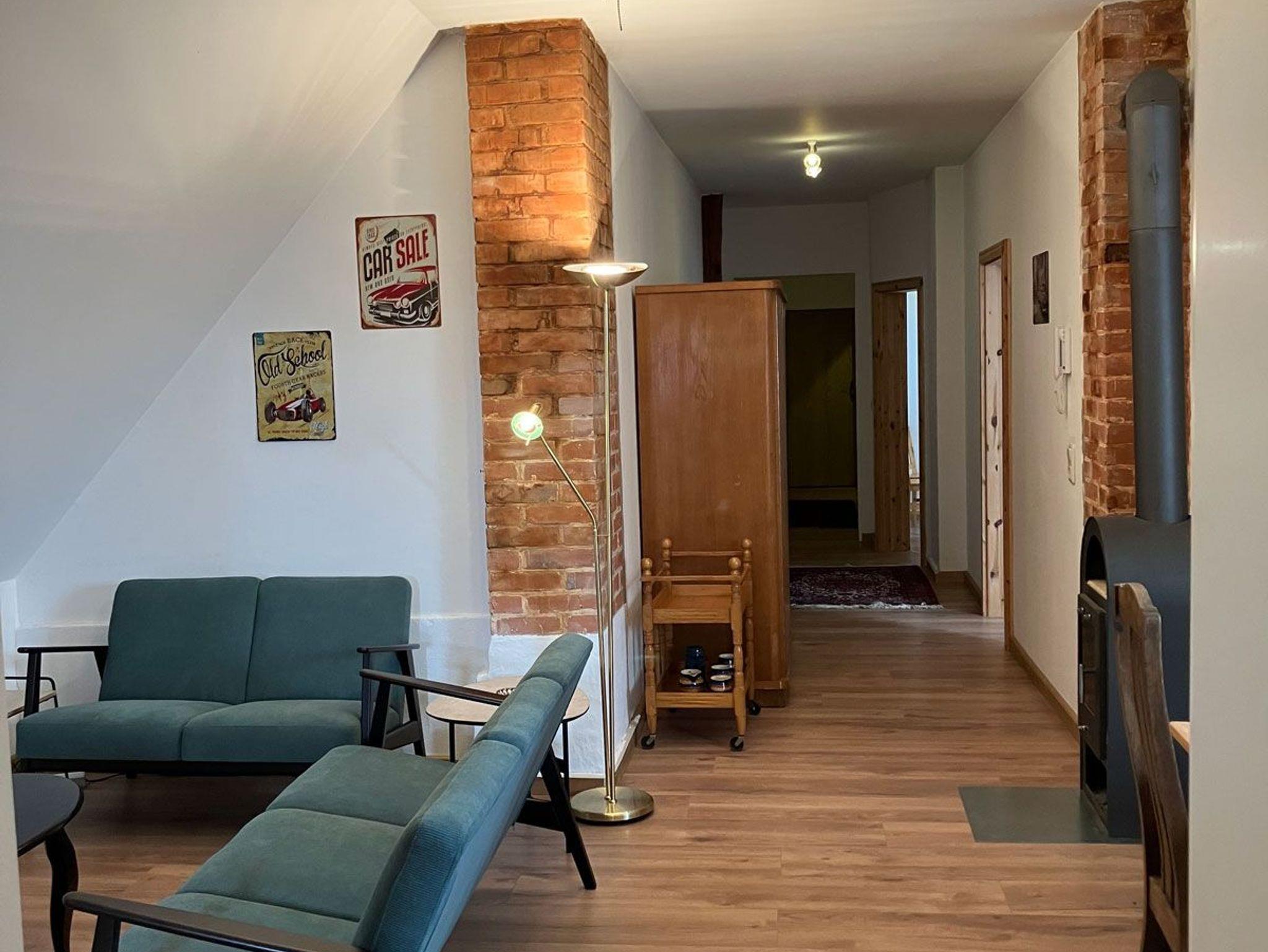 Die Dachwohnung ist für 6 Personen und einer weiteren Aufbettung eingerichtet. Drei Schlafzimmer, ein Bad ,ein Wohnzimmer mit offener Küche und eisernen Kaminofen für ein gemütliches Ambiente in der kälteren Jahreszeit gehören zu dieser Wohnung.