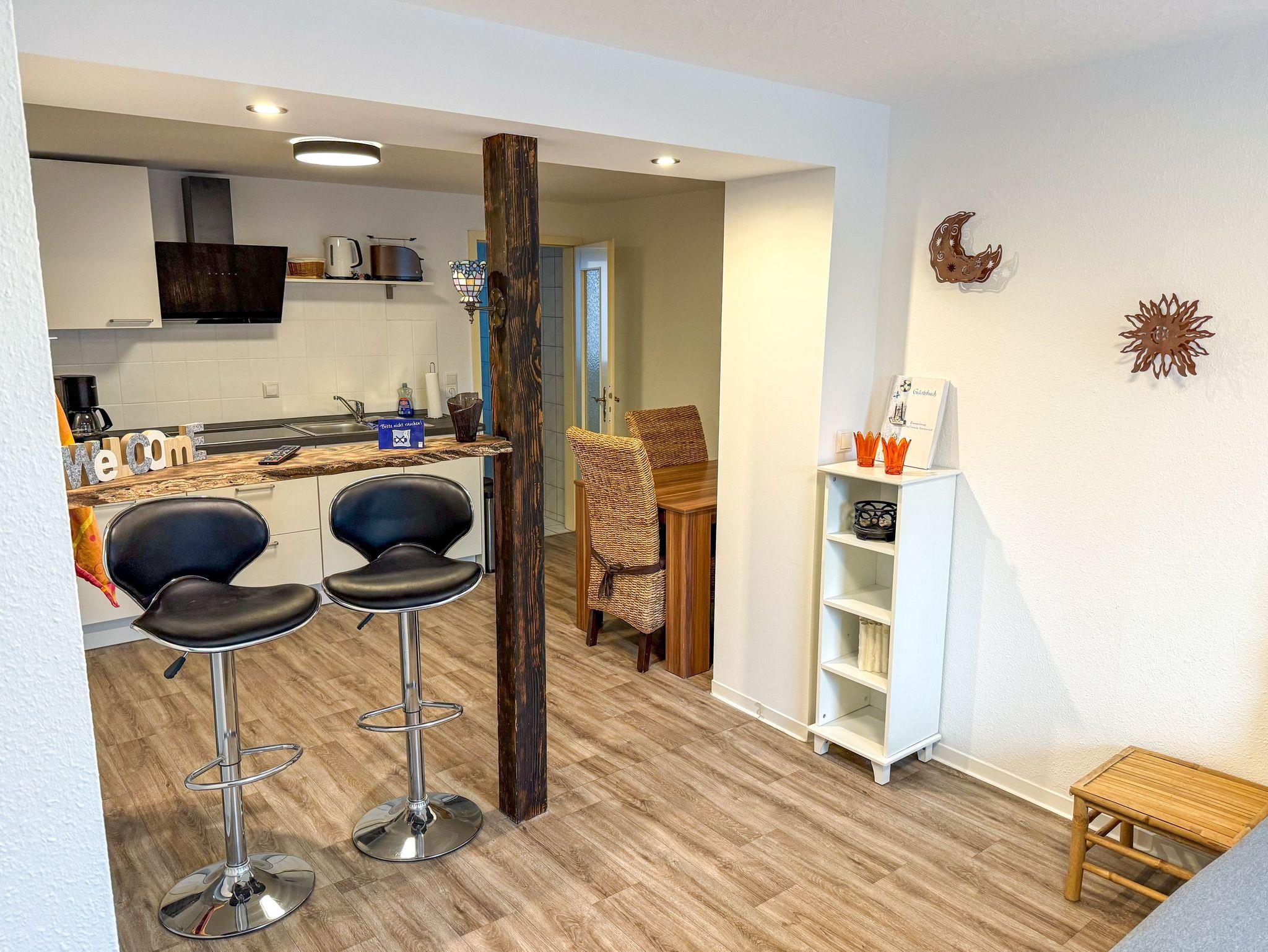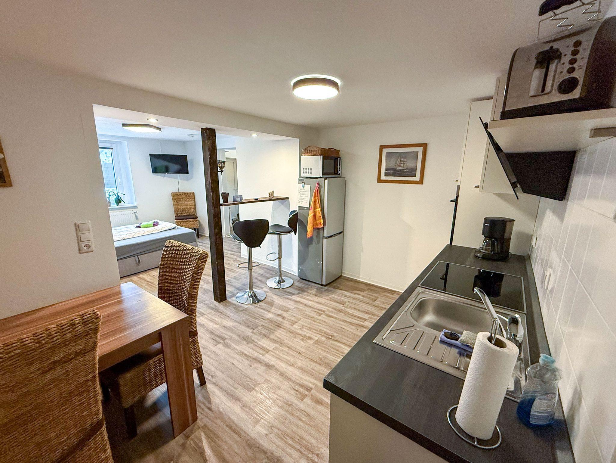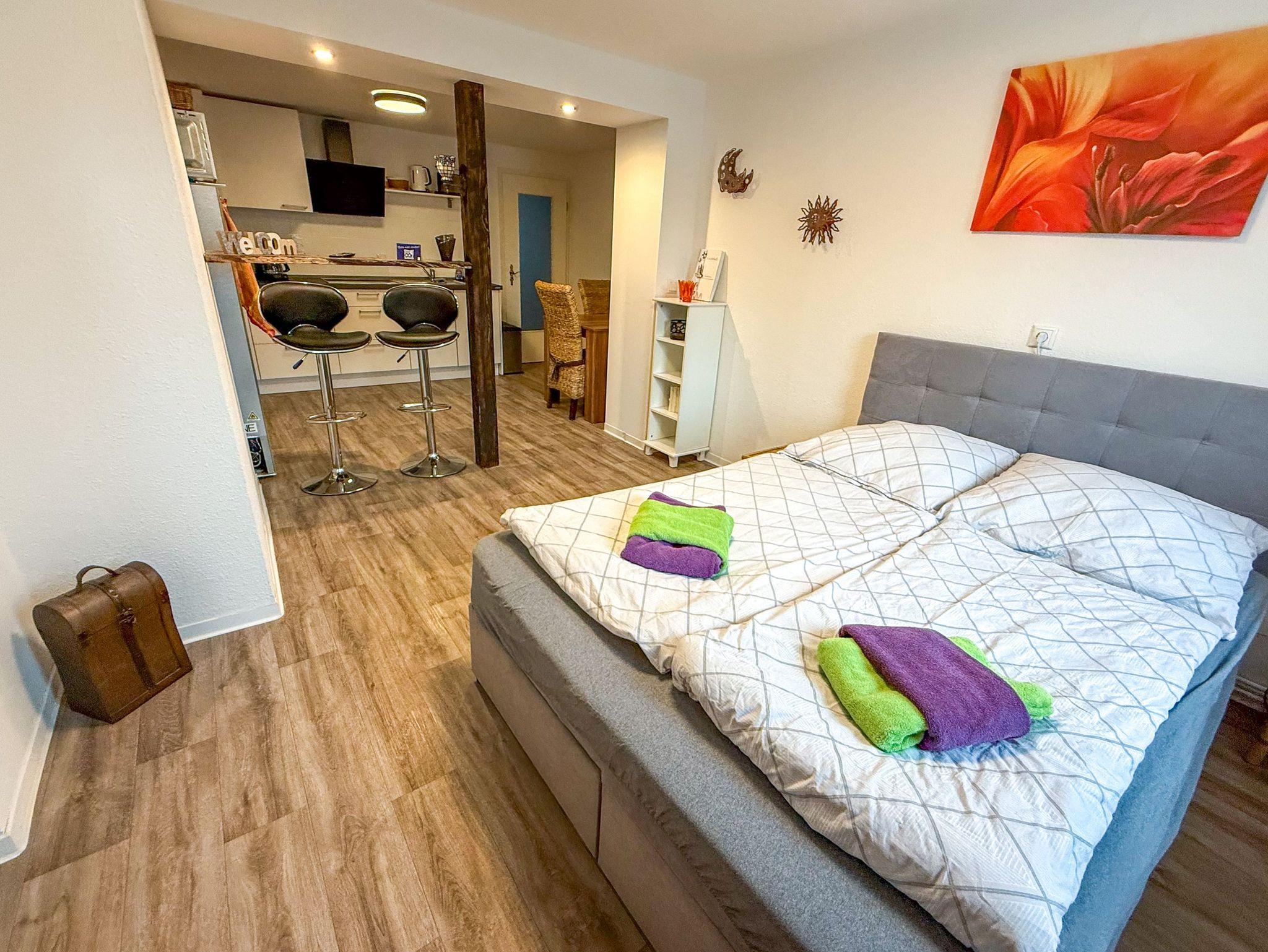 Die Ferienwohnung am Golfplatz ist ideal für Paare oder Alleinreisende und bietet auf 30 m² alles, was du für einen entspannten Aufenthalt brauchst. Sie liegt im Erdgeschoss und hat einen eigenen Eingang ? so kannst du deinen Urlaub in Ruhe genießen. Im kombinierten Wohn- und Schlafbereich sorgt ein bequemes Doppelbett (140x200) für erholsame Nächte - hier kannst du den Tag entspannt vor dem TV ausklingen lassen. Optisch wird der Schlafbereich von einem Balken mit Hochtisch und zwei Barstühlen von der Küche getrennt, was eine lockere Atmosphäre schafft. Die offene Küche mit Esstisch ist bestens ausgestattet: Backofen, Herd, Spülmaschine, Kühlschrank mit Gefrierfach, Mikrowelle, Kaffeemaschine, Wasserkocher und sogar ein Radio sorgen dafür, dass es dir beim Kochen an nichts fehlt. Das Tageslichtbad punktet mit einer Badewanne, die zum Entspannen nach einem erlebnisreichen Tag einlädt. Im Flur findest du eine Garderobe und einen Kleiderschrank ? hier kannst du deine Sachen ordentlich verstauen. Für gemütliche Stunden im Freien, wartet im Garten eine Sitzecke auf dich. Hier steht dir auch ein Grill für gemeinsame BBQ-Abende zur Verfügung.