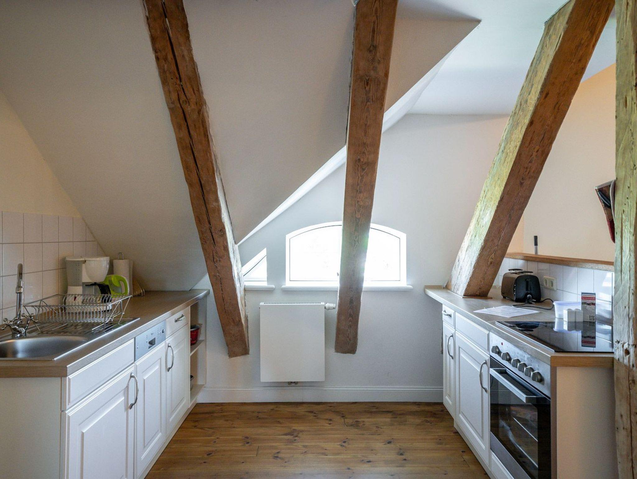 Die Ferienwohnung ist für 4 Personen geeignet und bietet 2 weitere Aufbettungsmöglichkeiten. 2 Schlafzimmer, Bad und ein offener Wohnbereich mit offener Küche sowie Essbereich gehören zu dieser Wohnung. Von der Wohnung gibt es über die Diele einen Ausgang auf die Dachterrasse. Die Ferienwohnung Mardereck teilt sich die Dachterrasse mit der Wohnung Gaubenblick.