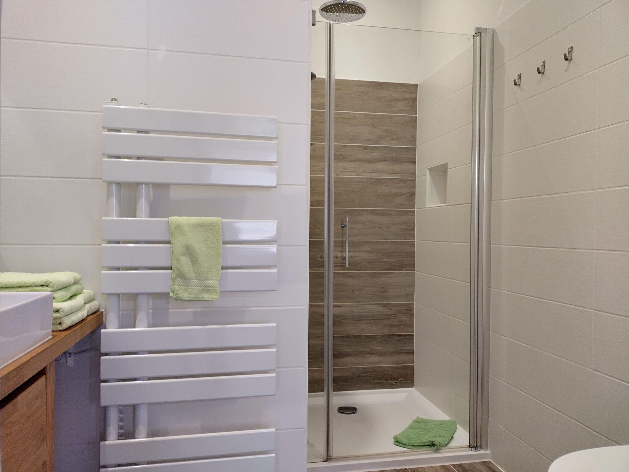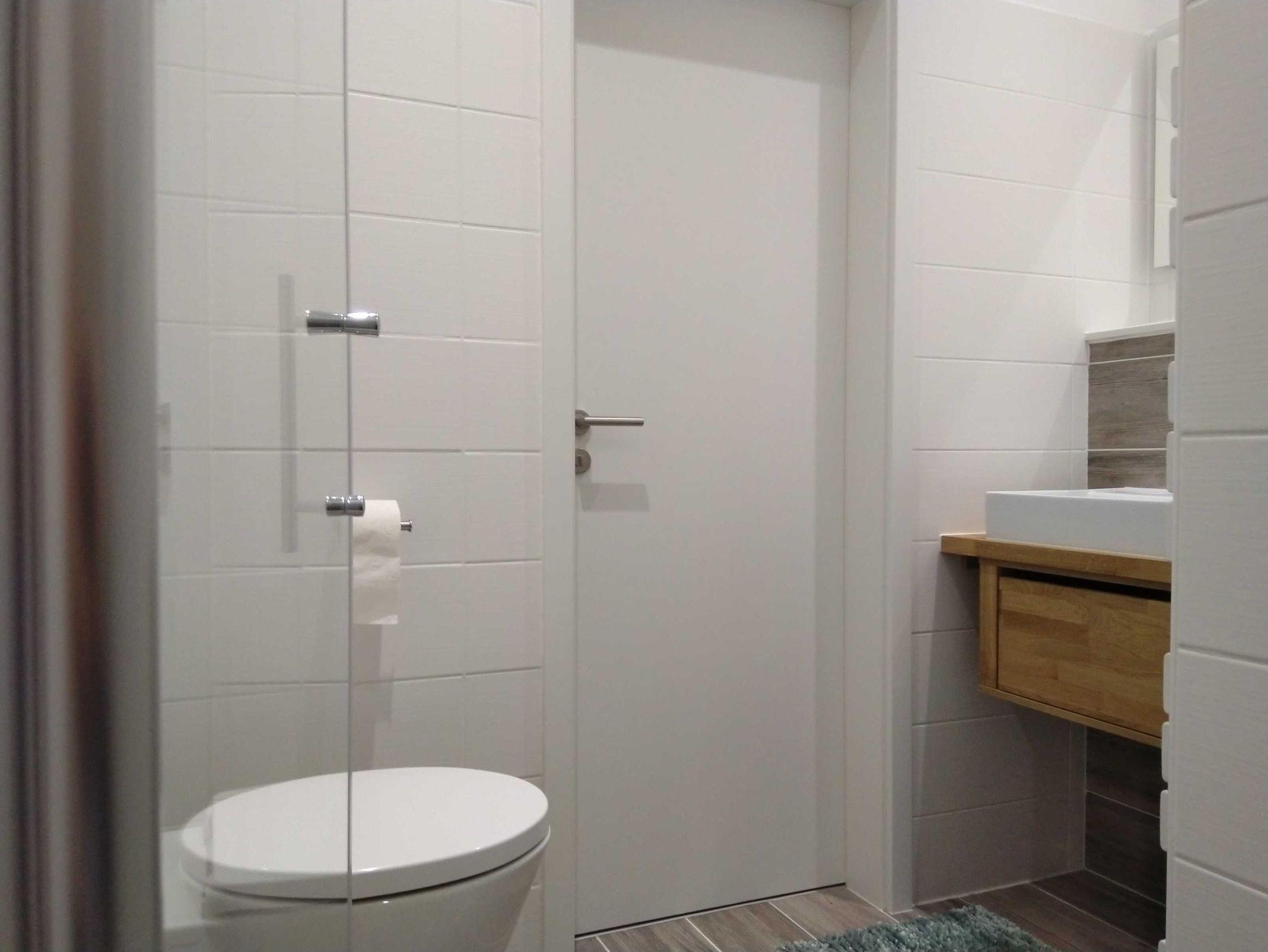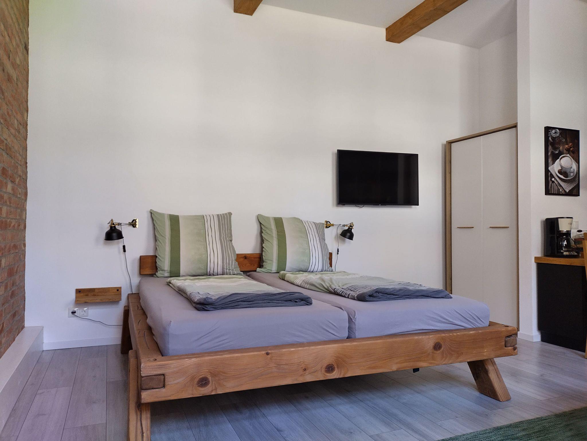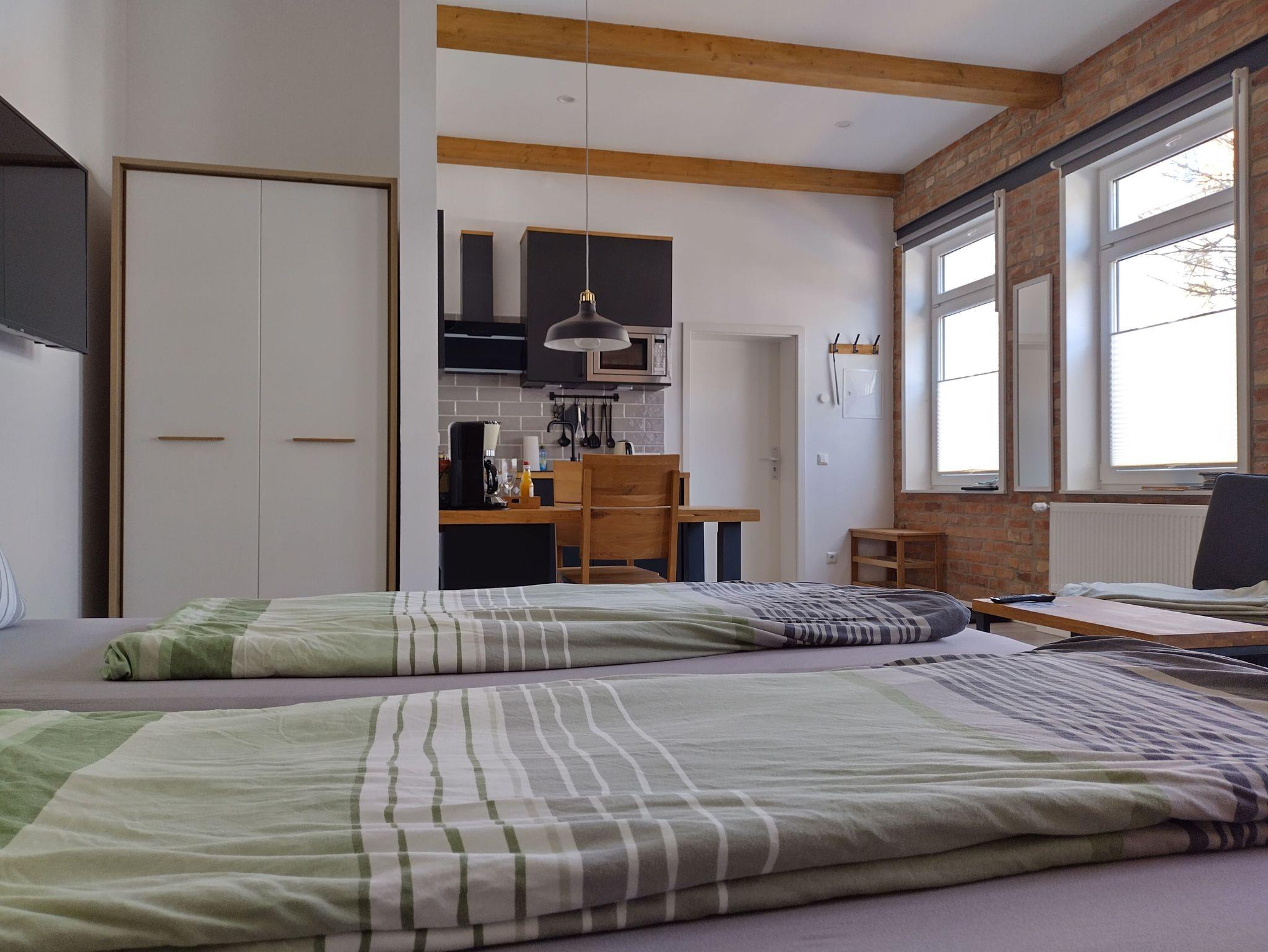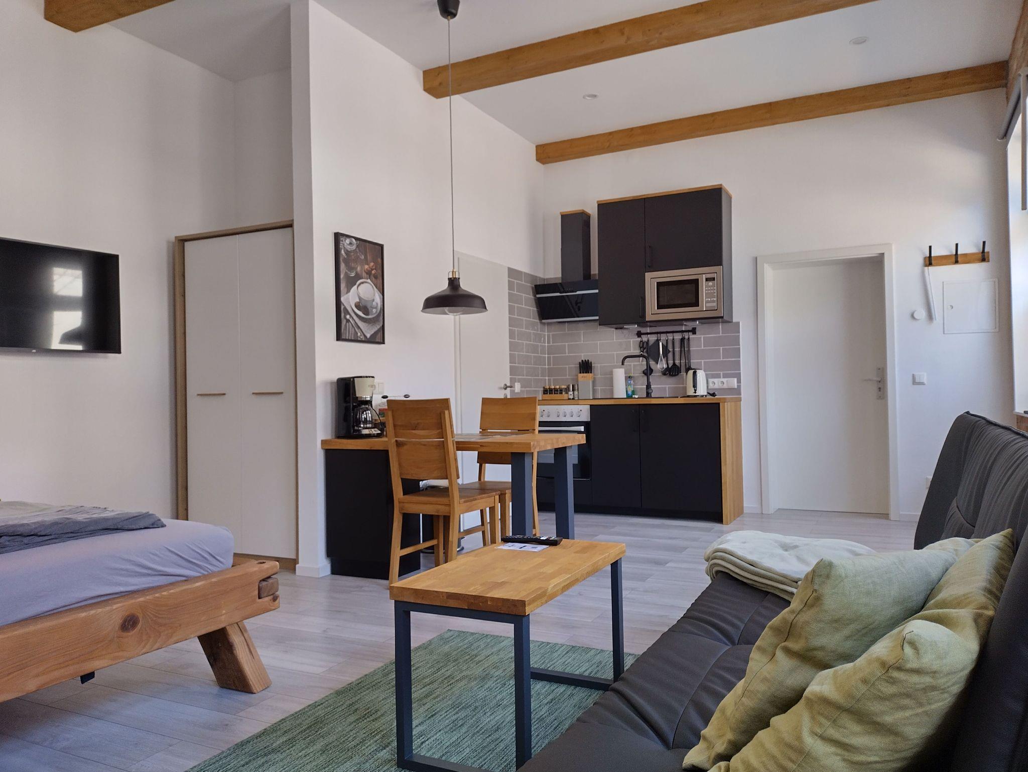 Die Ferienwohnung besteht aus einem großen Wohn-/Schlafbereich mit einer offenen Küche, einem Badezimmer mit WC und Dusche, einem Essbereich mit Tisch und 2 Stühlen und einer Garderobe.