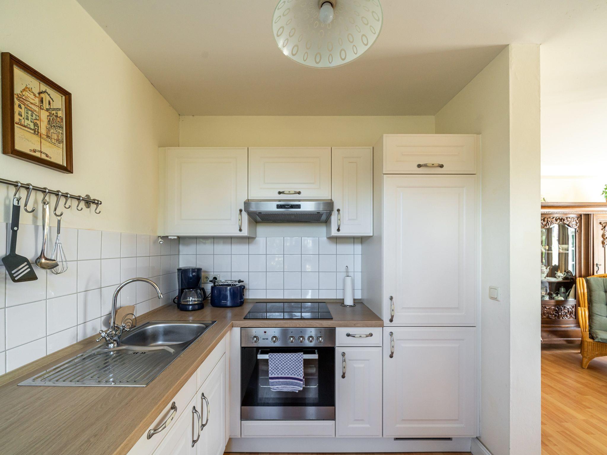 Die Küche hat eine Kühl-Gefrierkombinationen, einen Herd, einen Backofen, eine Kaffeemaschiene, einen Wasserkocher und einen Toaster.