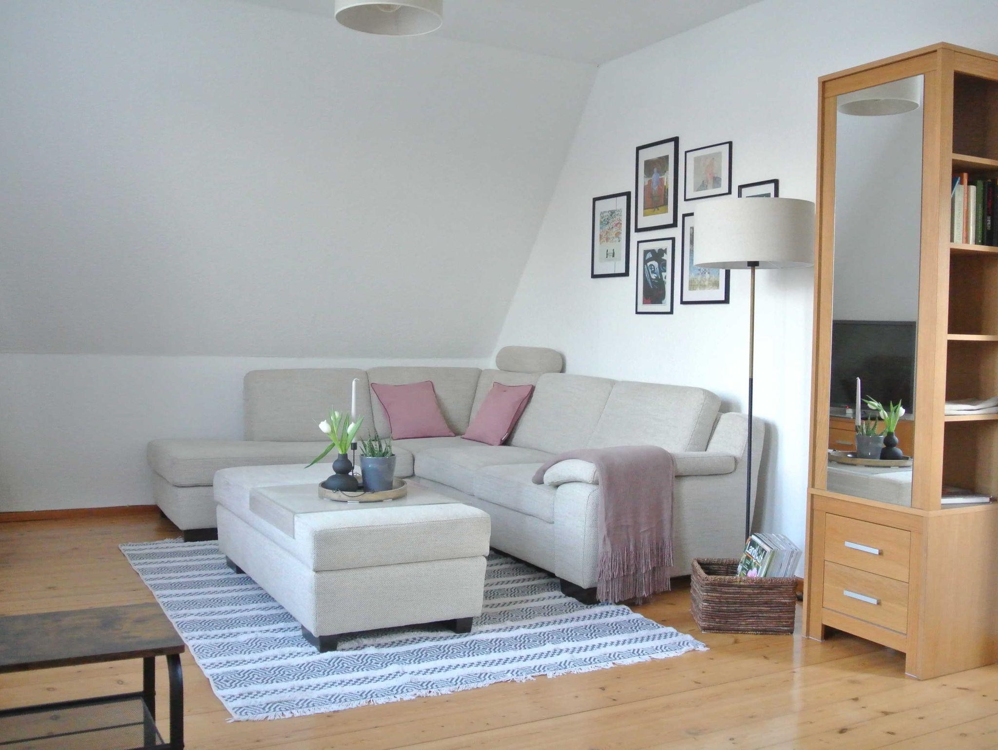 Die Ferienwohnung für max.zwei Personen ist aufgeteilt in ein Schlafzimmer mit Doppelbett und Fernseher, einen kombinierten Wohn- und Küchenbereich mit Sofa und Smart-TV, ein Badezimmer und einen Balkon.