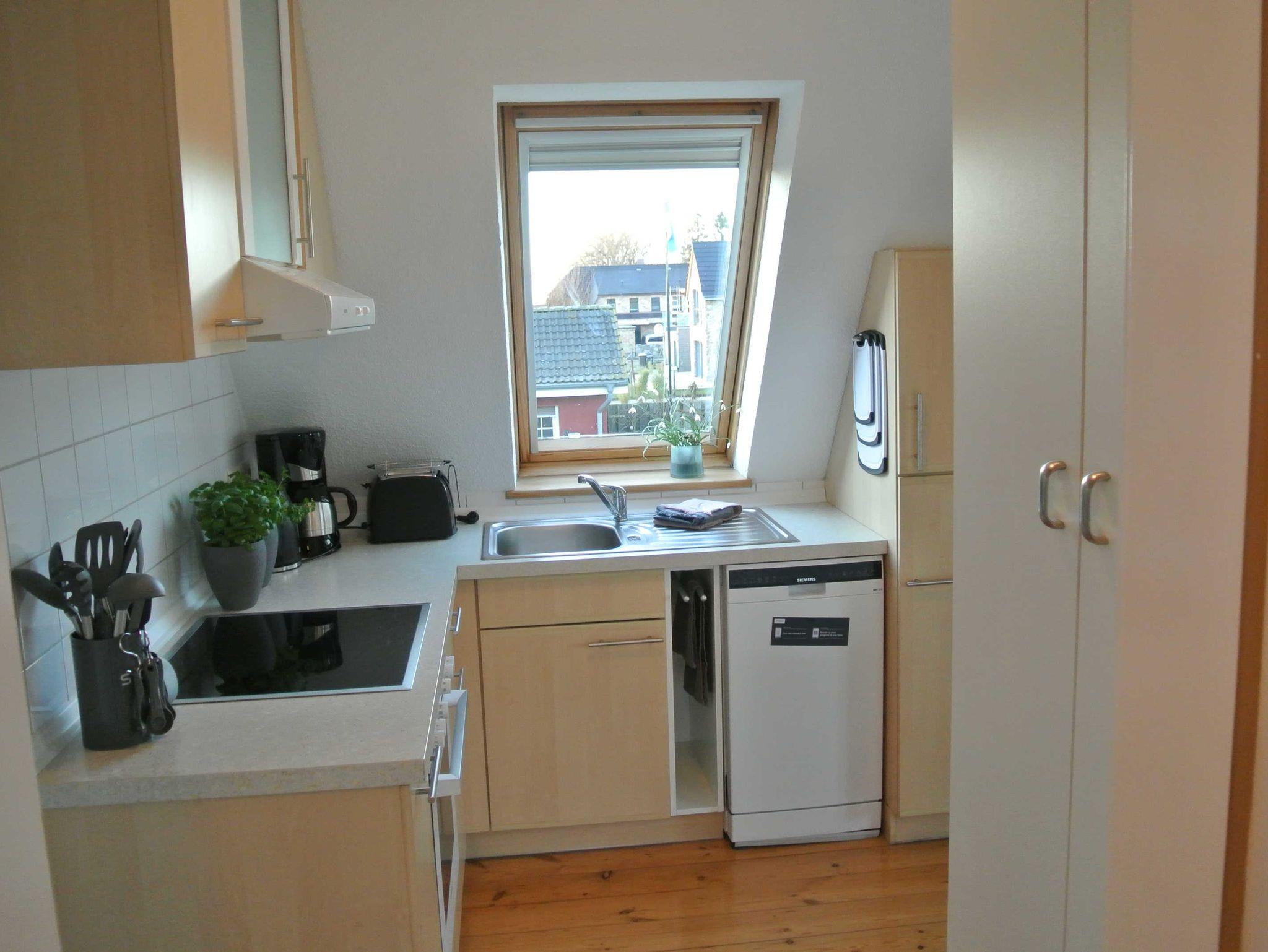 Das Badezimmer ist mit Dusche/WC und Haartrockner ausgestattet. Die offene Küche bietet unter anderem Kaffeemaschine, Wasserkocher, Toaster, Geschirrspüler, Kühlschrank mit Gefrierfach, Cerankochfeld und Backofen.