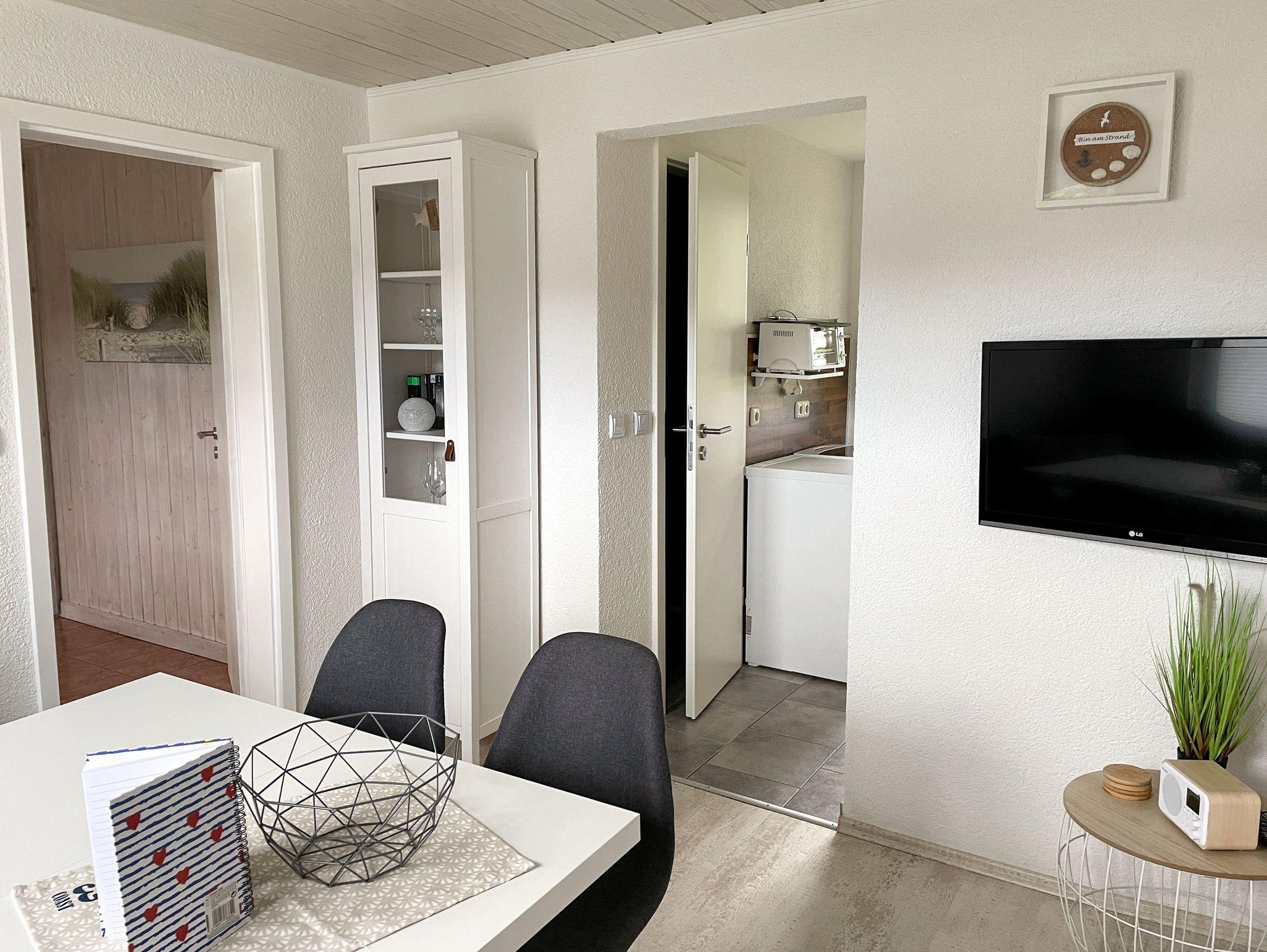 In der 58 m² großen Ferienwohnung von Ferien im Grünen findest du auf zwei Etagen viel Platz für bis zu fünf Personen - ideal für Familien oder kleine Gruppen, die eine entspannte Auszeit in der Natur suchen. Die Wohnung befindet sich im separaten Haus auf dem Grundstück der Vermieter und verbindet Gemütlichkeit mit praktischer Ausstattung. Im Erdgeschoss erwartet dich ein einladendes Wohnzimmer mit bequemen Sofa, TV und einem Essbereich, an dem ihr gemeinsam essen oder Spieleabende verbringen könnt. Gleich daneben liegt die Küche - ausgestattet mit Kühlschrank, Backofen, Mikrowelle, Wasserkocher und Kaffeemaschine - perfekt für alle, die sich auch im Urlaub gern selbst versorgen. Im Dachgeschoss befinden sich zwei separate Schlafzimmer: Eines mit einem Doppelbett (180x200) und einem Einzelbett (90x200), das andere mit zwei Einzelbetten (90x200) - hier findet jeder seinen Lieblingsplatz zum Ausschlafen und Erholen. Das Badezimmer mit Dusche sowie ein separates WC sorgen für zusätzlichen Komfort - besonders bei mehreren Gästen. Vor dem Haus lädt die gemeinschaftlich genutzte, aber mit eigenen Sitzbereichen unterteilte Terrasse zum Frühstück im Freien oder einem entspannten Abend unter freiem Himmel ein. So genießt du Ruhe und Privatsphäre - mitten im Grünen.