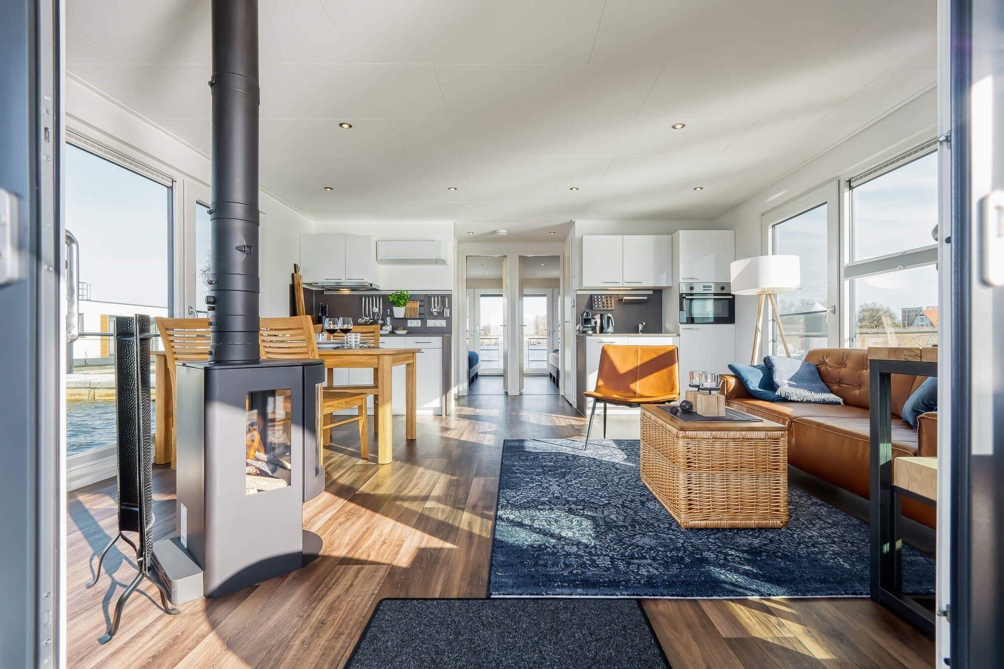 Alles inklusive lautet für Sie als Gast das Credo, wenn Sie das schwimmende Haus MEIN LIEBLINGSBOOT buchen. Frisch bezogen sind die Boxspringbetten mit weichem Topper bei Ihrer Ankunft. Handtücher werden jede Woche gewechselt und die Gasflasche für den Kamin steht bereit.