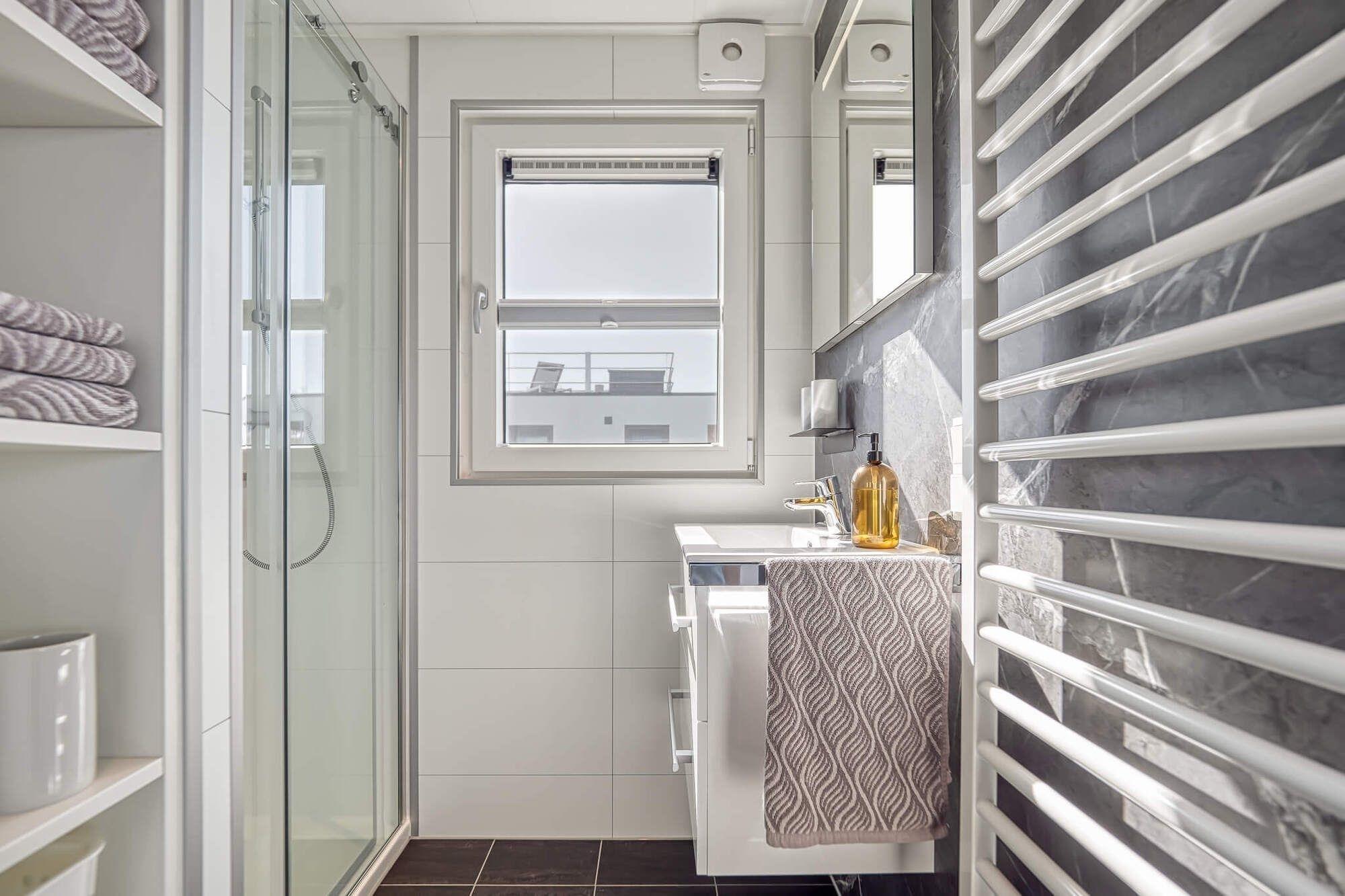 - gefliestes Bad mit Dusche, Waschbecken mit Unterschrank, Fön und LED-Spiegel