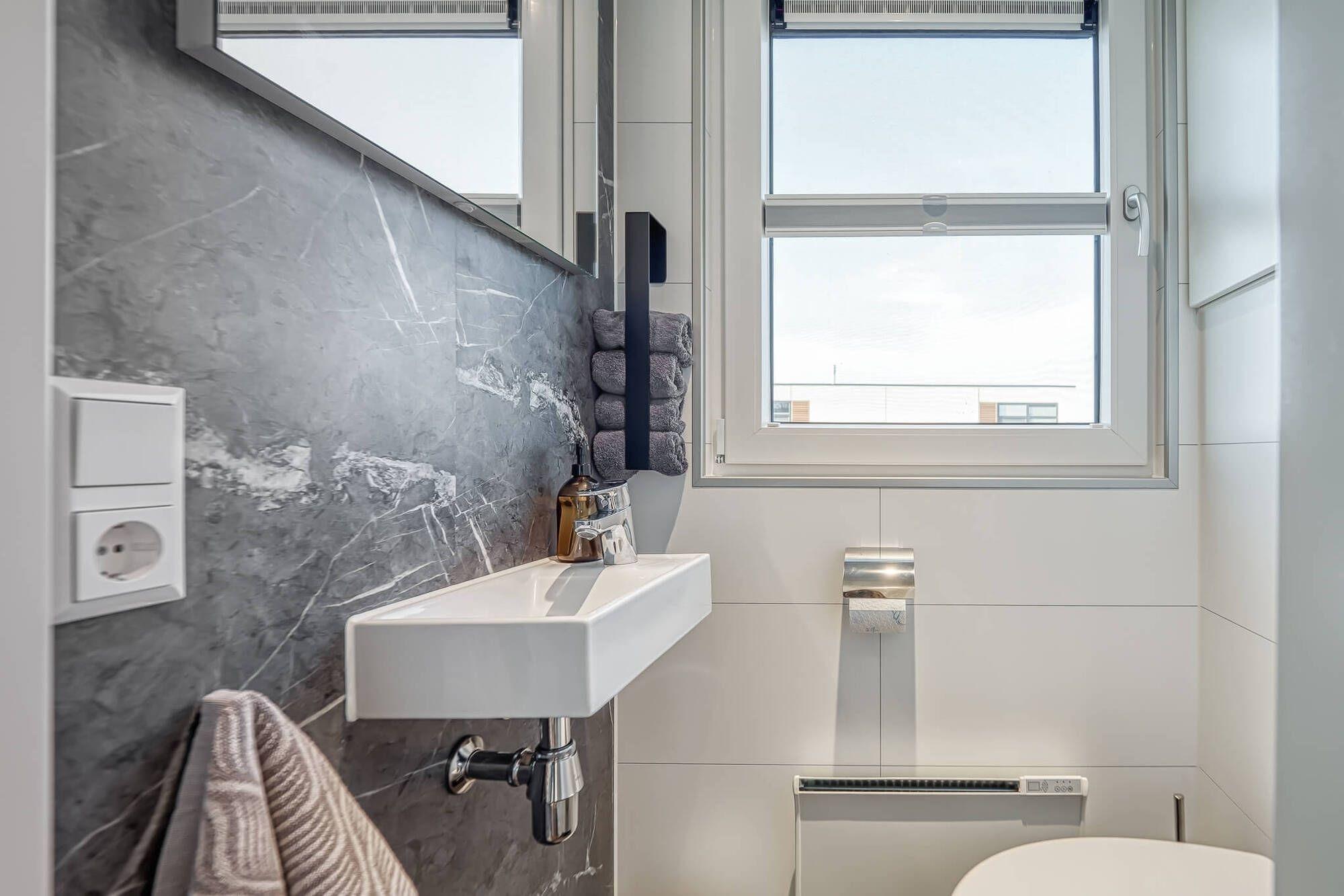 - geflieste Toilette mit Waschbecken und LED-Spiegel
