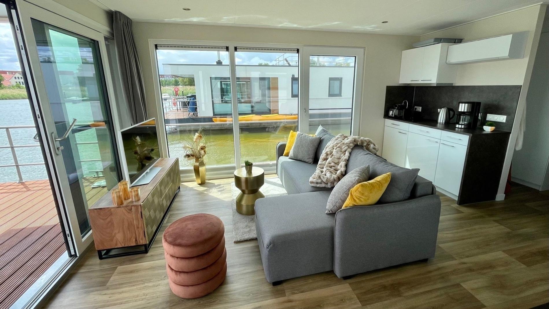 In einer der schönsten Ferienregionen an der Ostsee erwartet Sie ein Urlaub in einem luxuriös ausgestatteten schwimmenden Haus. Durch das Wohnen auf dem Wasser und dem atemberaubenden Ausblick stellt sich schon nach wenigen Stunden pure Erholung ein, und Sie möchten Ihr Feriendomizil kaum mehr verlassen. Schlaf- und Wohnbereich sind stilvoll eingerichtet. Die beiden getrennten Schlafzimmer mit Doppelbetten, die voll ausgestattete Küche und das moderne Dusch-Bad mit separater Toilette bieten allen Komfort, der einen erholsamen Urlaub garantiert.
