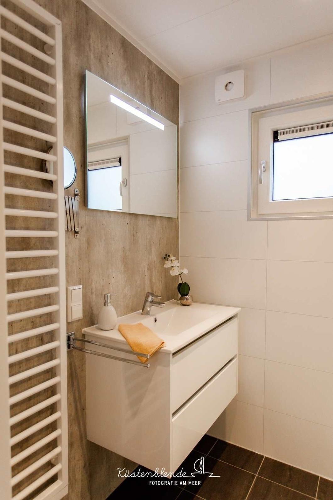 - gefliestes Bad mit Dusche, Waschbecken mit Unterschrank, Fön und LED-Spiegel