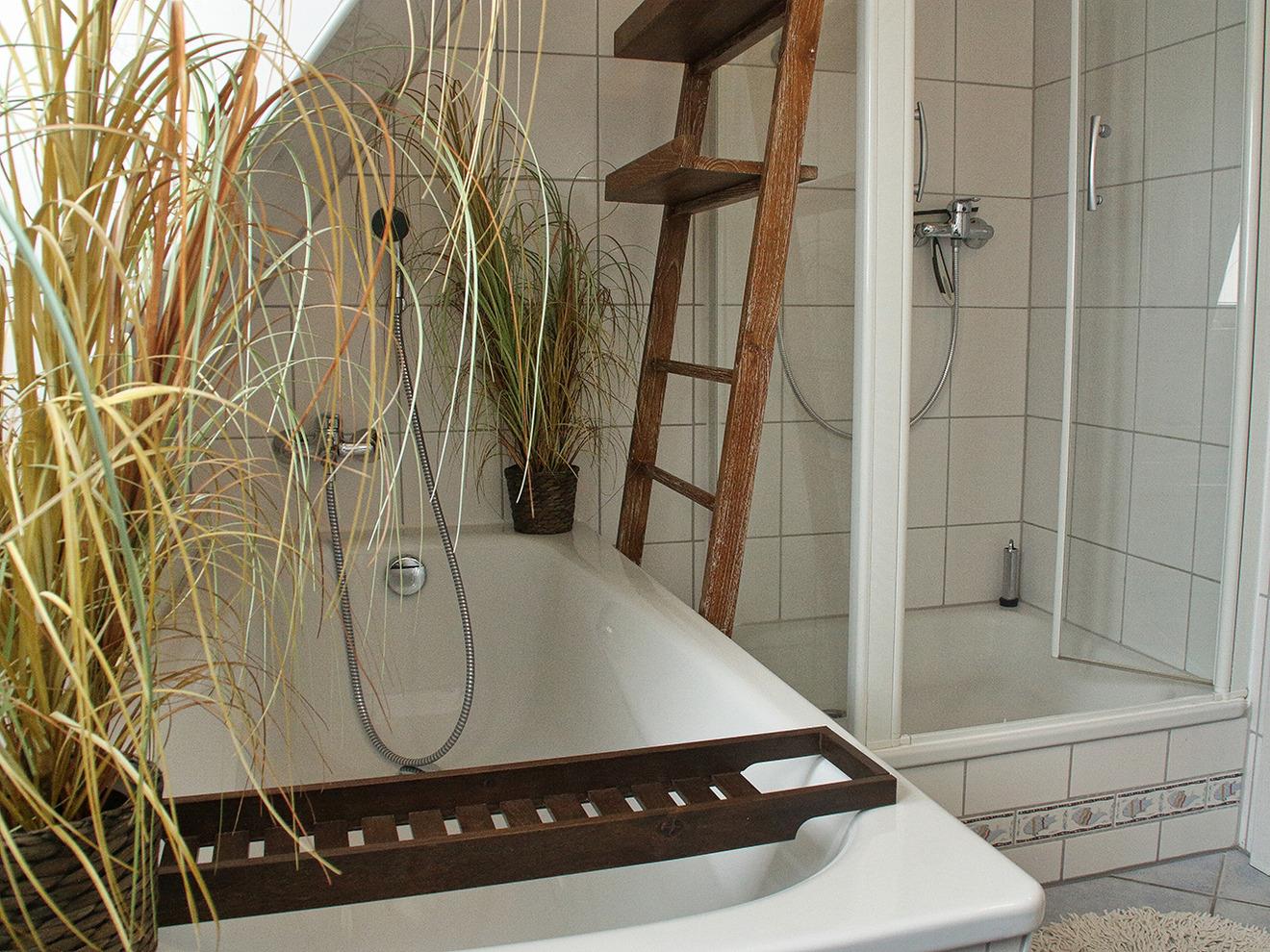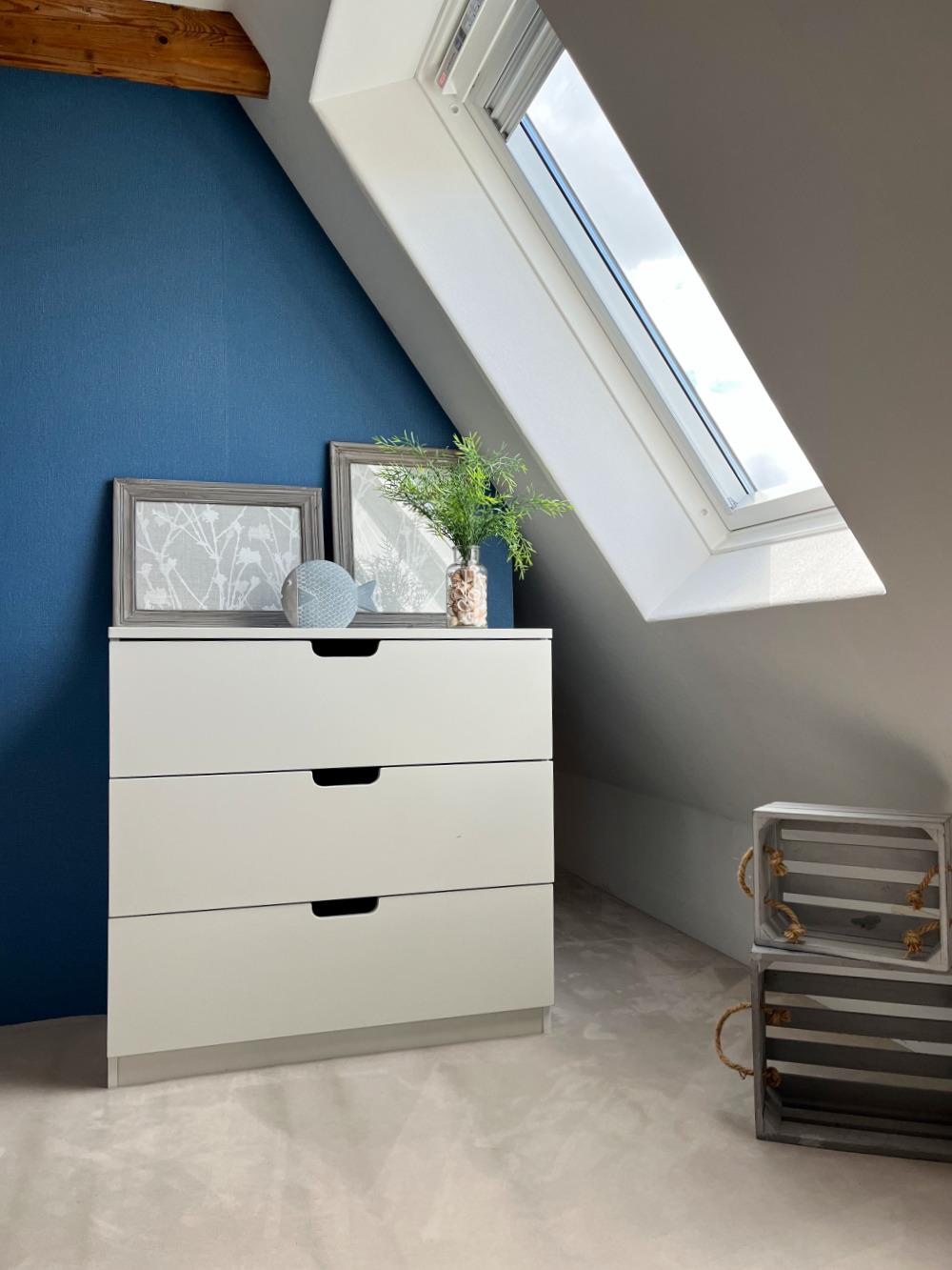Im Obergeschoss befinden sich das große Schlafzimmer für zwei Personen, das kleine Schlafzimmer mit einem Kojenbett, das sich bei Bedarf zum Doppelbett umwandeln lässt und einer 1,40 m breiten Matratze in einer kuscheligen Schlafnische und das maritime Vollbad mit Badewanne, Dusche und Toilette.