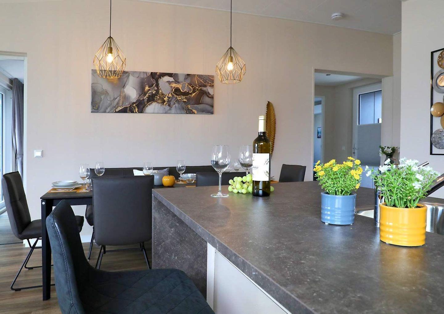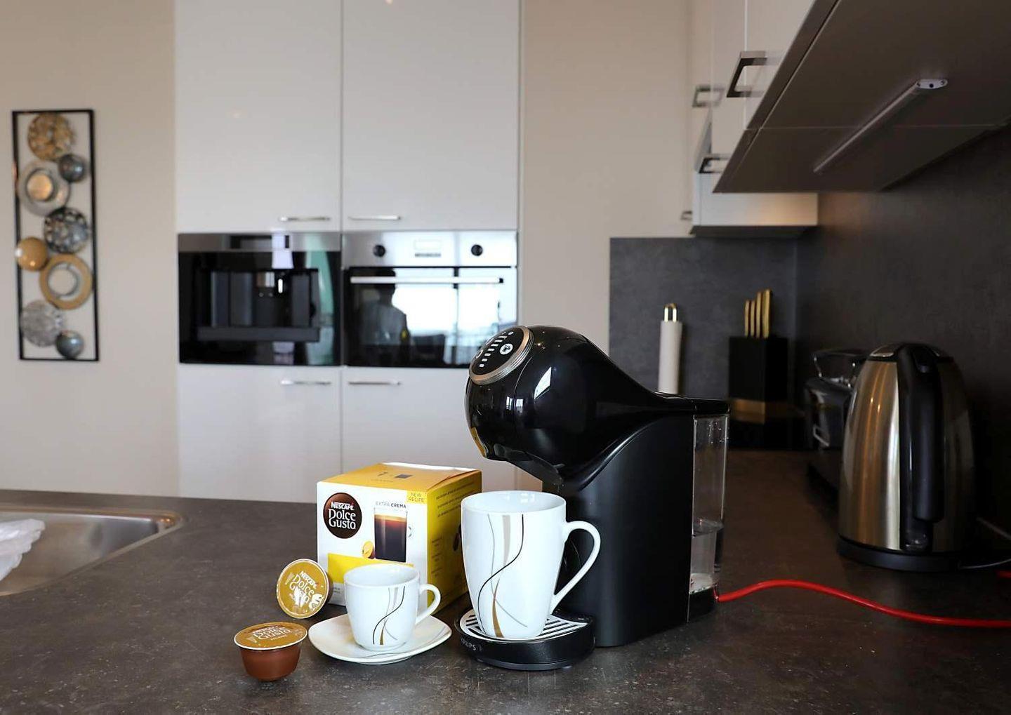 Die offene Küche ist zum Wohnzimmer hin gestaltet und vollständig eingerichtet. Sie kochen auf einem Ceran-Herd und nutzen Spülmaschine, Kühlschrank mit Gefrierfach, Kaffeemaschine, Wasserkocher, Toaster sowie Küchenutensilien, Geschirr und Besteck. Auch Geschirrhandtücher und Abfalleimer sind vorhanden – ideal für die unkomplizierte Selbstversorgung.