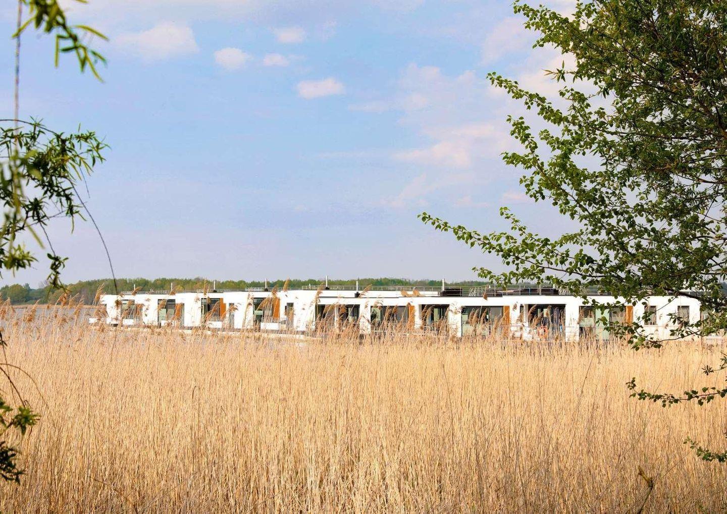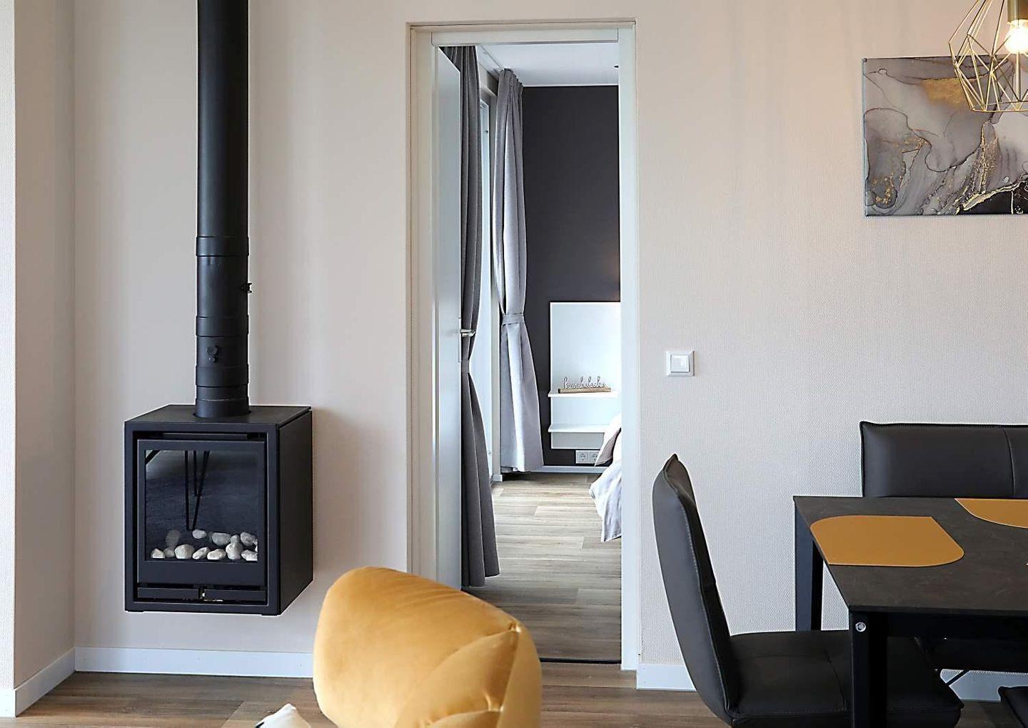 Genießen Sie Seeblick und Komfort in der Floatinghouse Bernstein Suite am Wasser mit Terrasse und Kamin.