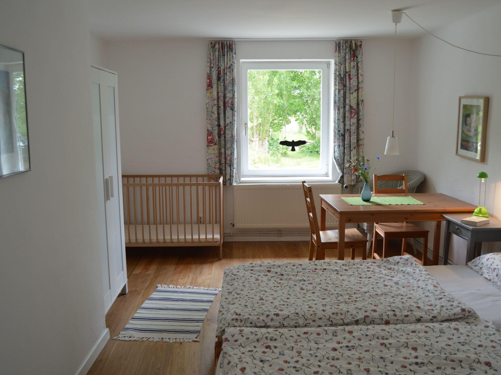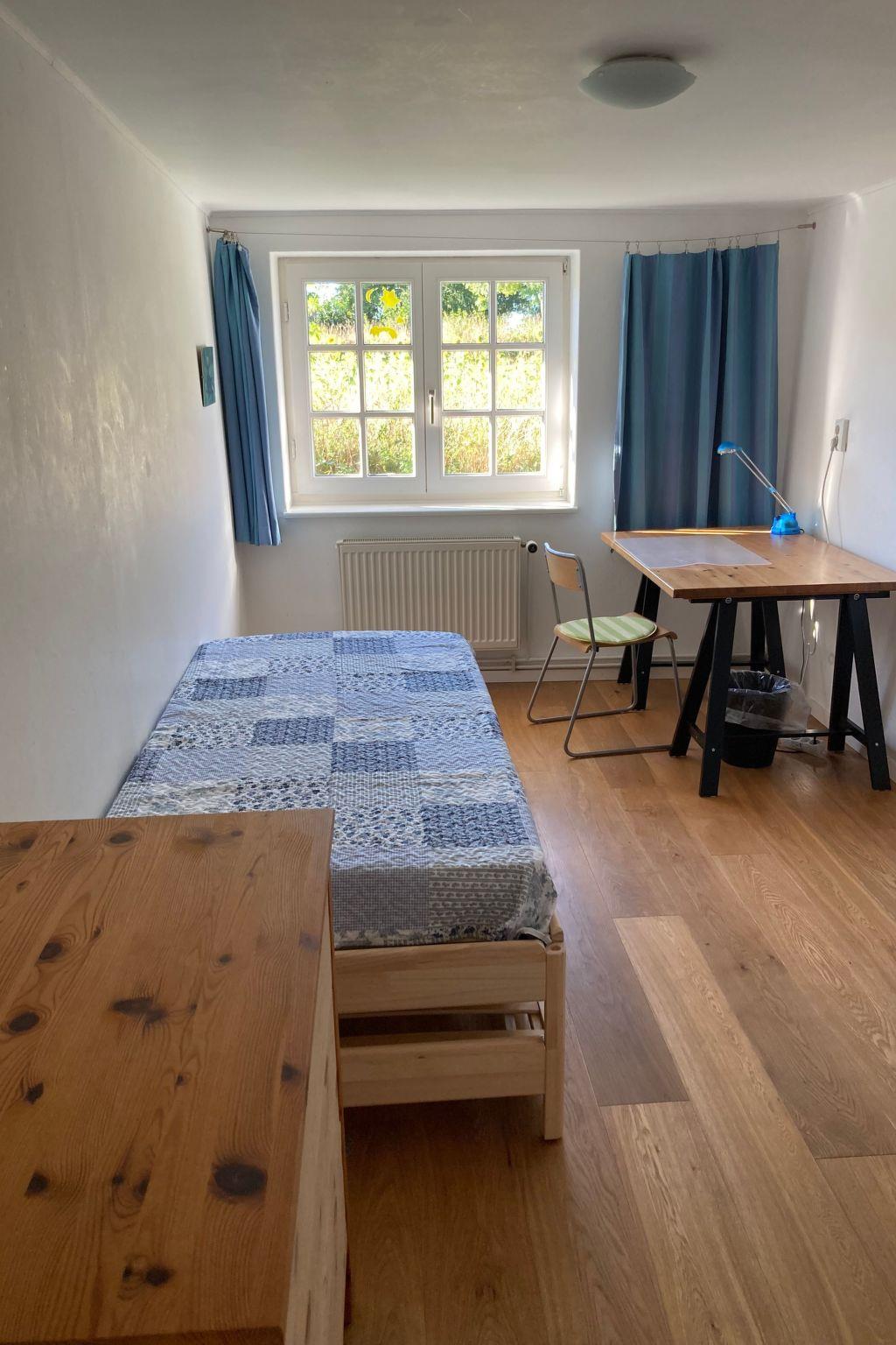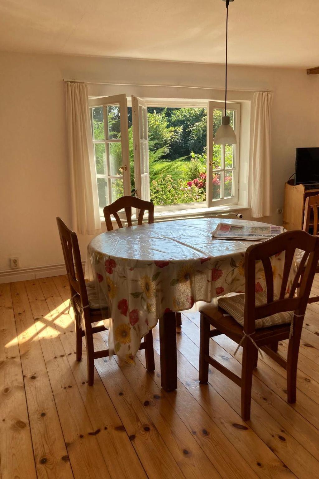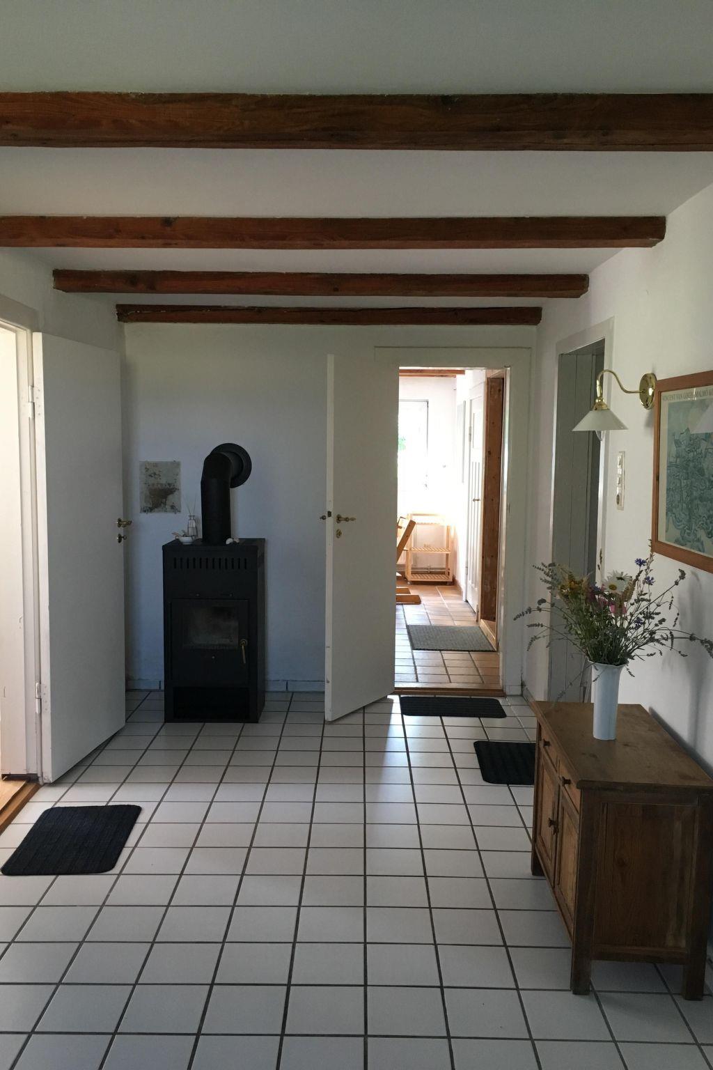 ein 34 Quadratmeter großes Wohnzimmer. Die Zimmer sind geschmackvoll, funktional und teilweise mit antiken Möbeln ausgestattet. Ein neuer edler Eichenparkettboden ergänzt die vorhandenen Kieferndielenböden. In den Schlafzimmern gibt es Doppelbetten aus Einzelbetten, in den Kinderzimmern jeweils Einzelbetten. Zwei zusätzliche Kinderbetten für Kleinkinder sind vorhanden. Das Haus eignet sich vom Grundriss auch für 2 Familien mit Kindern oder für eine Familie mit Großeltern. Das Badezimmer ist mit einer Badewanne, Waschbecken und einem WC ausgestattet, ein weiteres WC mit Waschbecken gibt es in einem separaten Raum. Außerdem ist ein neues Badezimmer mit Dusche und Waschbecken vorhanden. Internetzugang (Glasfaser) ist überall in Haus und Garten und ist kostenlos.
