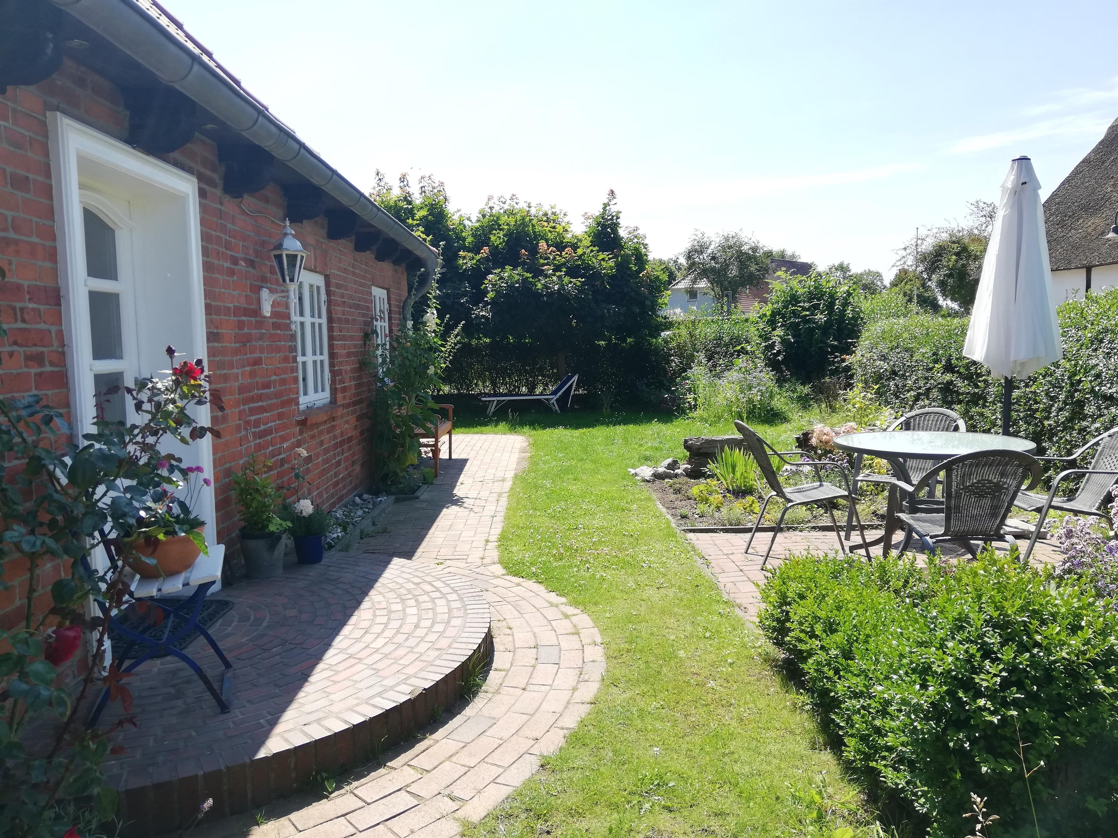 Die eigene Terrasse mit gemütlichem Sitzplatz liegt im Garten mit Wildblumen und wunderschönen Stockrosen. Kinder sind bei uns herzlich willkommen und können sich im Sandkasten und der Matschküche austoben.