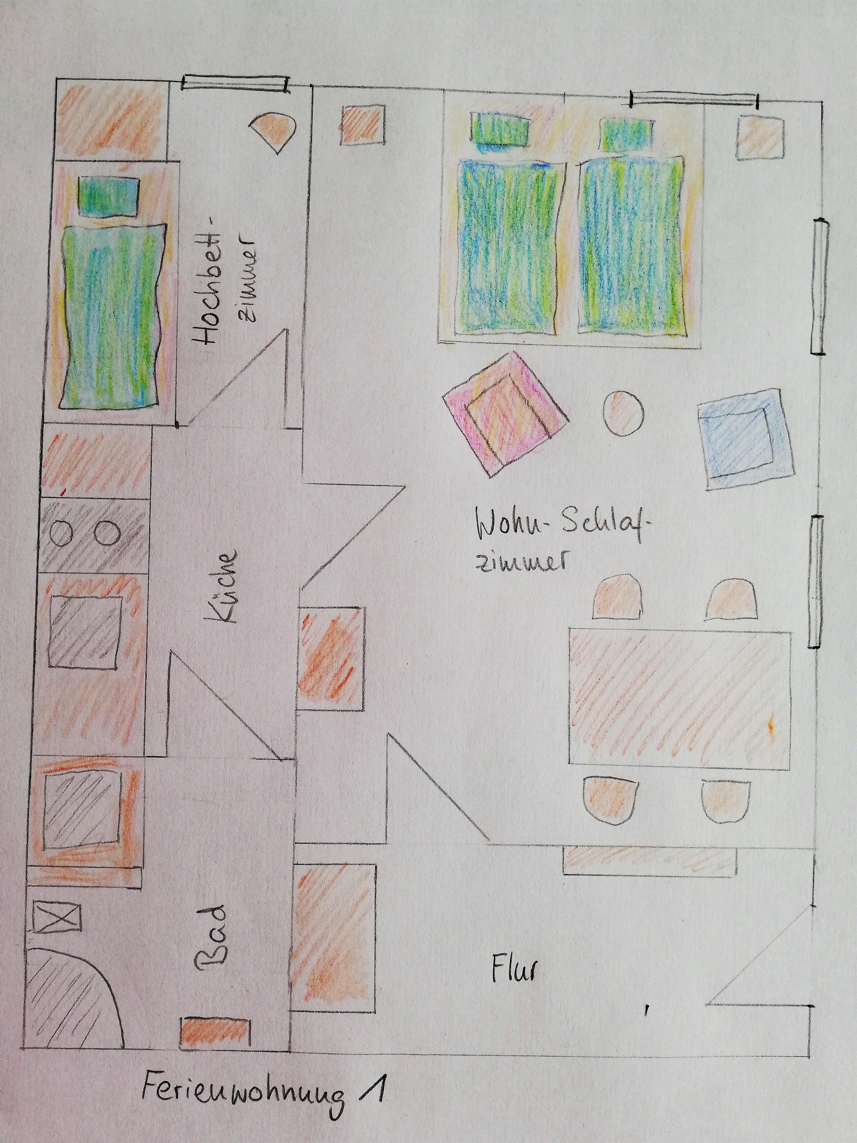 Ferienwohnung 1 bezaubert durch innenliegendes Fachwerk und die alten Kastenfenster, welche den Blick auf die dörfliche Umgebung mit Reetdächern und Bauerngärten öffnen. Sie ist geeignet für bis zu 4 Personen. Durch den eigenen Eingang gelangen Sie in den Flur und das Wohn- Schlafzimmer mit Esstisch, Sitzecke und Smart- TV und einem Doppelbett. Das gemütliche Hochbettzimmer ist besonders für Kinder geeignet, aber auch Erwachsene fühlen sich in den komfortablen Betten wohl.