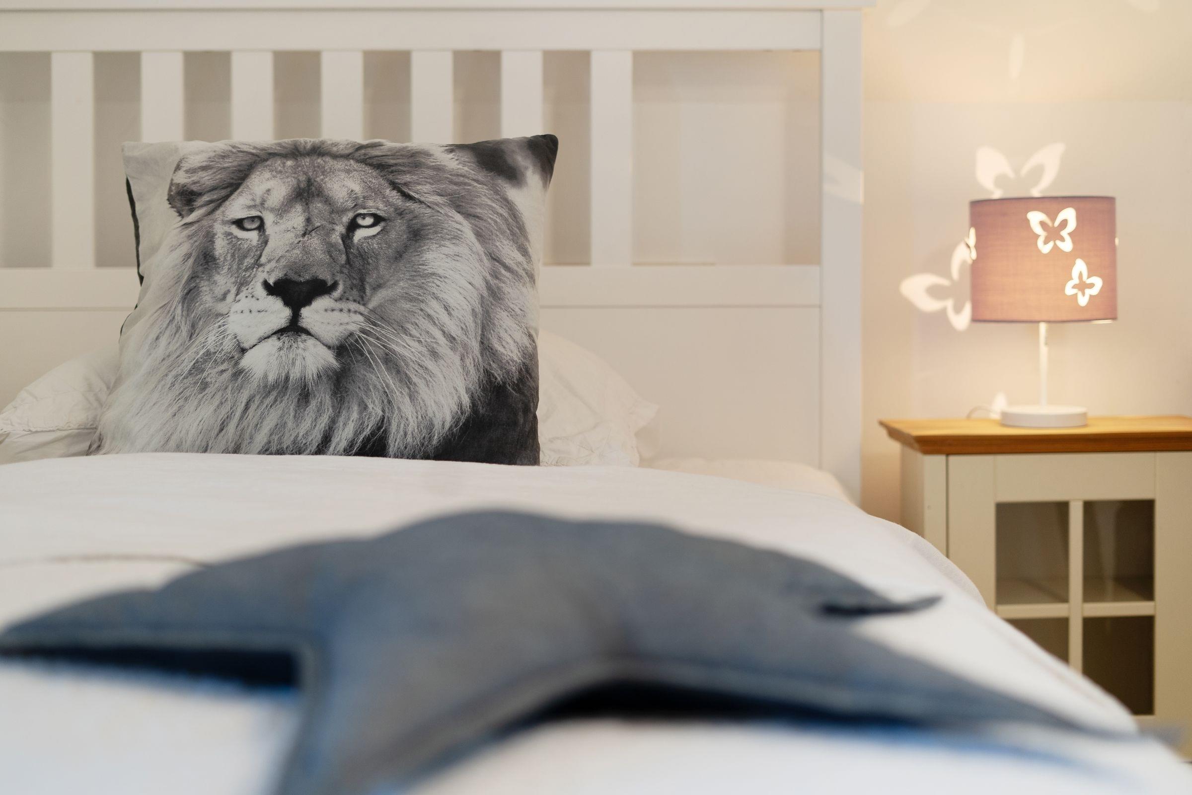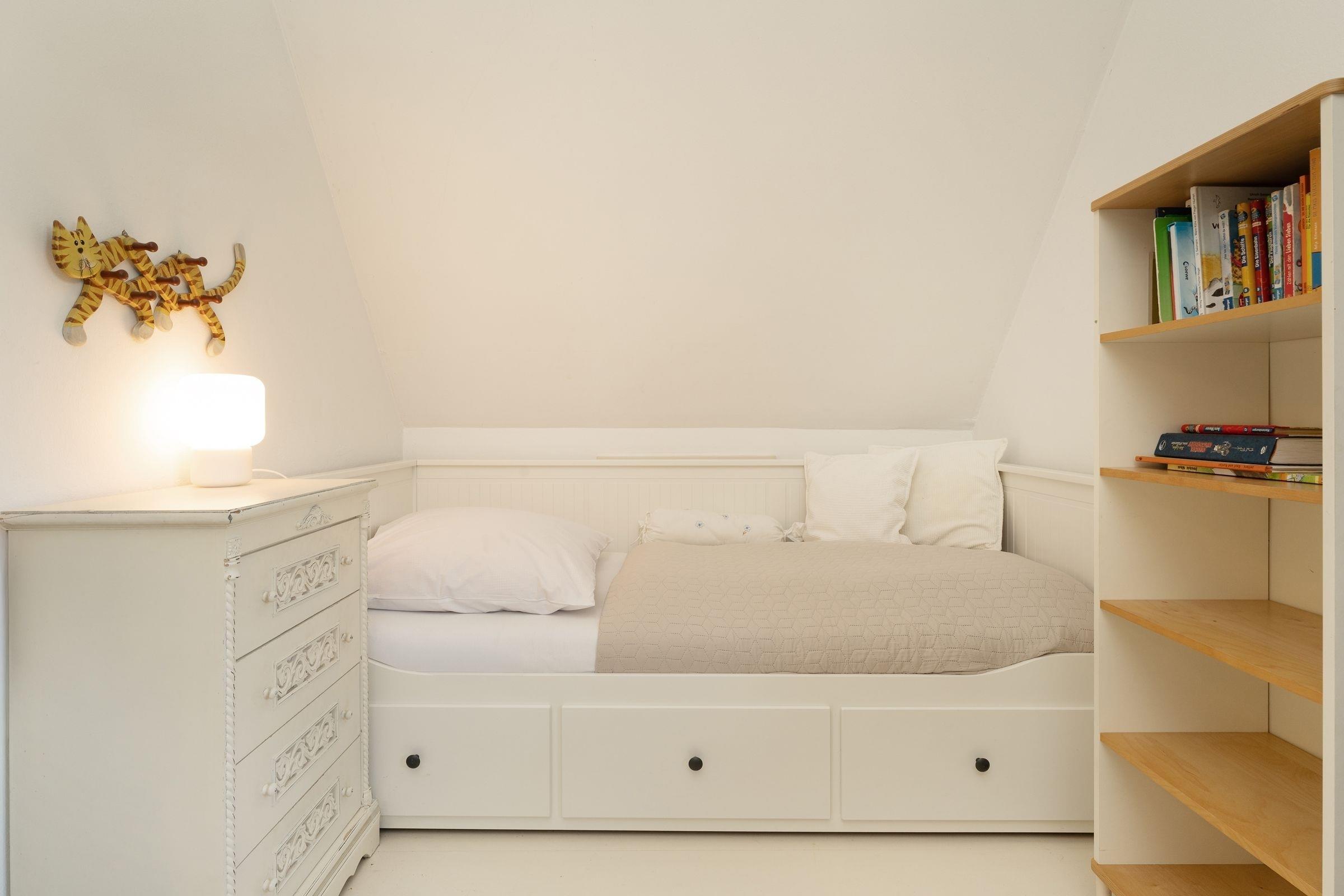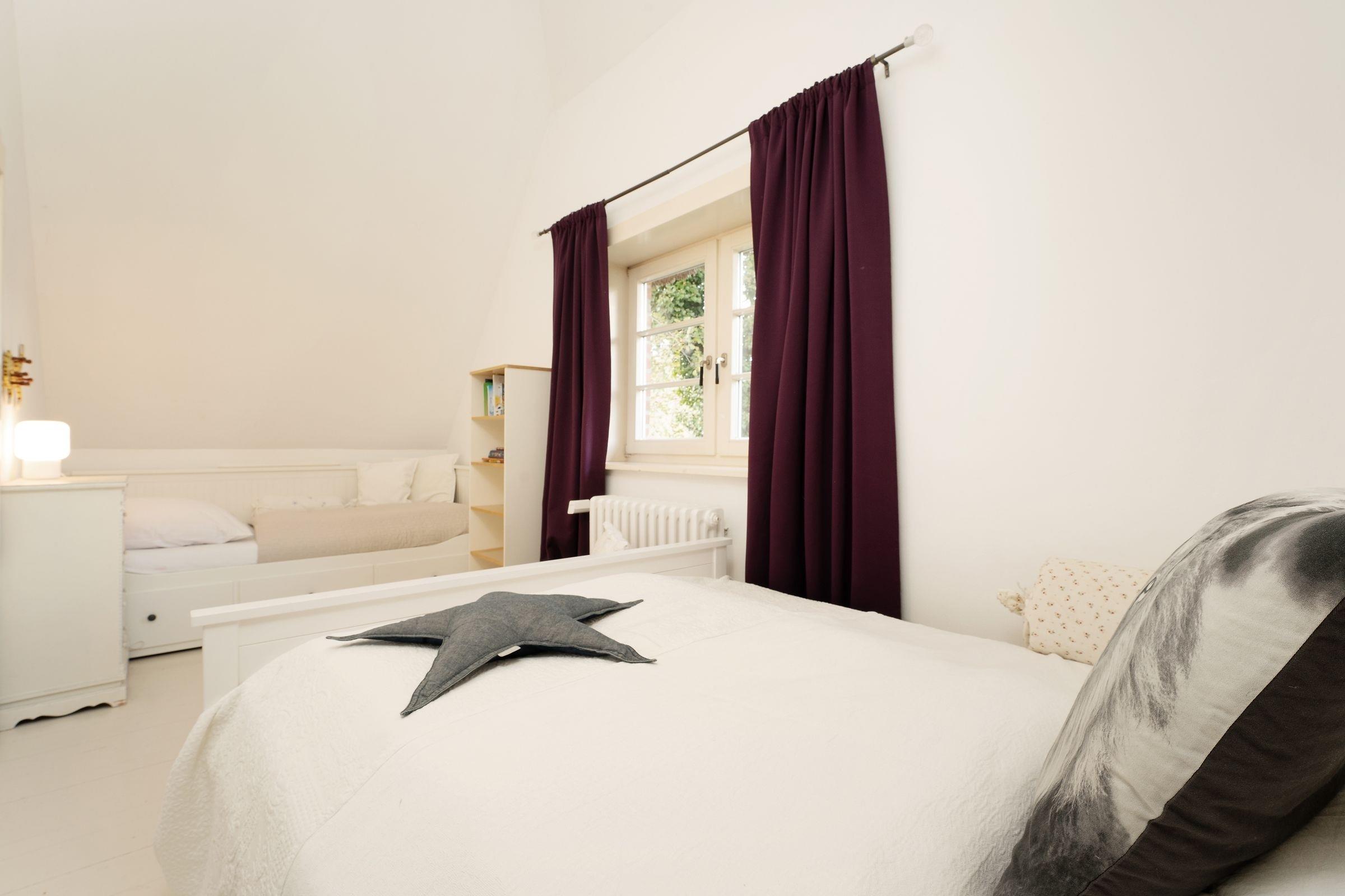Schlafzimmer 2 (OG): 1 Doppelbett (140x200 cm) und 1 Einzelbett (90x200 cm), Verdunkelung: Vorhänge, Platz für Babybett vorhanden