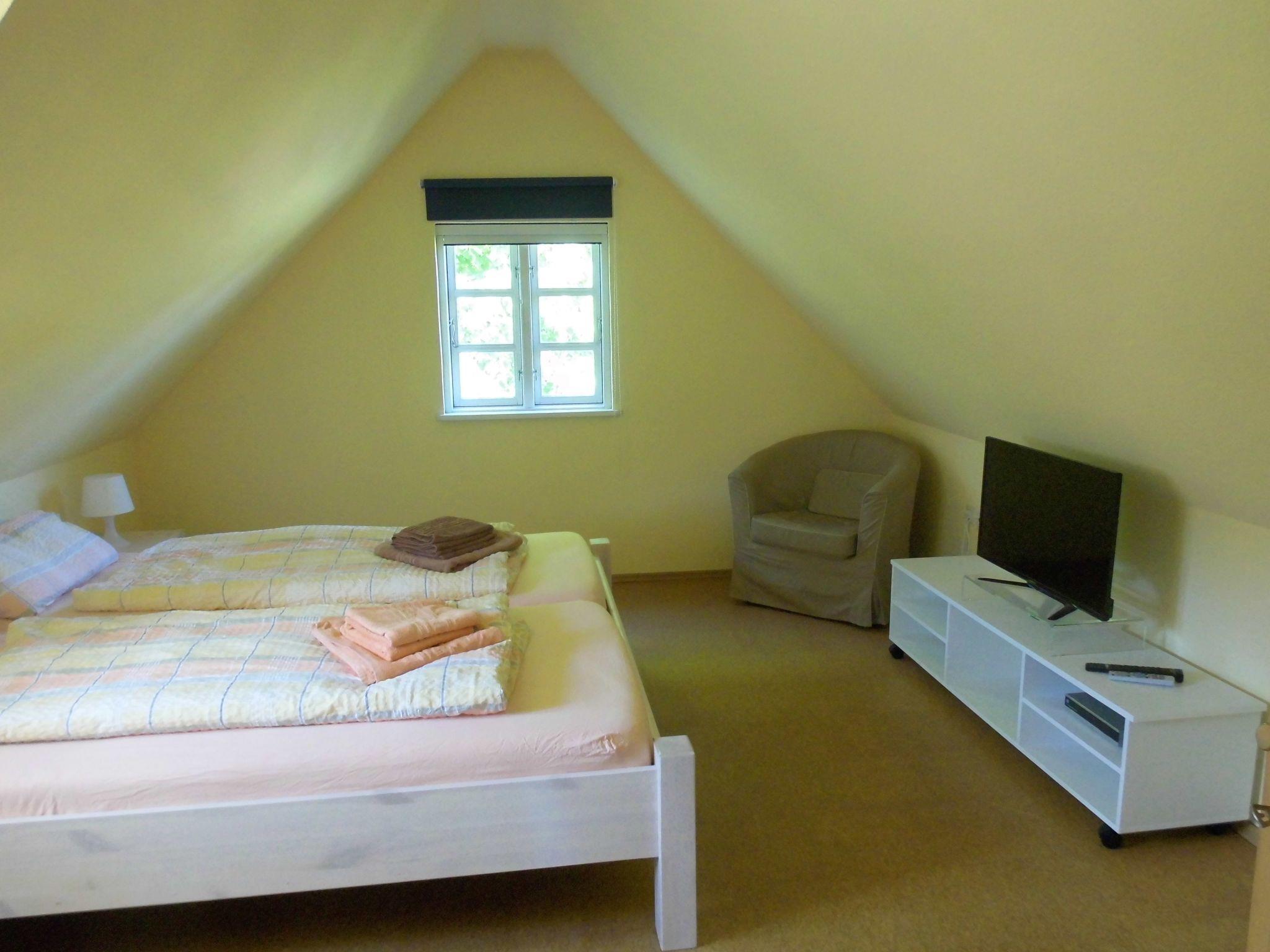 Das Haus ist ca. 90 qm groß und verfügt über vier große Räume. Im Erdgeschoss befindet sich eine sehr gut ausgestattete Wohnküche mit neuer EBK, reichlich Geschirr, Besteck und Kochutensilien, Mikrowelle, Kaffeemaschine, Toaster, Wasserkocher, Herd mit Ceranfeld und Backofen, und Geschirrspülmaschine. Weiterhin gibt es hier einen Eßtisch mit sechs Stühlen, ein Sessel und ein Sofa am Dänischen Kaminofen. Das Wohnzimmer verfügt über eine bequeme zusätzliche Schlafcouch mit Latexmatraze (für eine evtl. sechste Person), zwei Sessel und eine zweite Couch, Sat.-TV, Hifi-Anlage und einen Tisch mit vier Stühlen. Im Dachgeschoss befinden sich zwei Schlafräume mit je einem Doppelbett 180x 200cm und sehr guten Matratzen. In einem Schlafraum steht ein zweiter Sat.-TV, der zweite Schlafraum hat ein zusätzliches Einzelbett. Dieser Raum ist durch einen Paravent abgeteilt. Ausreichend Stauraum ist vorhanden. Das Bad im Erdgeschoss verfügt über eine große Dusche.