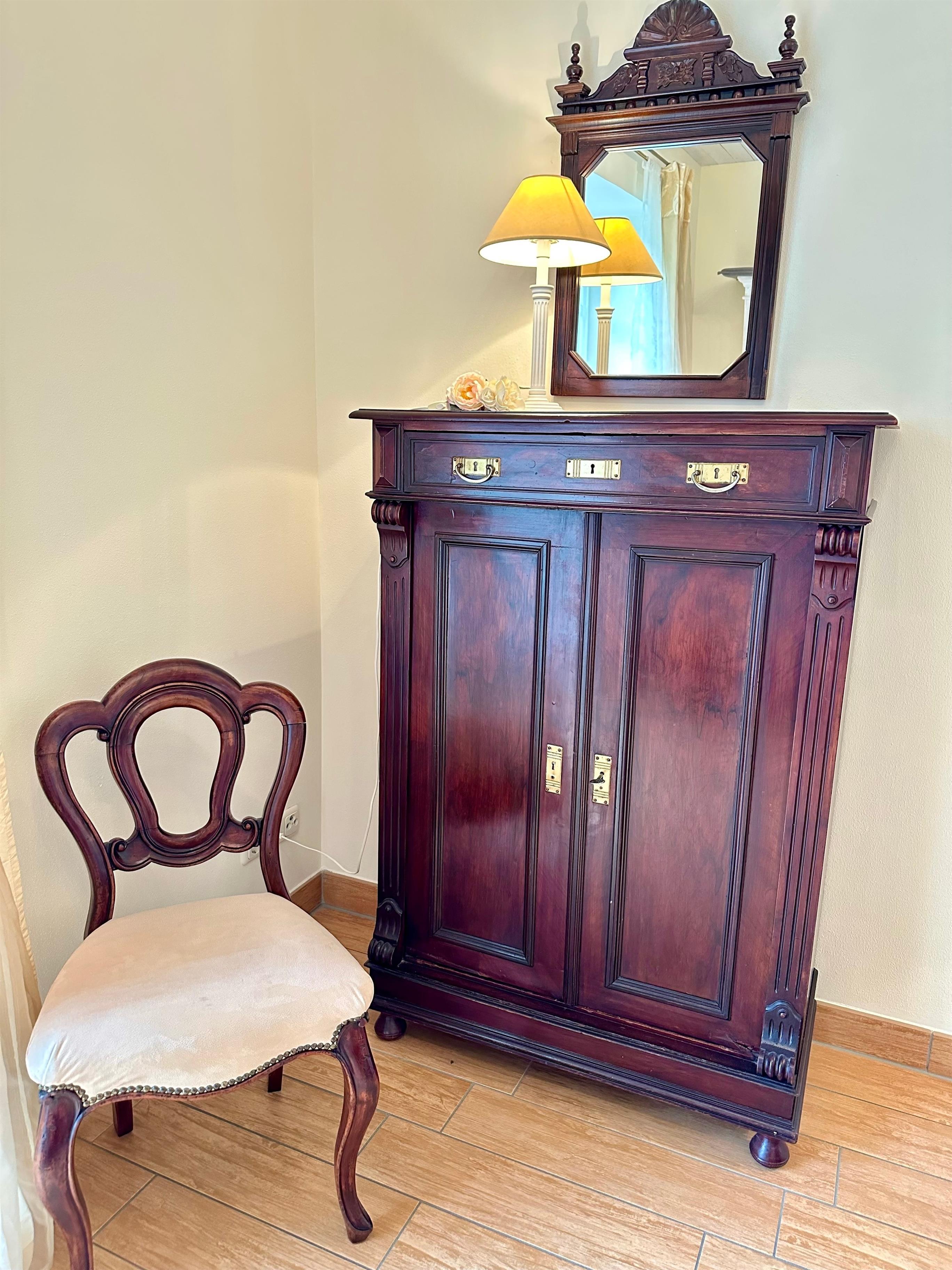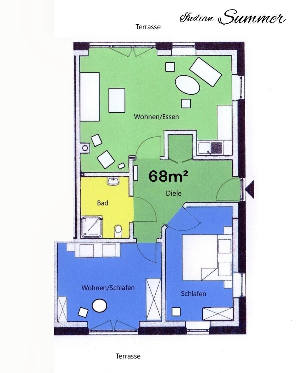 Die 68 m2 große Ferienwohnung 'Indian Summer' ist für bis zu 4 Personen eingerichtet. Die Wohnung besteht aus einem großzügigen Wohnraum mit Kamin. Eine nostalgische Essecke und eine Landhausküche im mediterranen Stil bieten die Möglichkeit zum gemeinsamen Kochen und gemütlichen Beisammensein. Die Sonne verzaubert die zwei Schlafräume, die gen Osten liegen, mit Ihrem morgendlichen warmen Licht. Sie sind mit einem Doppelbett und einem hochwertigen, ausziehbaren Schlafsofa (1,60 x 2,00 m) eingerichtet. Ein elegantes Badezimmer mit ebenerdiger Dusche lädt zum Verweilen ein. Zwei großzügig angelegte Terrassen mit Strandkorb und weiteren Sitzgelegenheiten locken Sie hinaus in die Natur. Warme Farbtöne und edle Stoffe geben der Wohnung Ihren Charme.