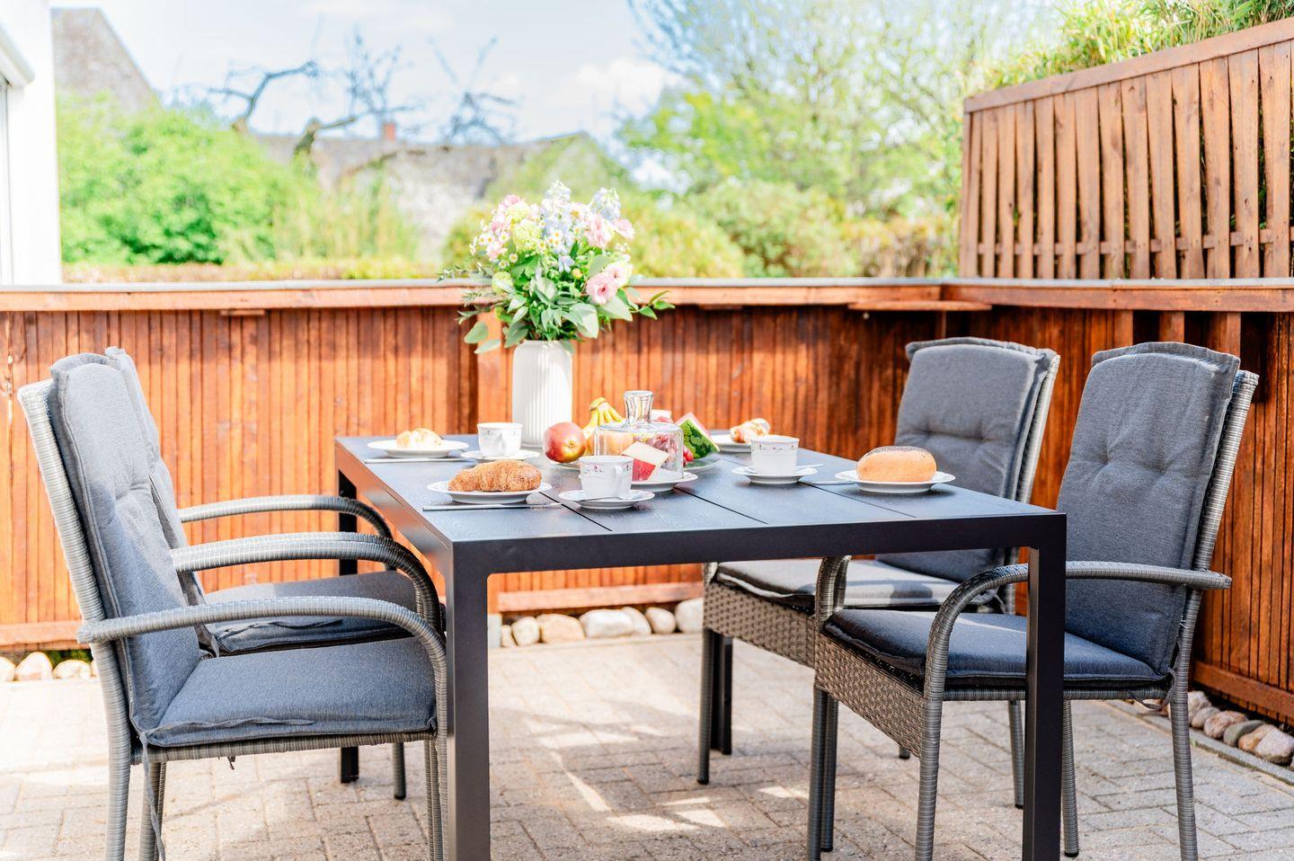 Genießt die frische Landluft auf der großzügigen Terrasse, die perfekt zum Entspannen, Essen im Freien oder für