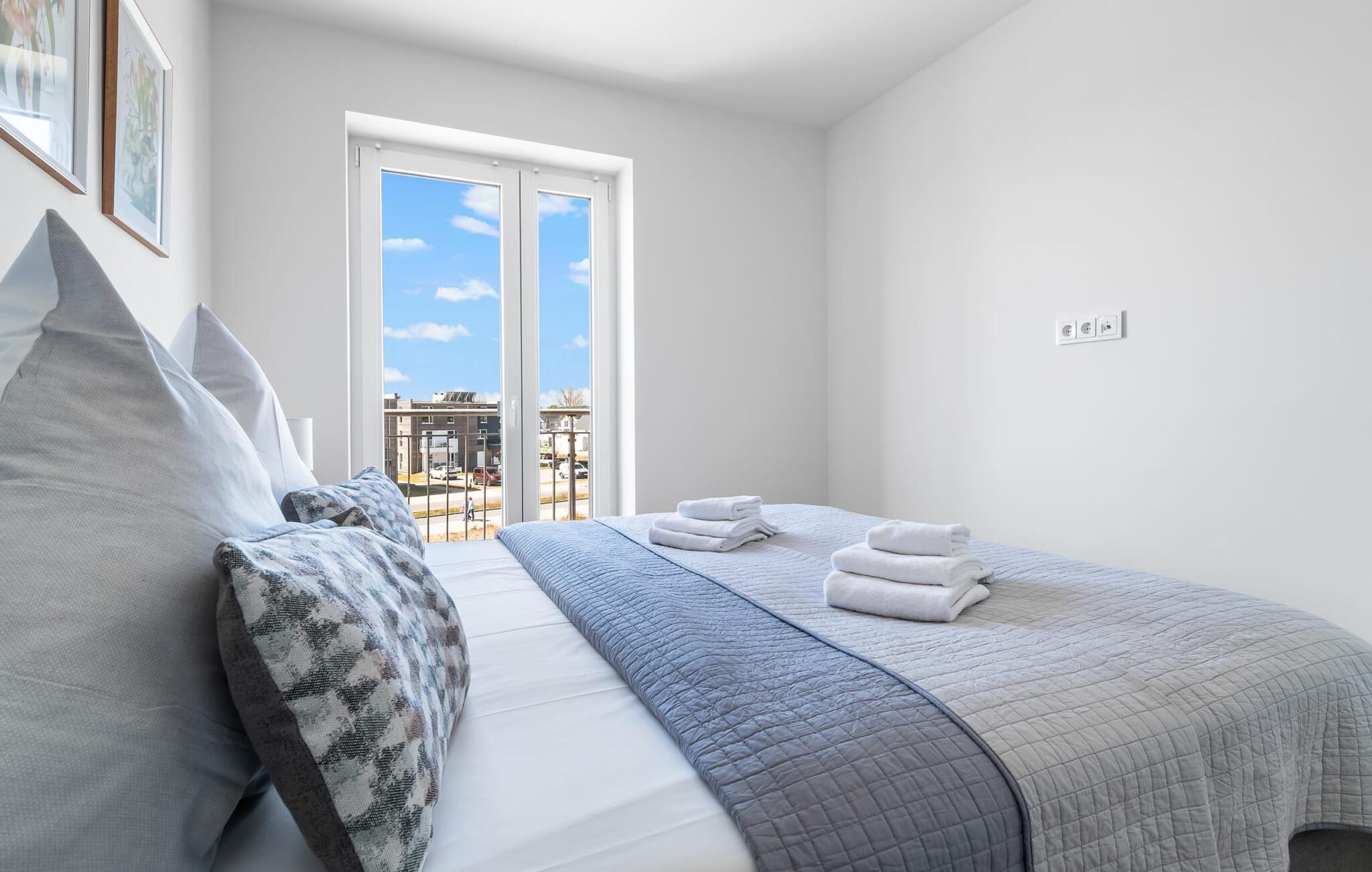 Das Hauptschlafzimmer bietet ein Doppelbett, das zweite Schlafzimmer ist mit zwei Einzelbetten ausgestattet. Ein weiterer Schlafplatz steht auf dem Schlafsofa im Wohnzimmer zur Verfügung.