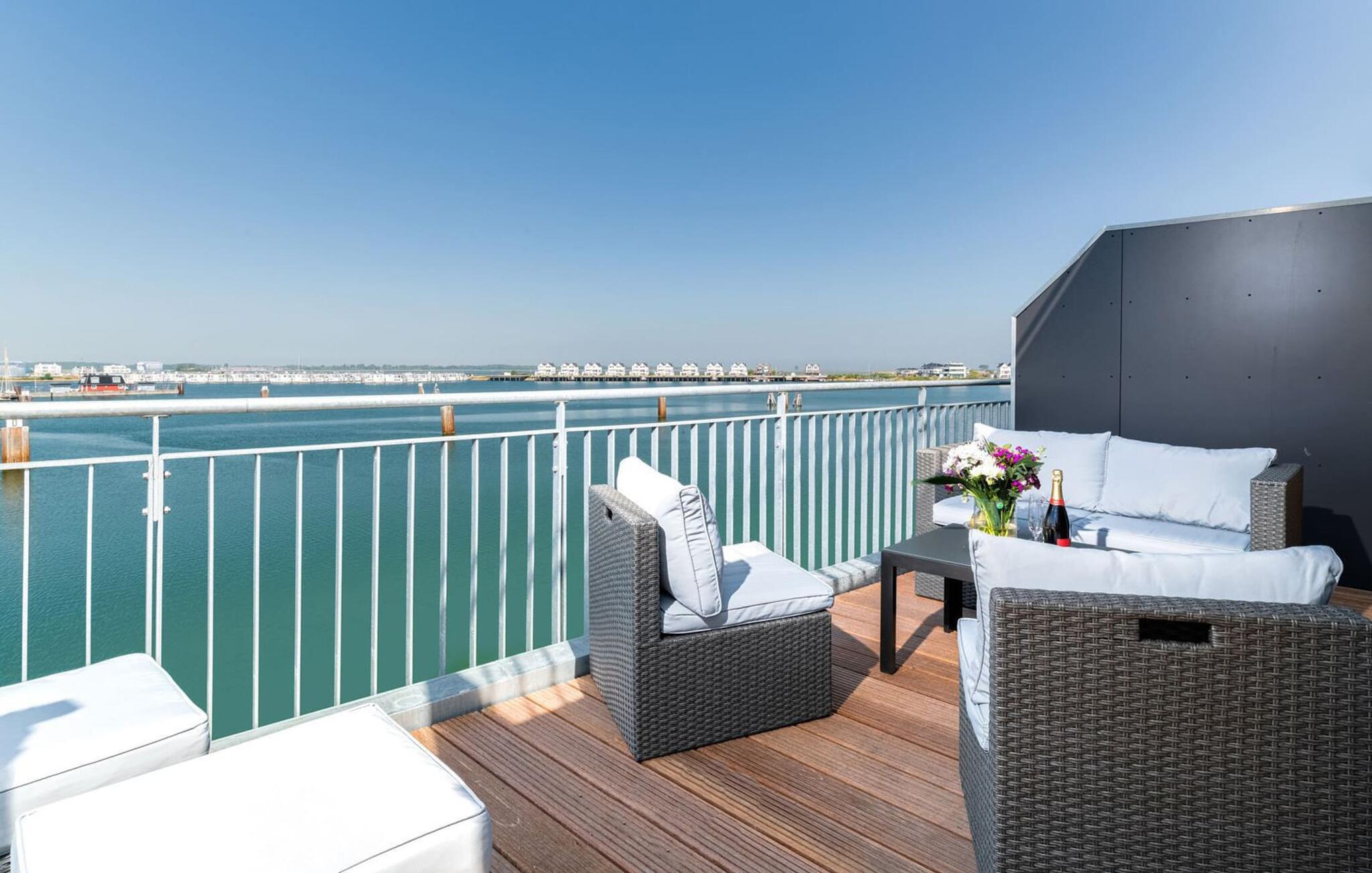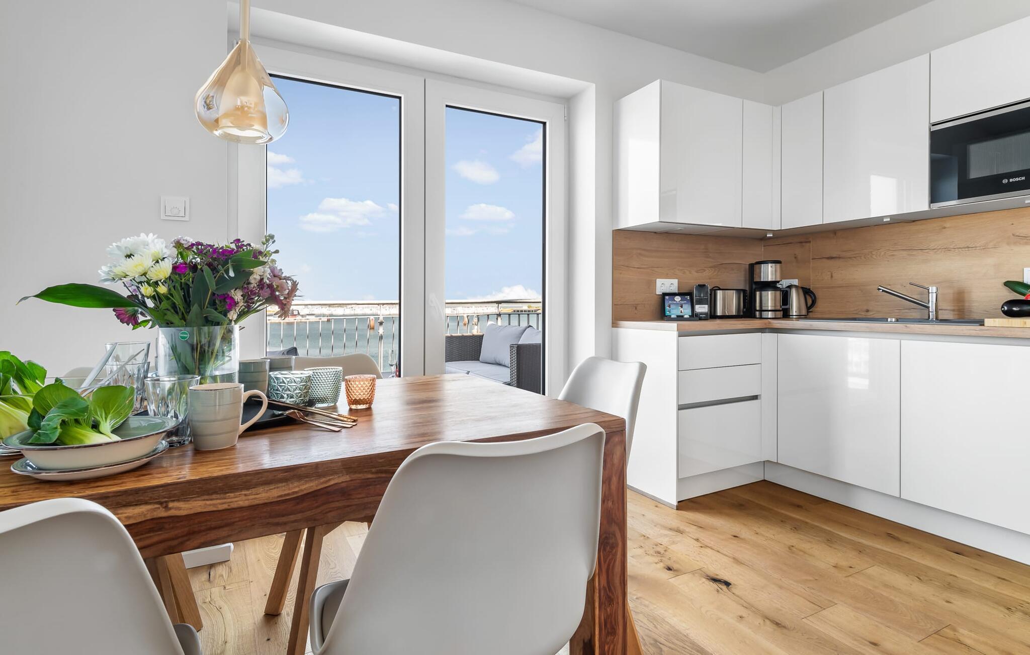 Der offene Wohn-/Essbereich mit integrierter, hochwertiger Einbauküche lässt die Herzen jedes Ostseeliebhabers höher schlagen. Von hier aus hat man einen unverwechselbaren Blick aufs Wasser und dank der Rundum-Terrasse mit südwest-Ausrichtung, die man übrigens von jedem Zimmer erreicht, den ganzen Tag Sonne.